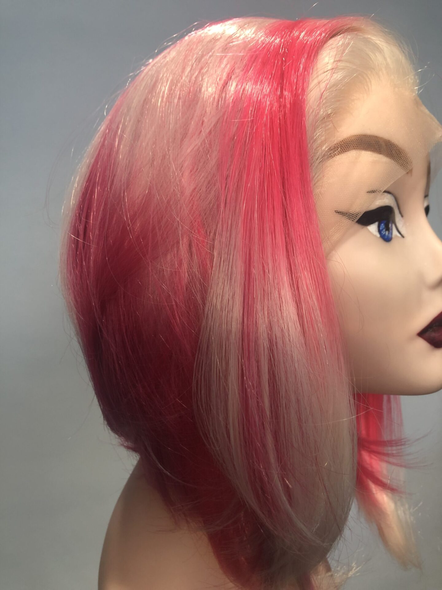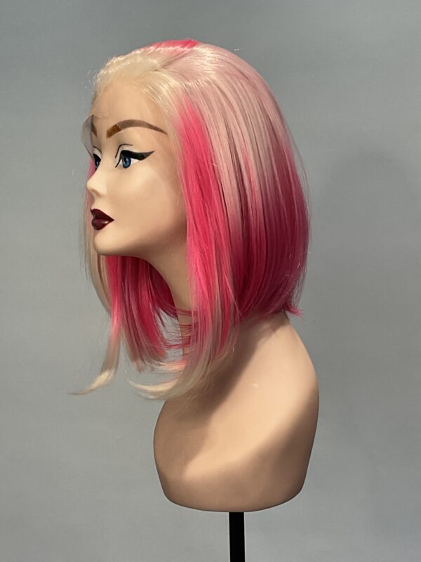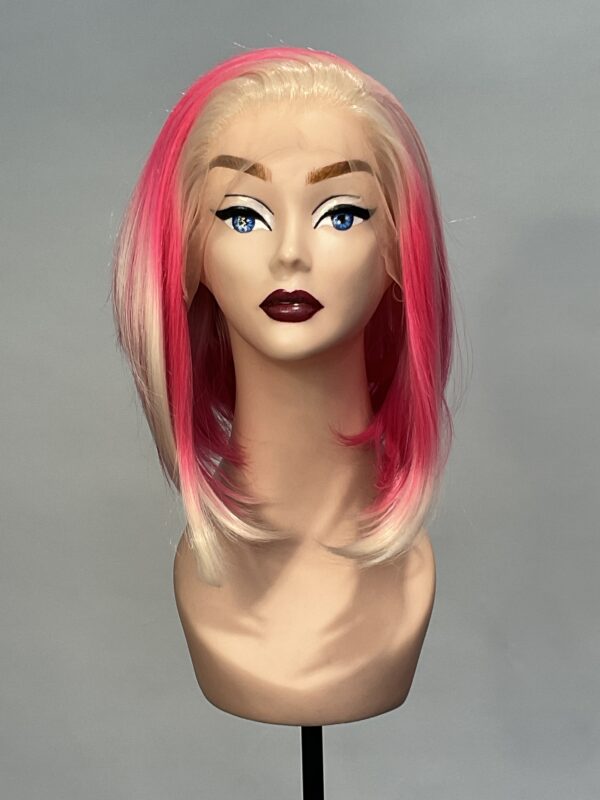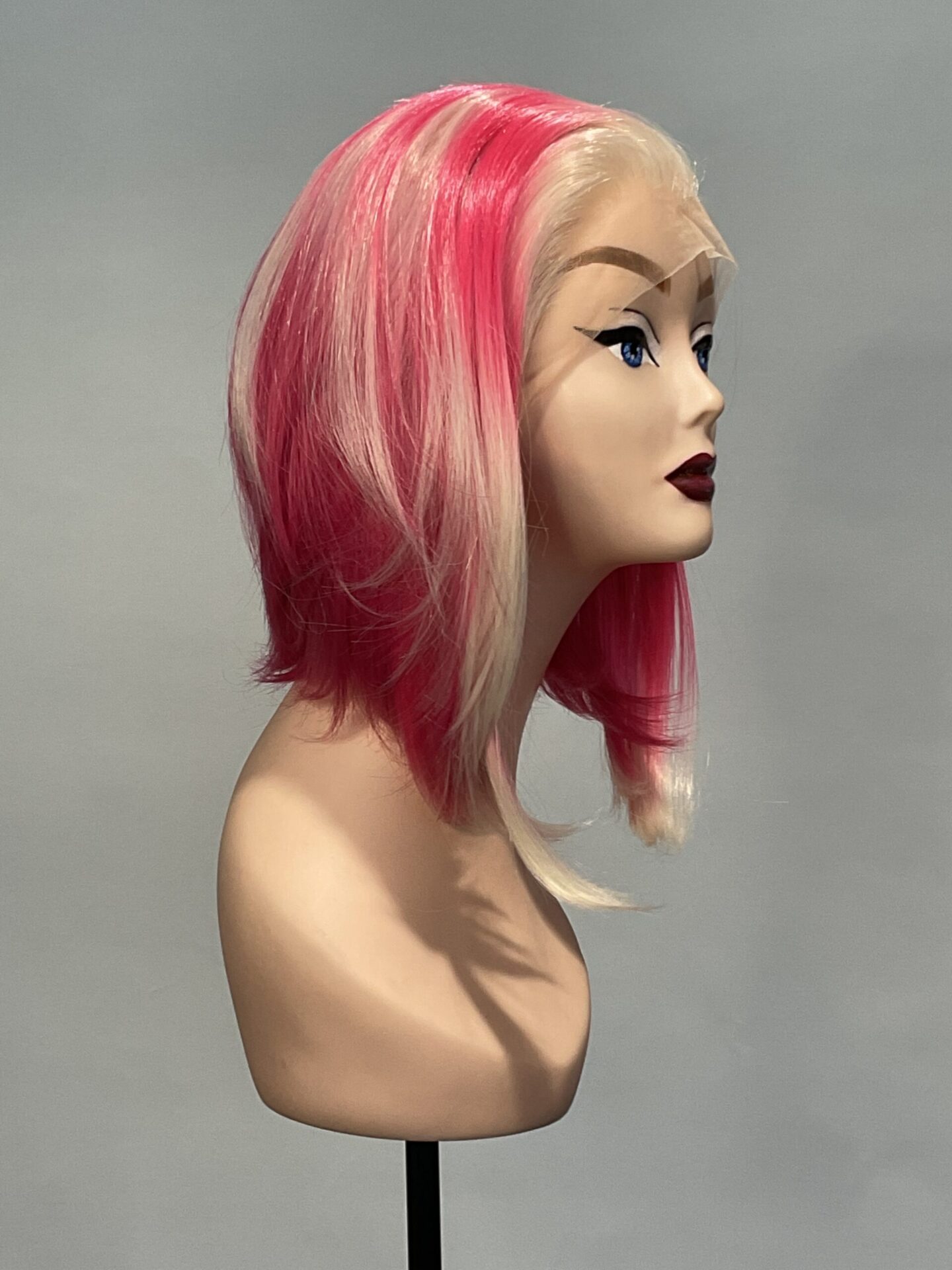 This is Aura. She is a blonde and pink candy cane style synthetic lace front wig, in a simple bob cut.