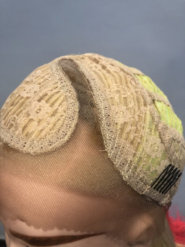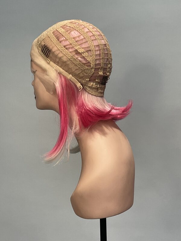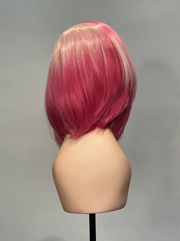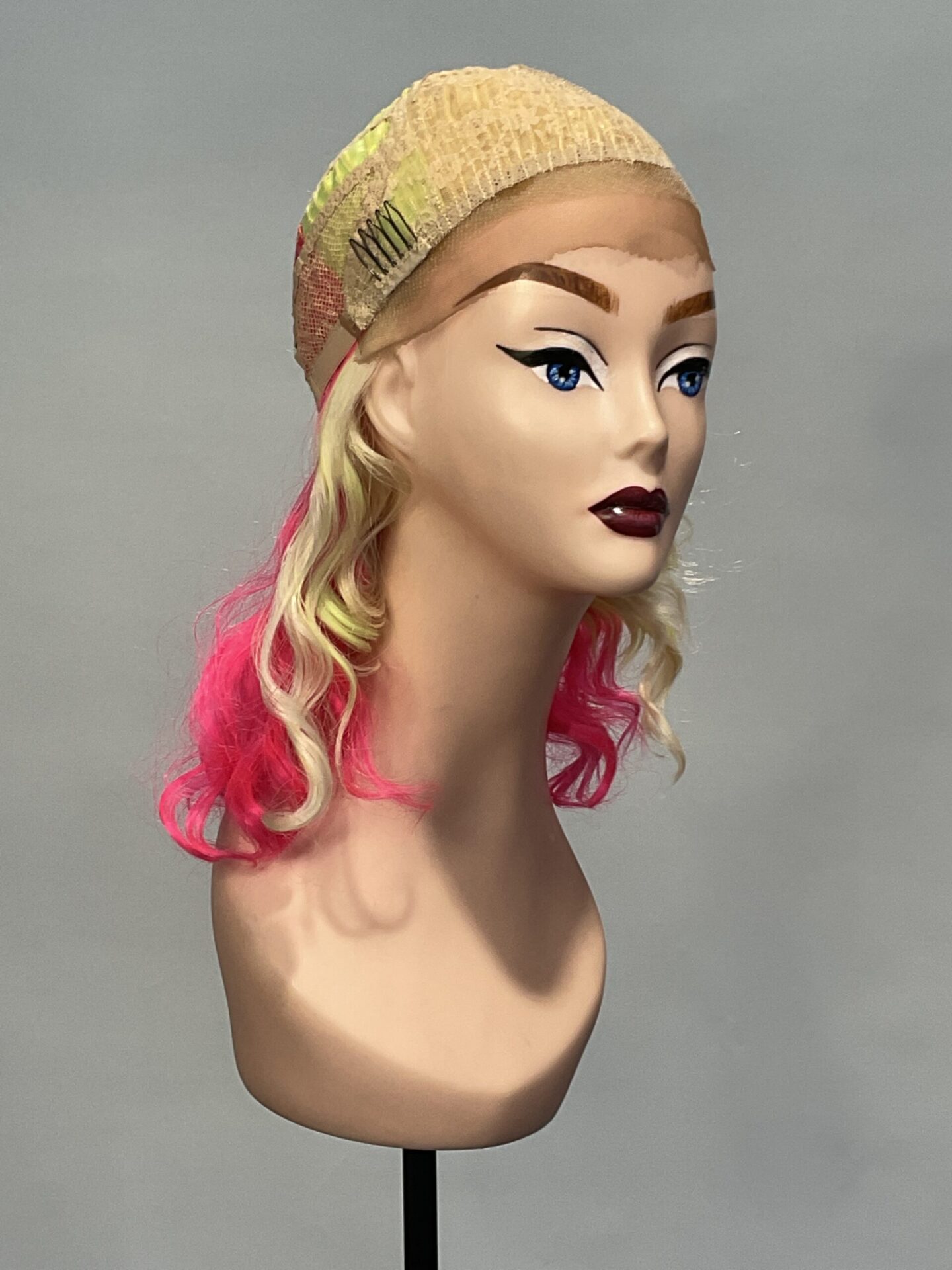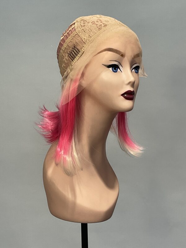 This is Aura. She is a blonde and pink candy cane style synthetic lace front wig, in a simple bob cut.