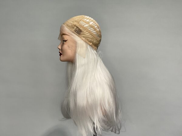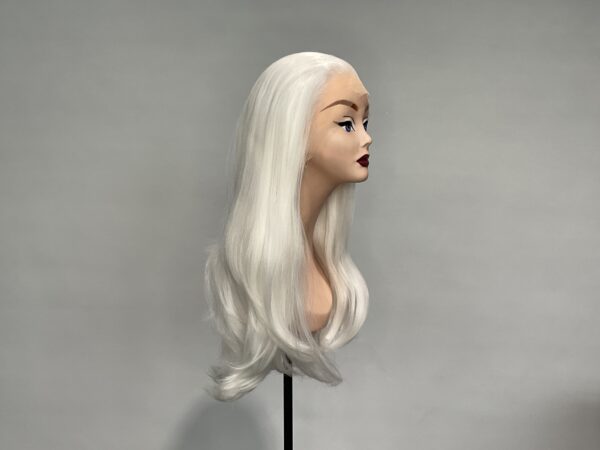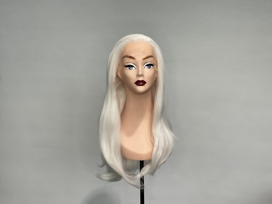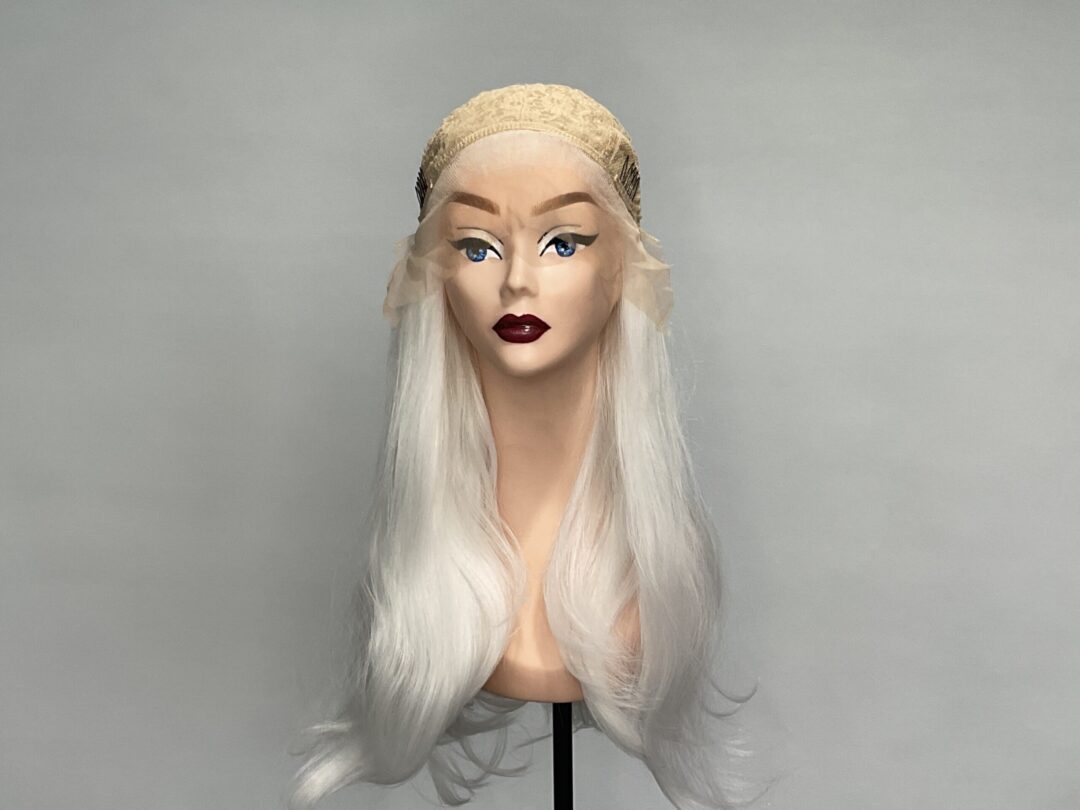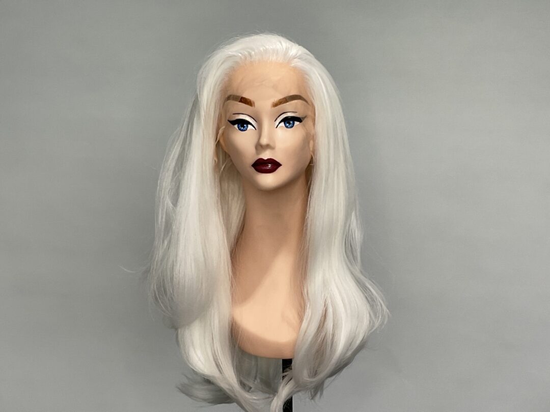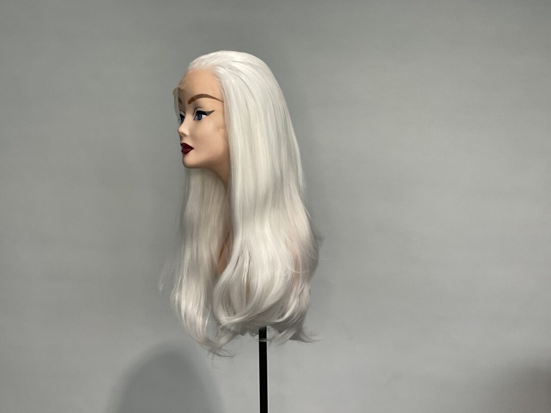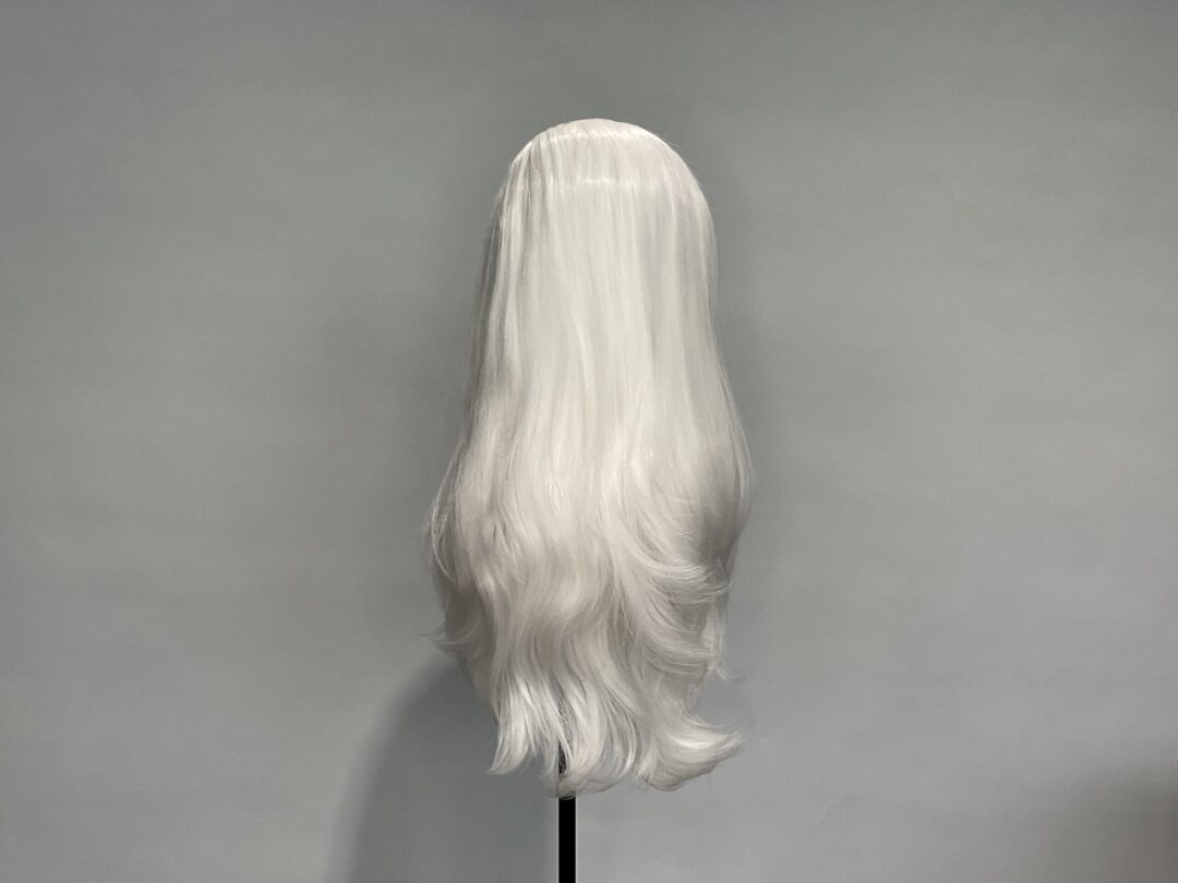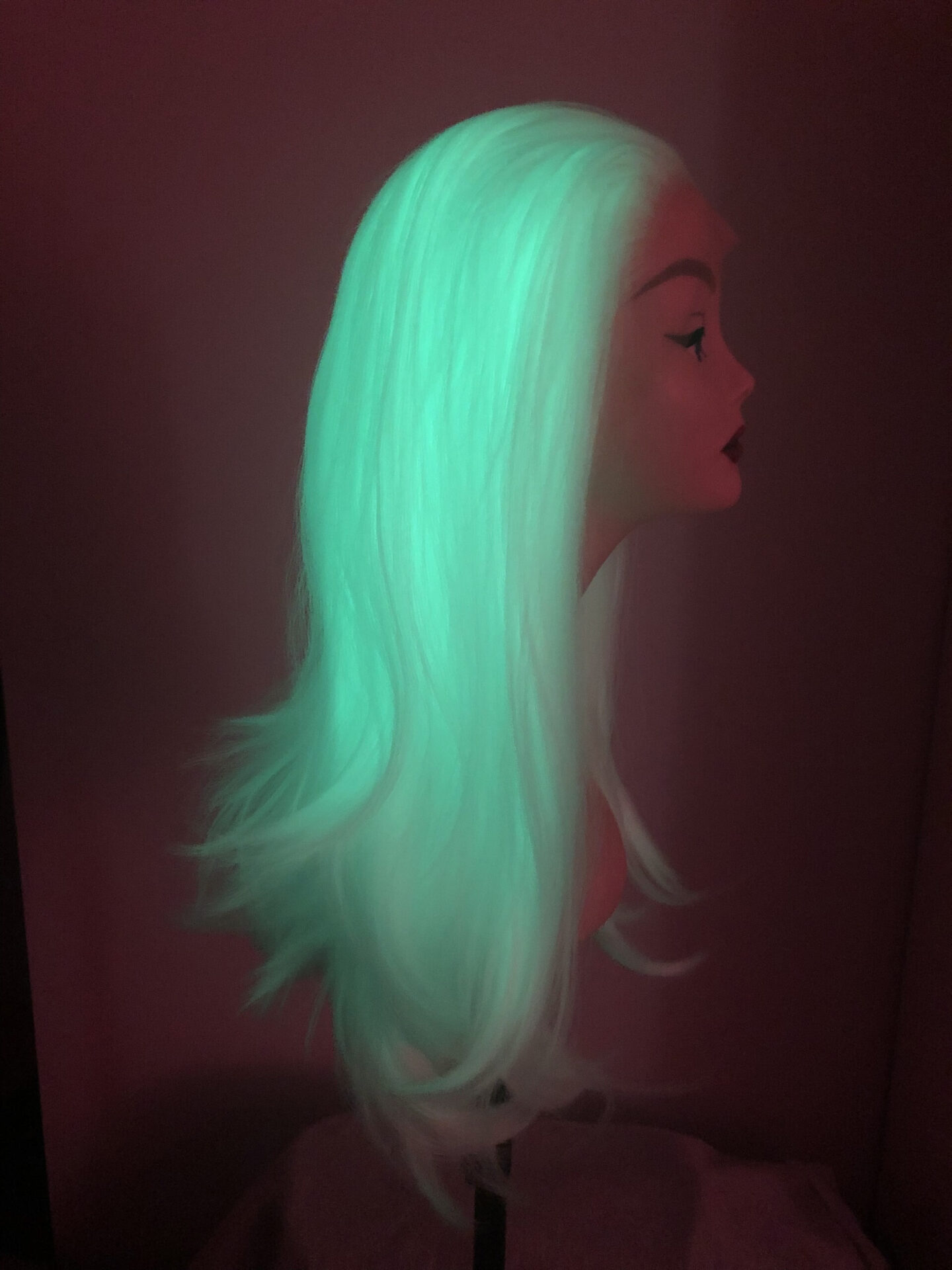 This is Aurora. She is a 22-24 inches long sleek half hand tied lace front wig with 1.5-2 inches lace parting space in pure white, that glows green in the dark. The lace is a transparent light beige, best suited for lighter skin but can be coloured with foundation. 150% density but nice and full.