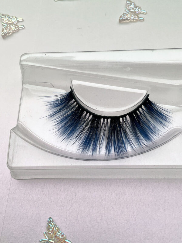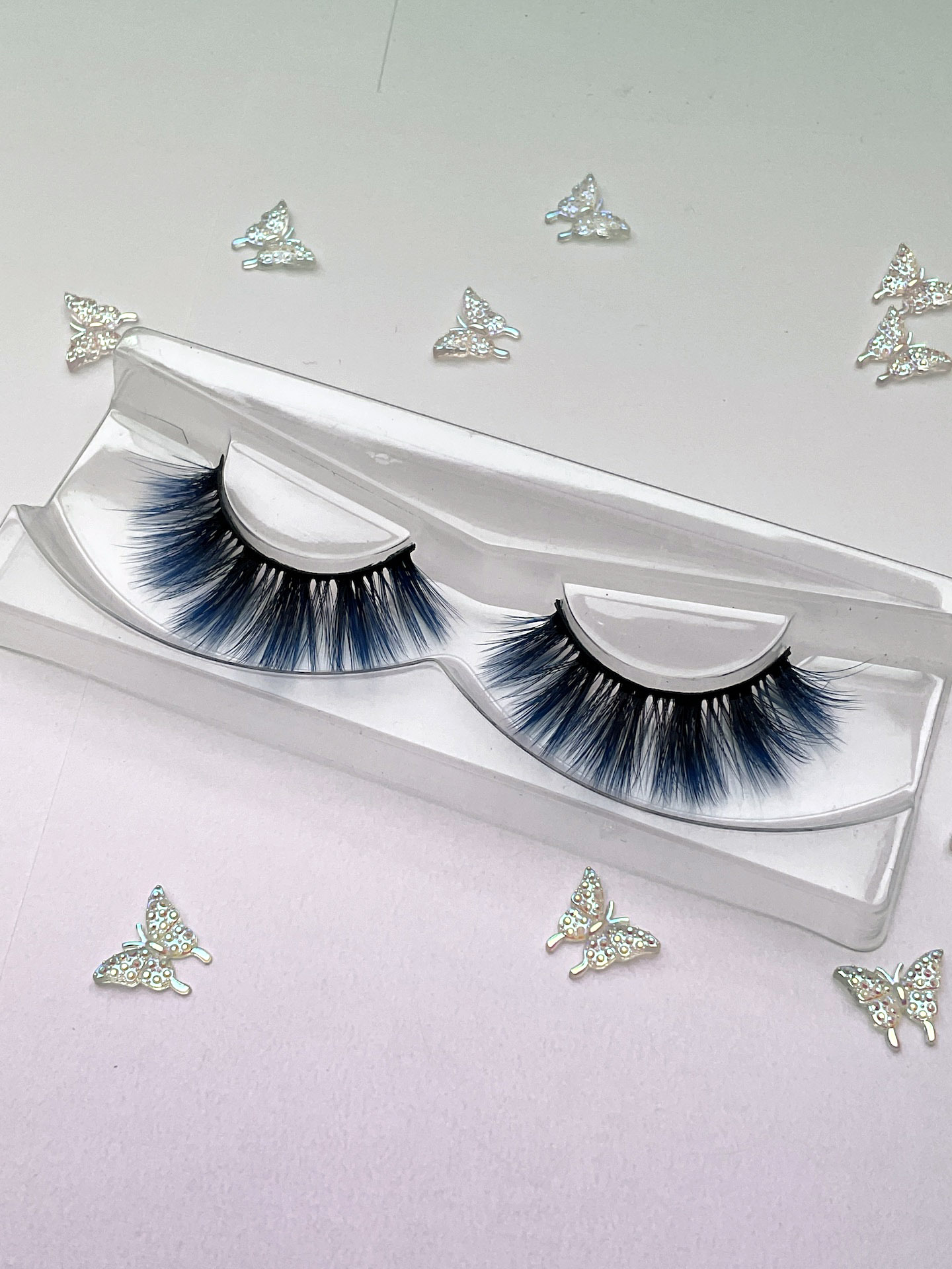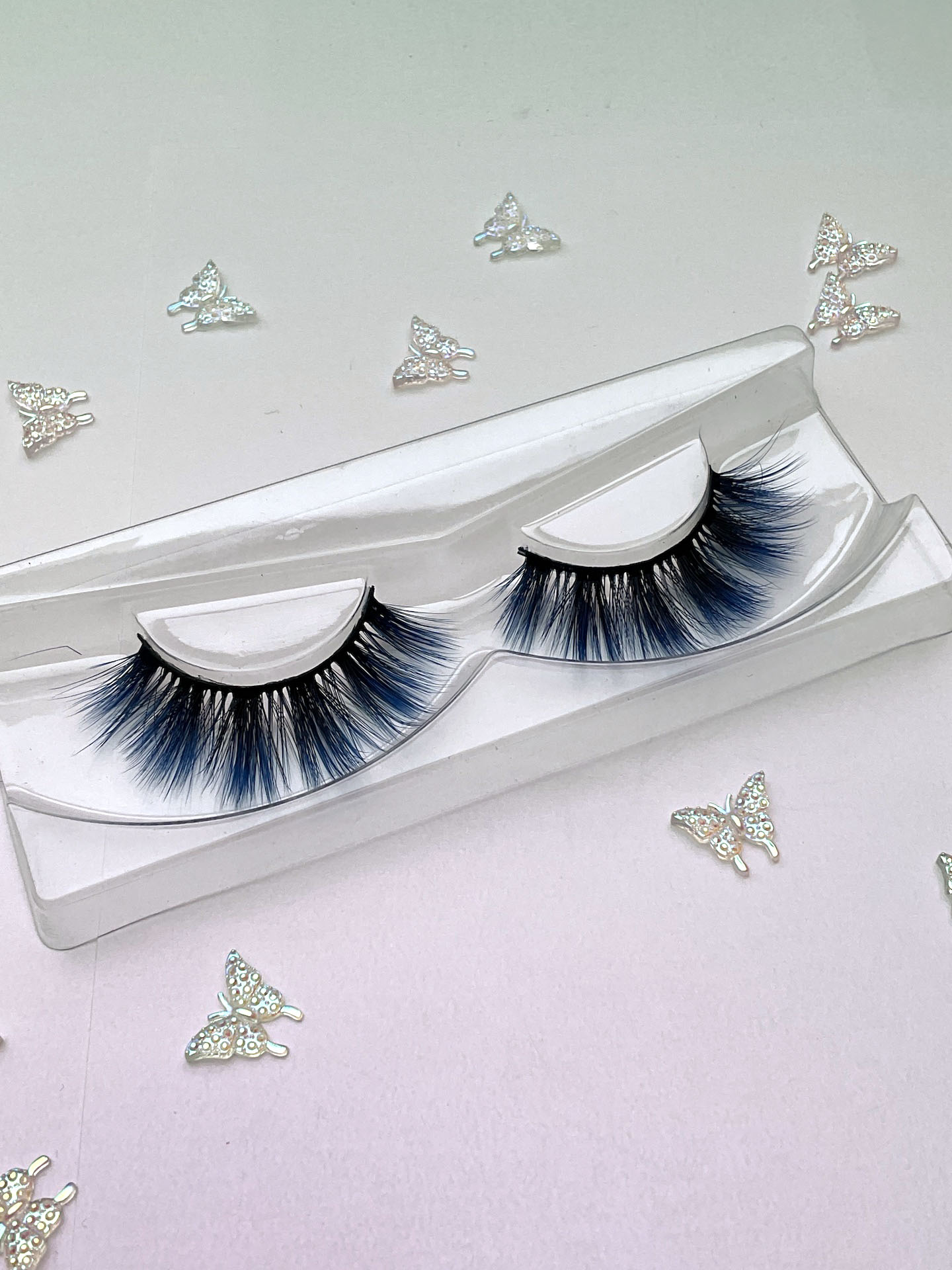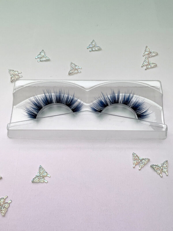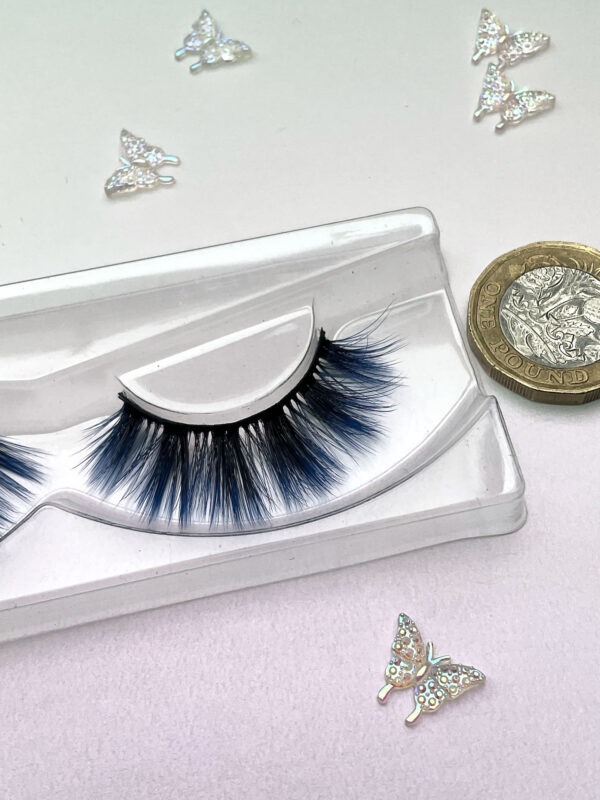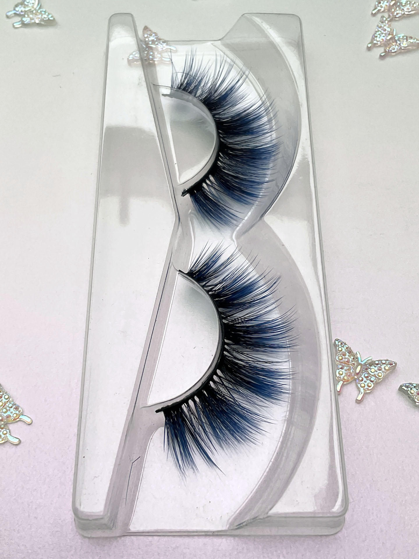 This is Bailey. She is one pair of fabulous 10-15mm false eyelashes, in black with blue tips.