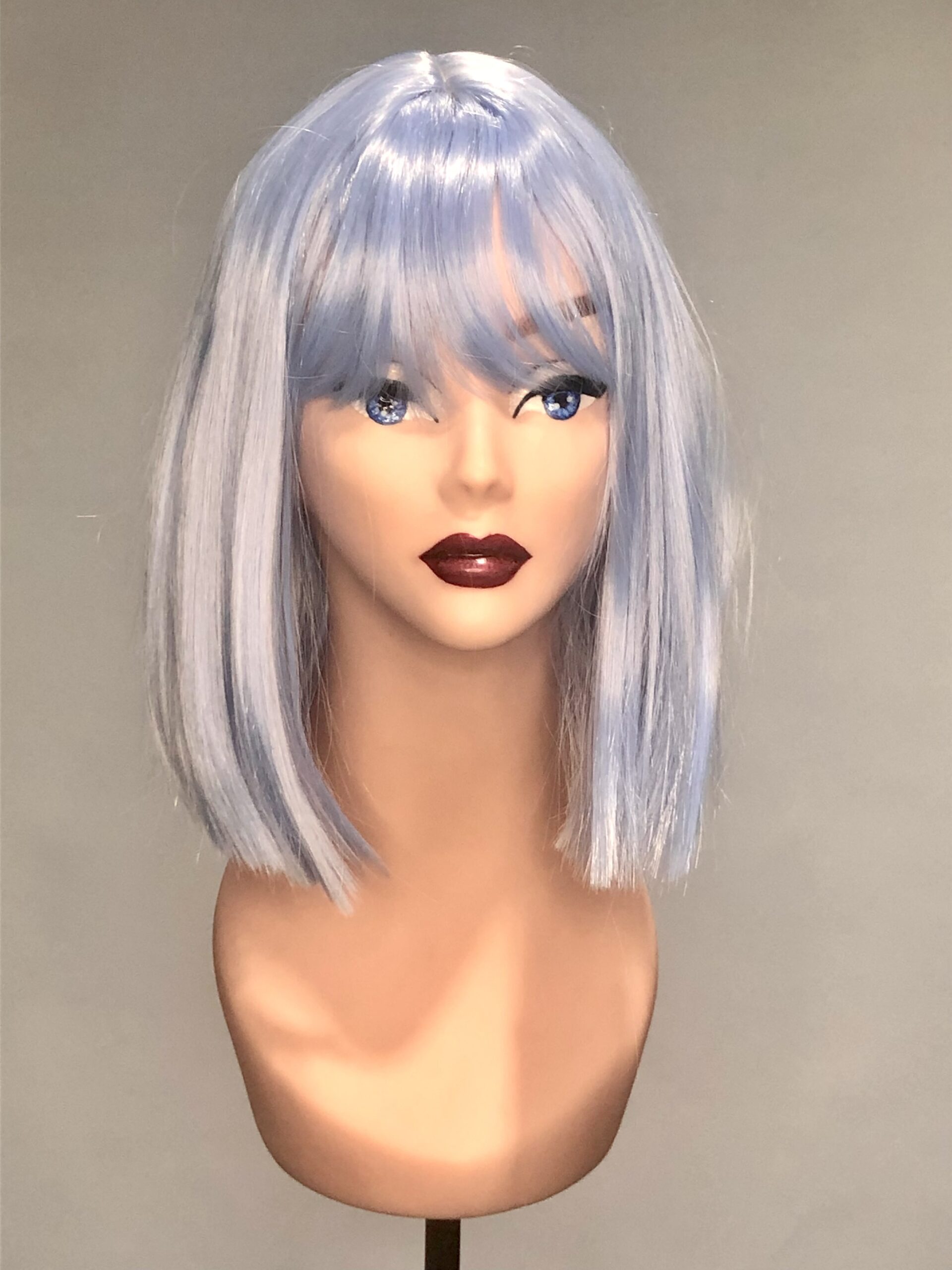 This is Betty Blue. She is a stylish and simple bob wig, just below the ear, with a fringe or bangs. Super cute, pretty much shake-n-go!