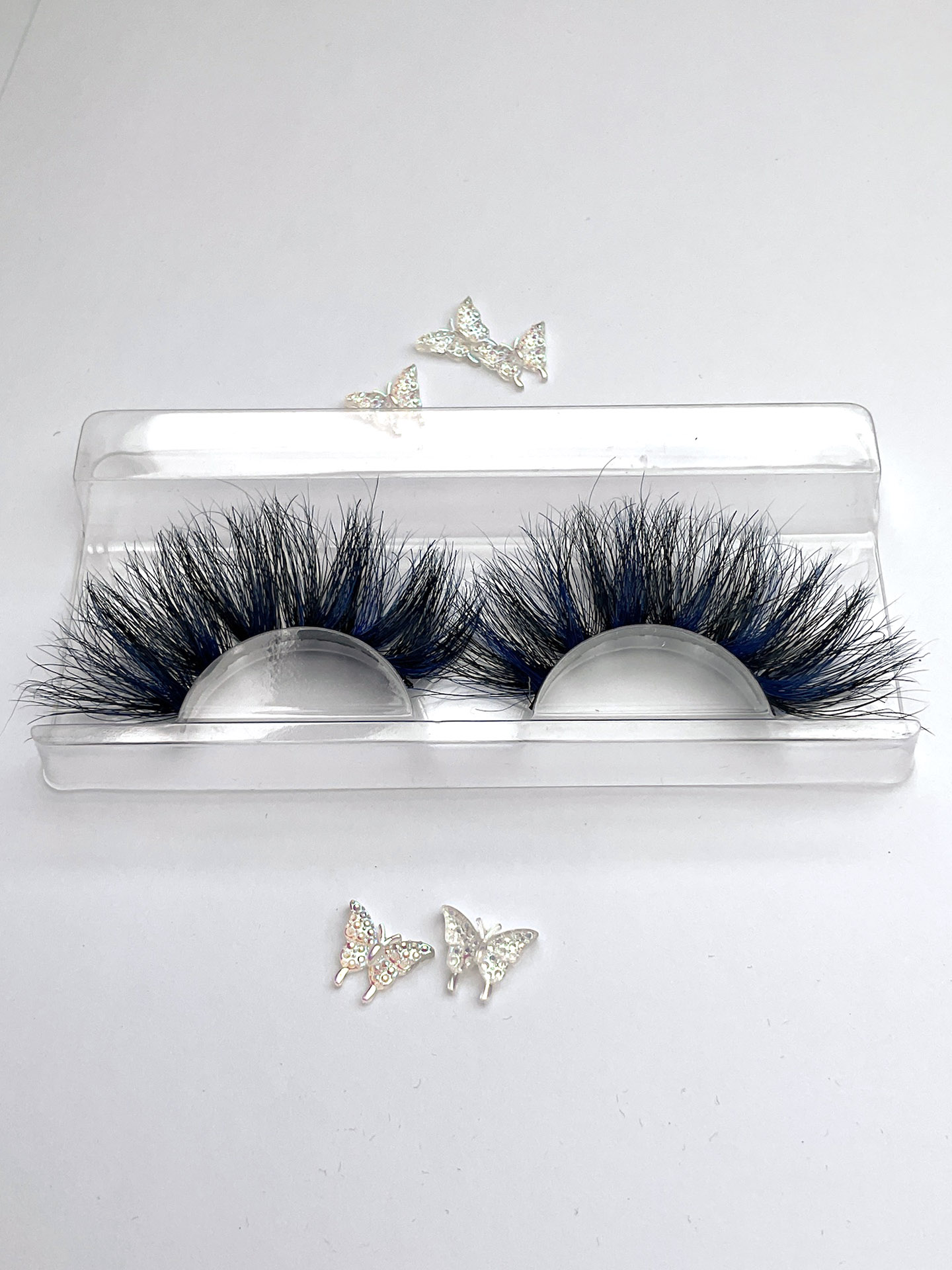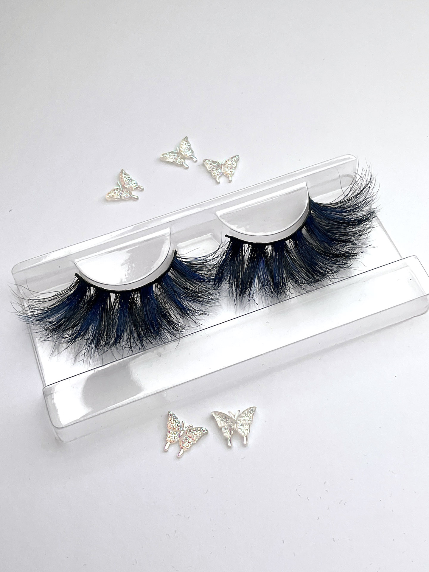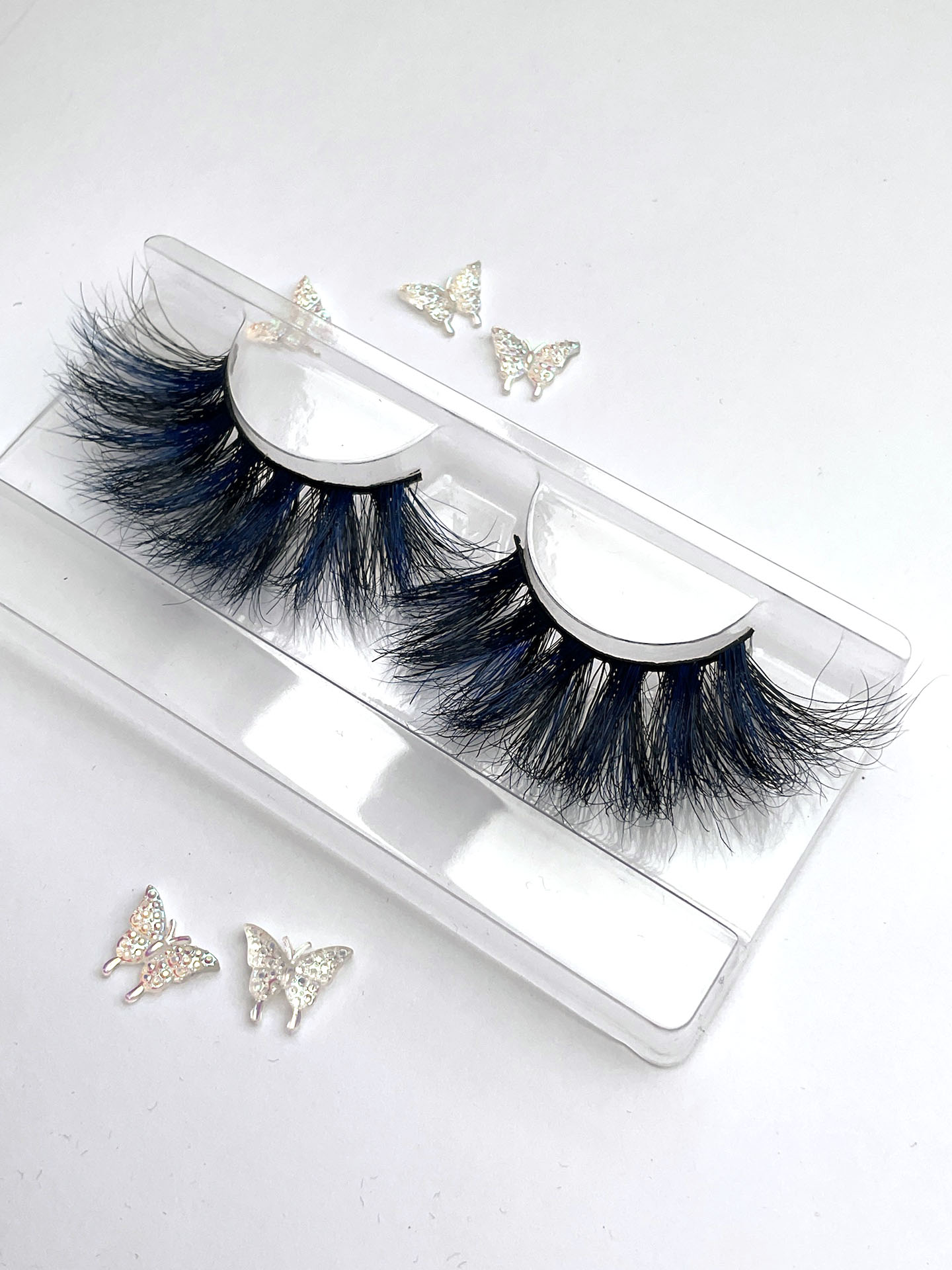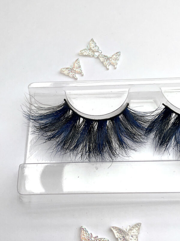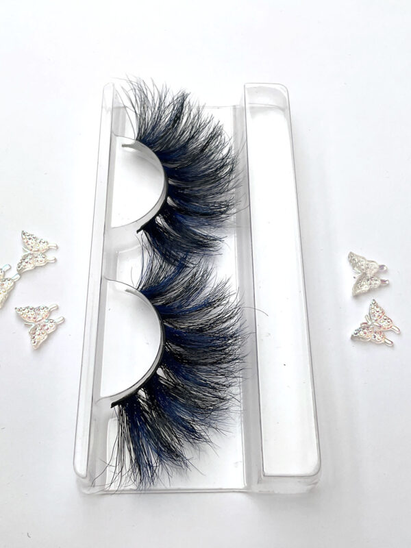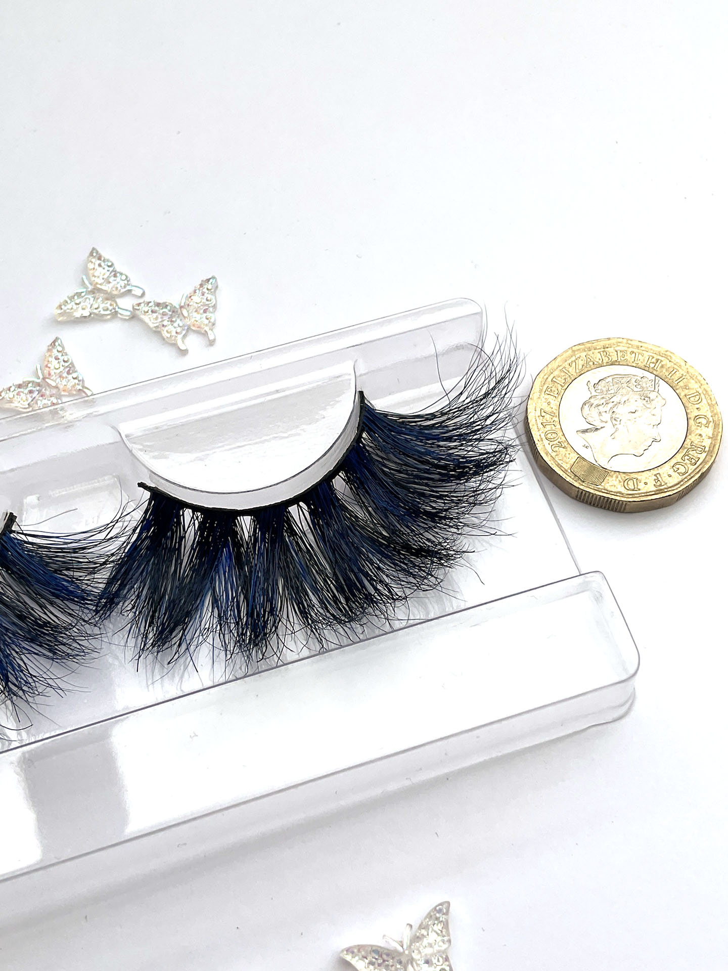 This is Blair. These are one pair of fabulous jumbo length false eyelashes, in black with blue details. 25mm long.