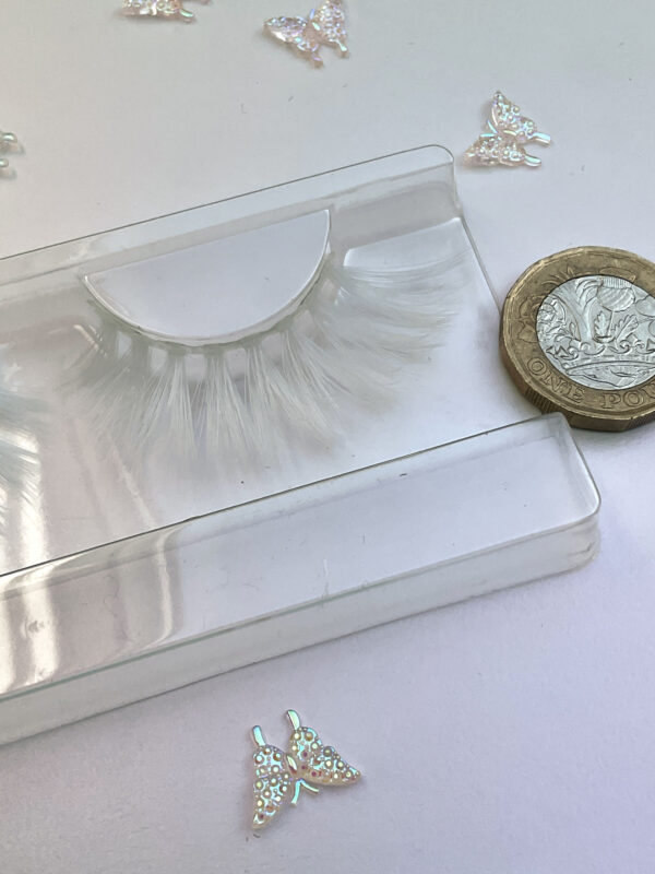 This is Boreal. She is a fuller pure white lash in a striped pattern, a great contrast lash, fab worn with blonde or white hair. Perfect for a wintery frozen look.