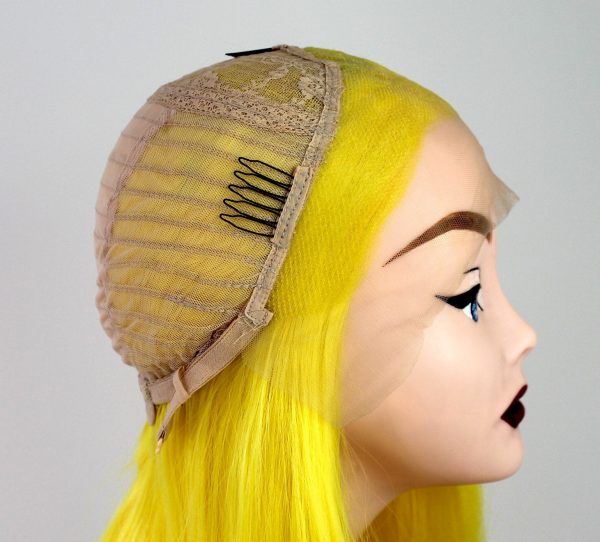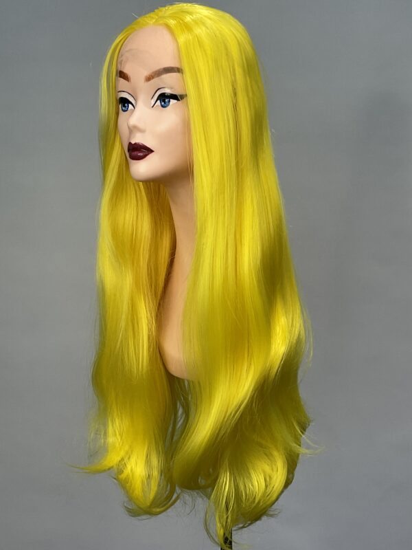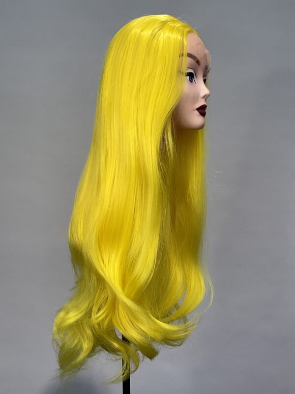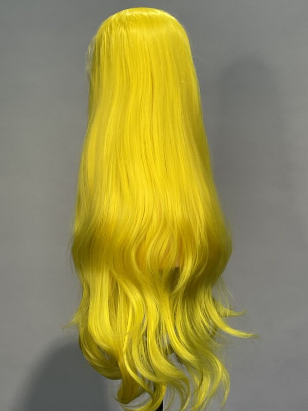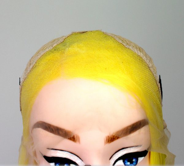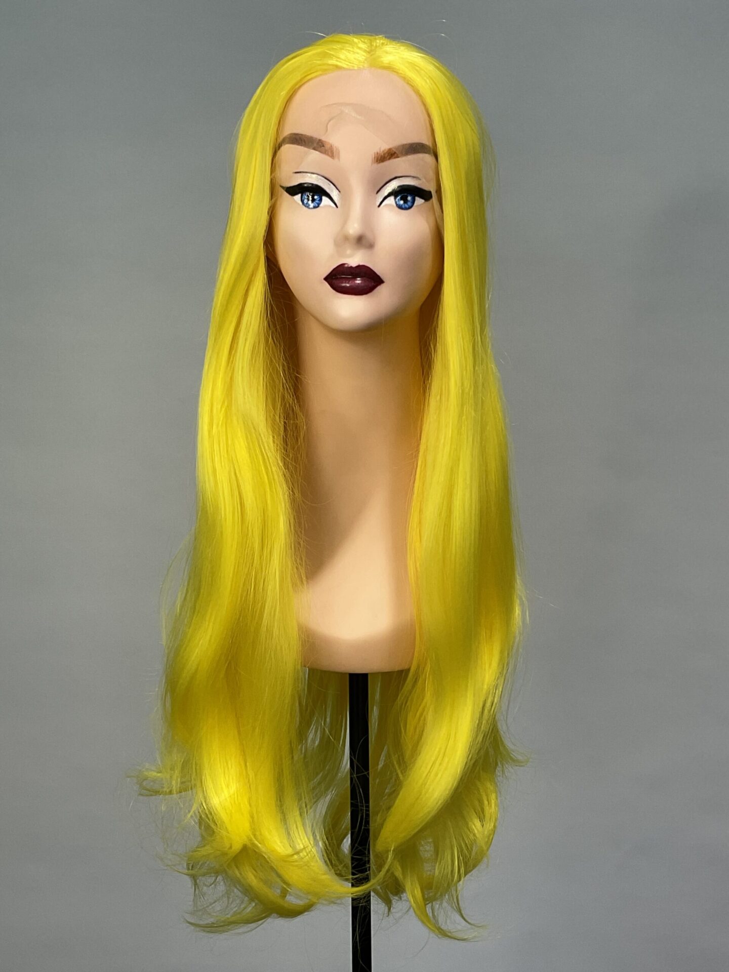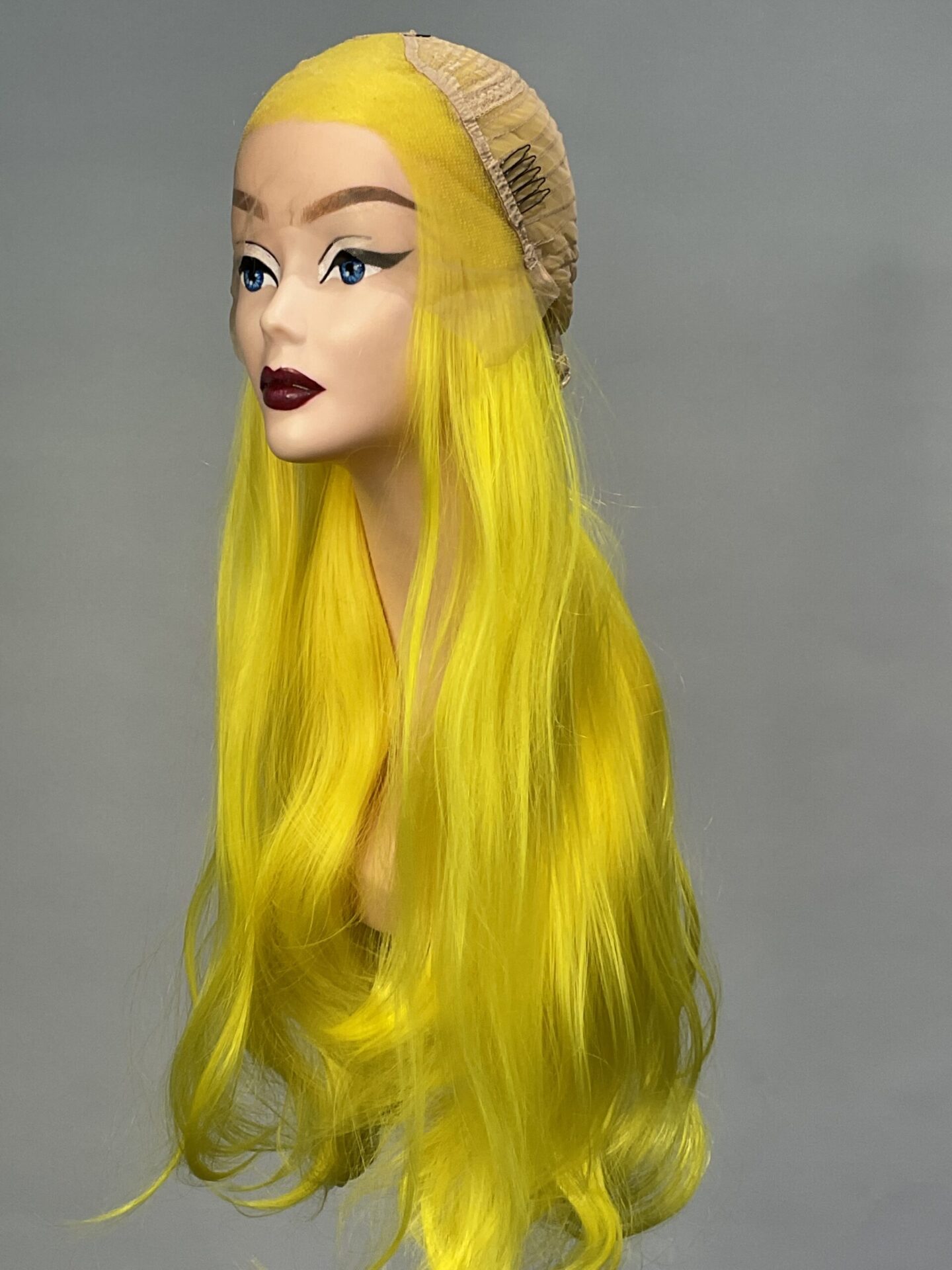 This is Bright Delight. She is a 24 inches long slightly wavy half hand tied lace front wig with 1.5-2 inches lace parting space in bright yellow, the colour itself is so bright it shines. The lace is a transparent light beige, best suited for lighter skin but can be coloured with foundation. 150% density but nice and full.