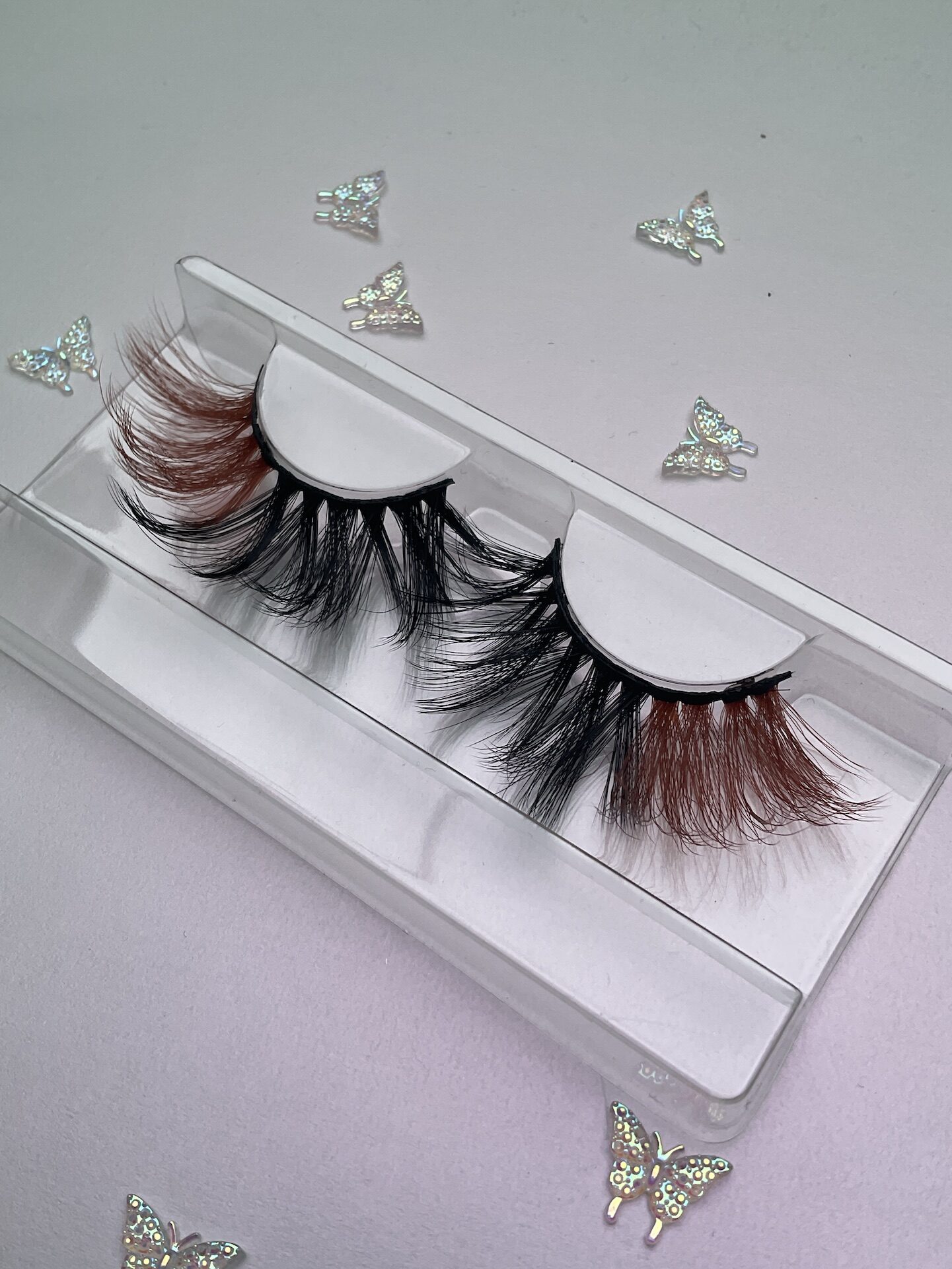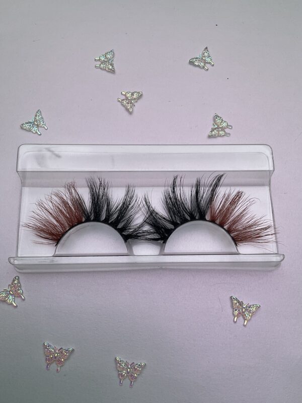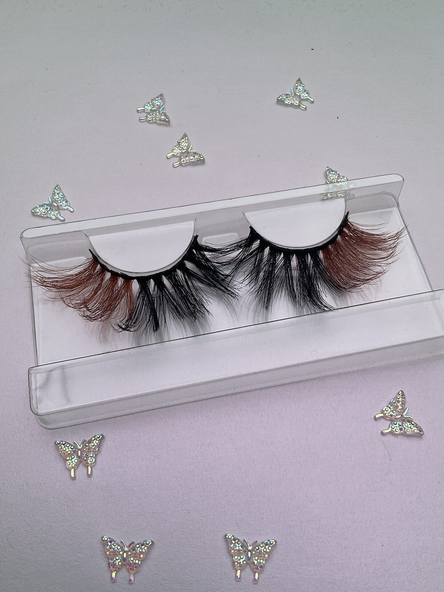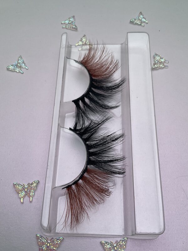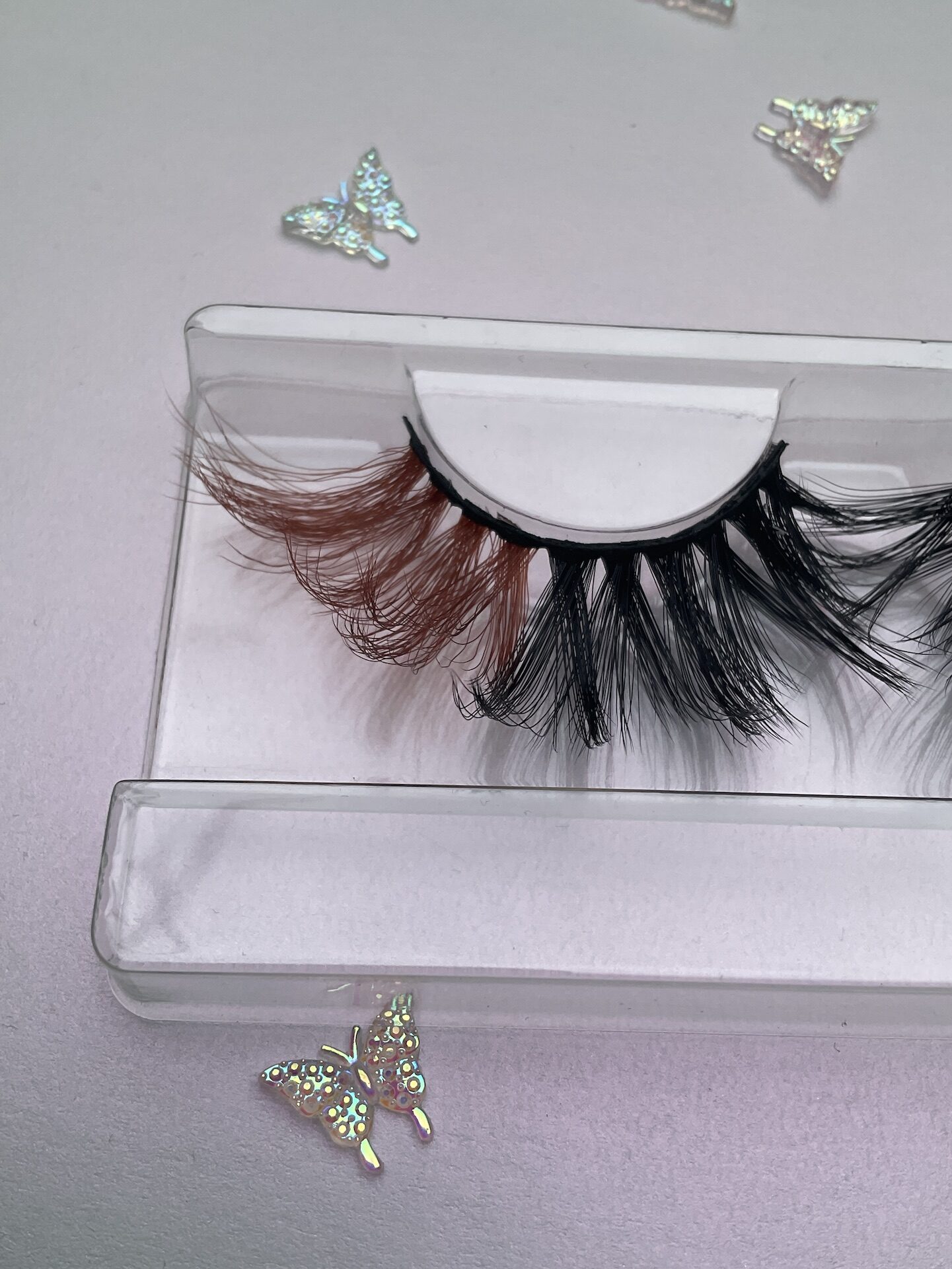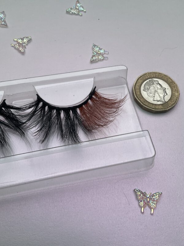 This is Chloe. She is one pair of fabulous 15-20mm false eyelashes, in black with a brown wing, the lash hairs positioned in a fan formation.