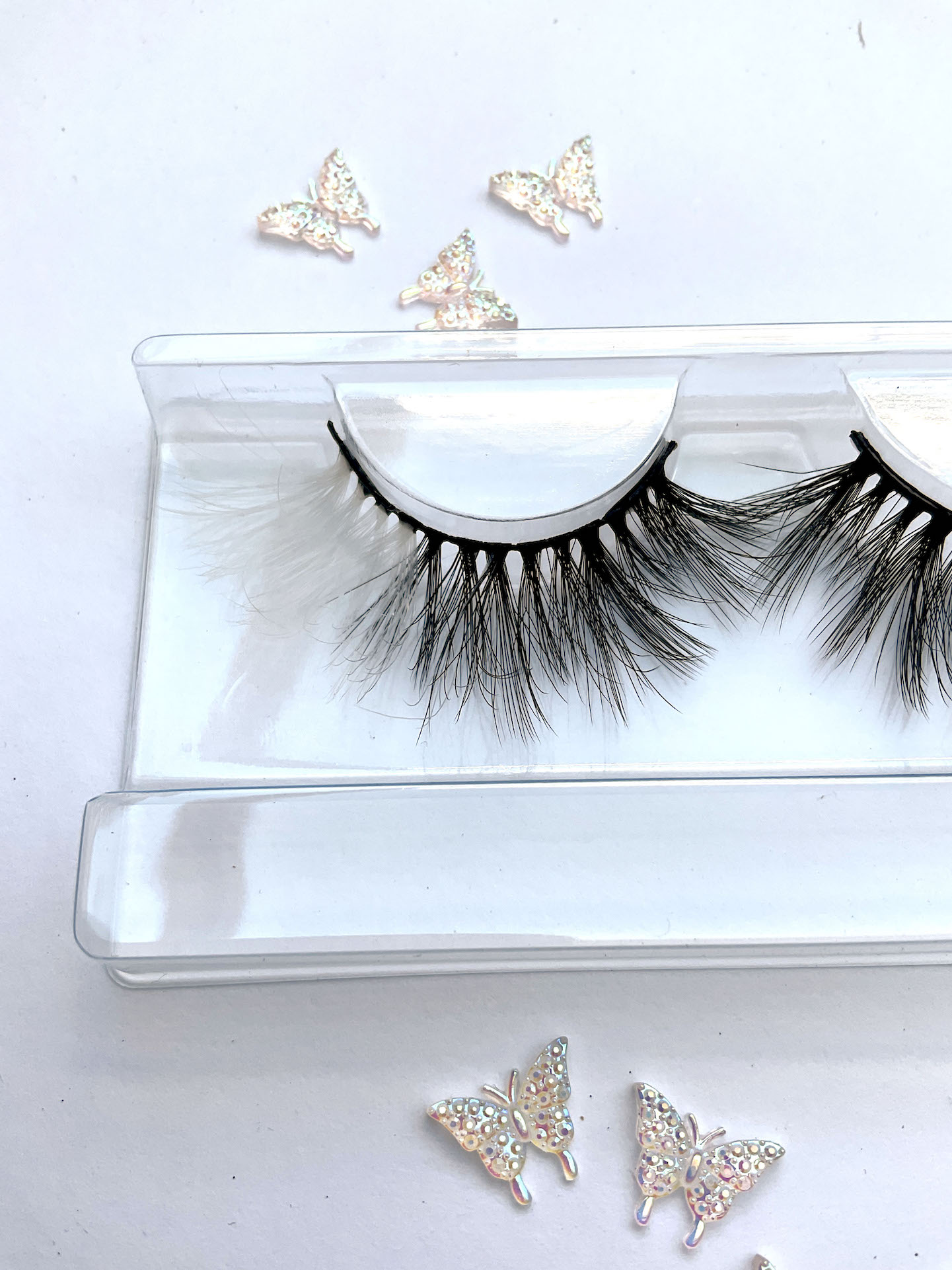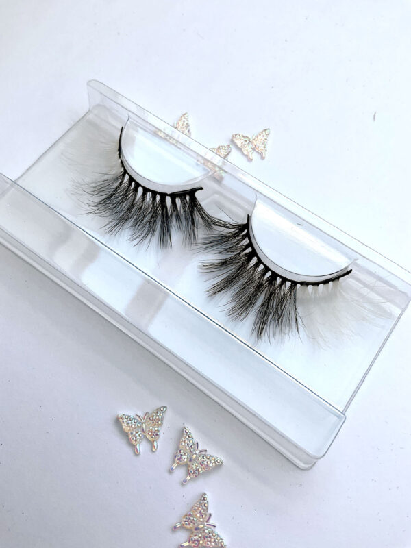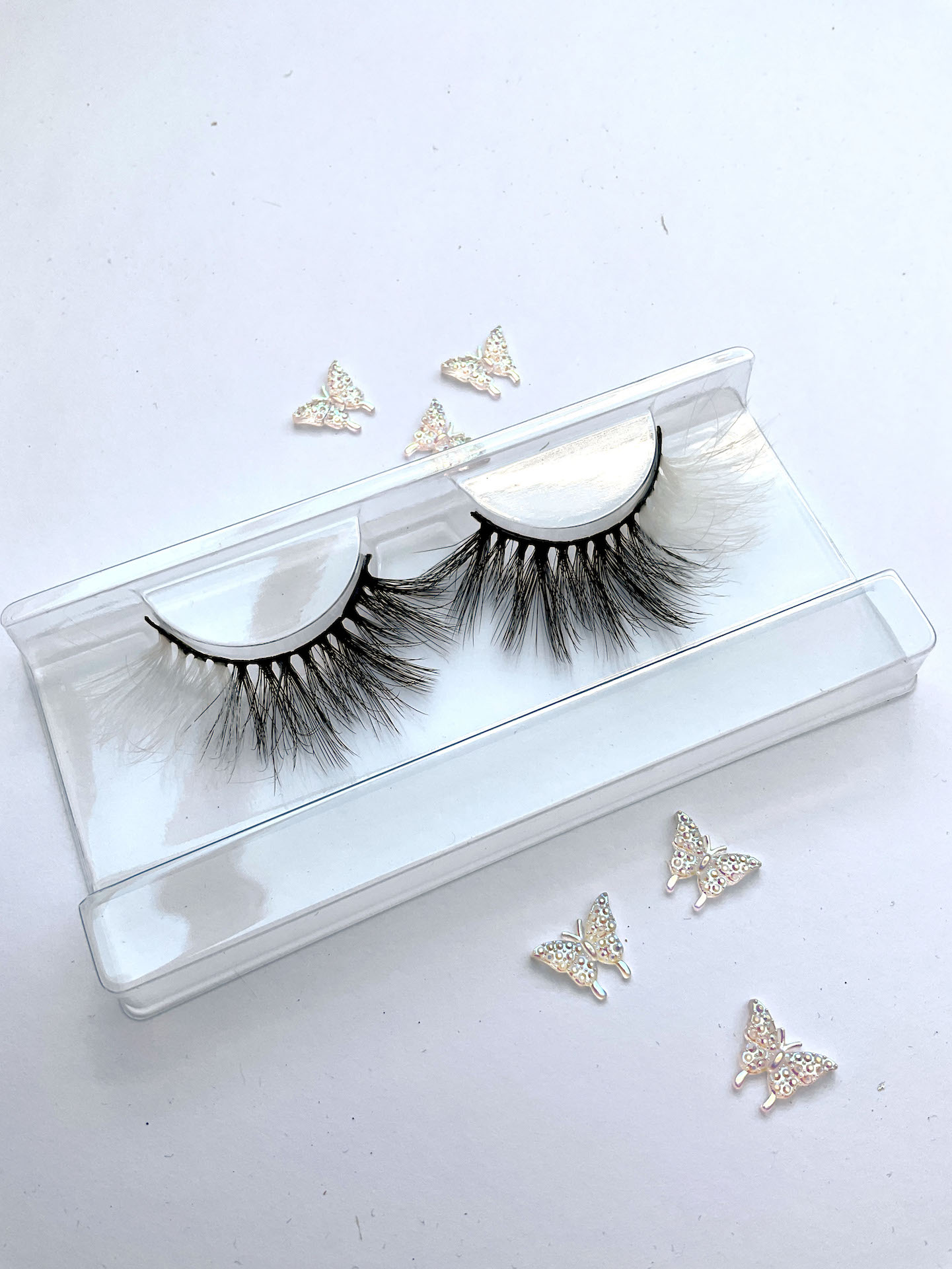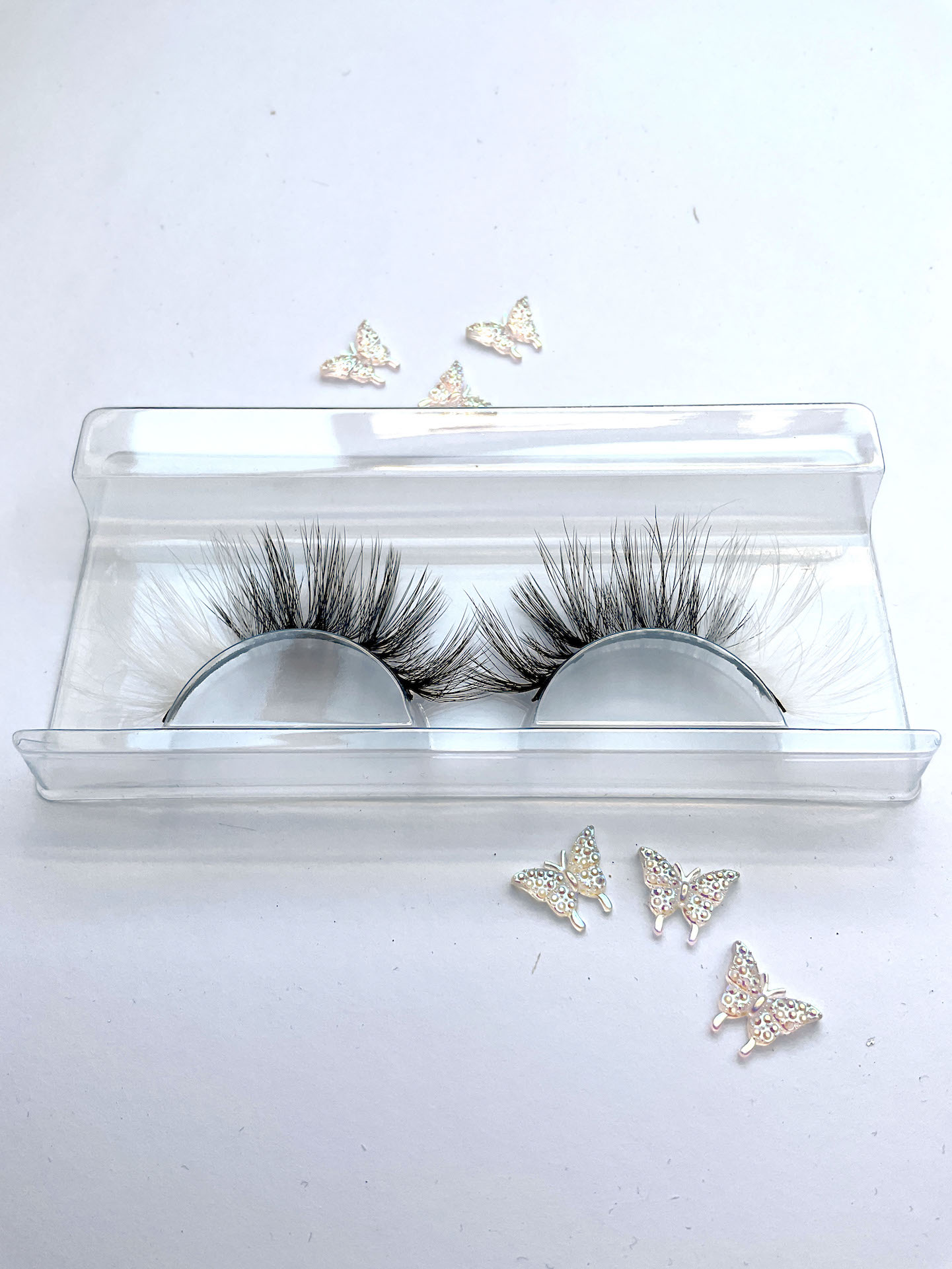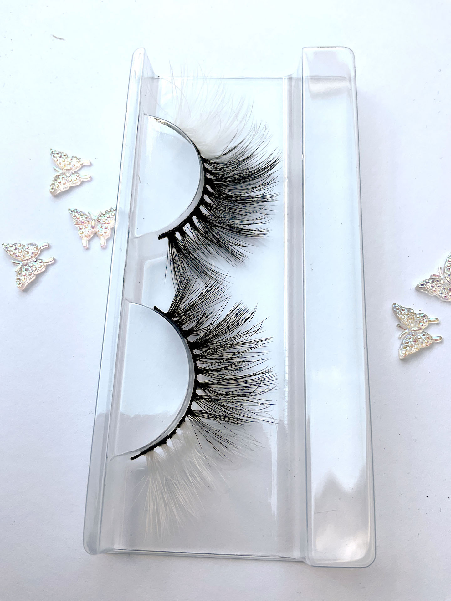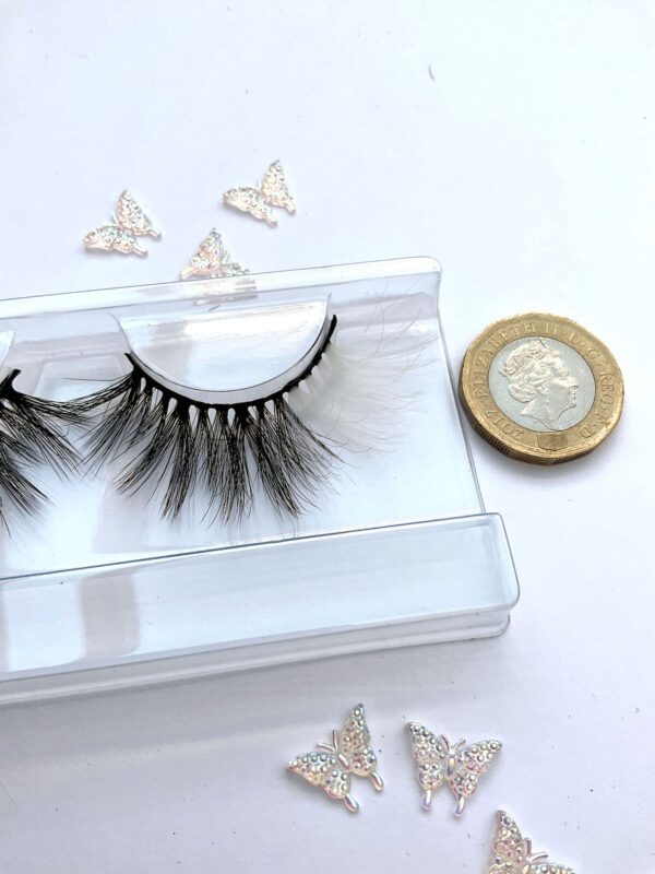 This is Crue. Inspired by an iconic villainess, she is one pair of fabulous 15mm false eyelashes, in black with a large white wing section, the lash hairs fanning out from shorter to longer. She also has a more 3D sister, Ella, that is shorter and fuller, seen side by side in the last image.