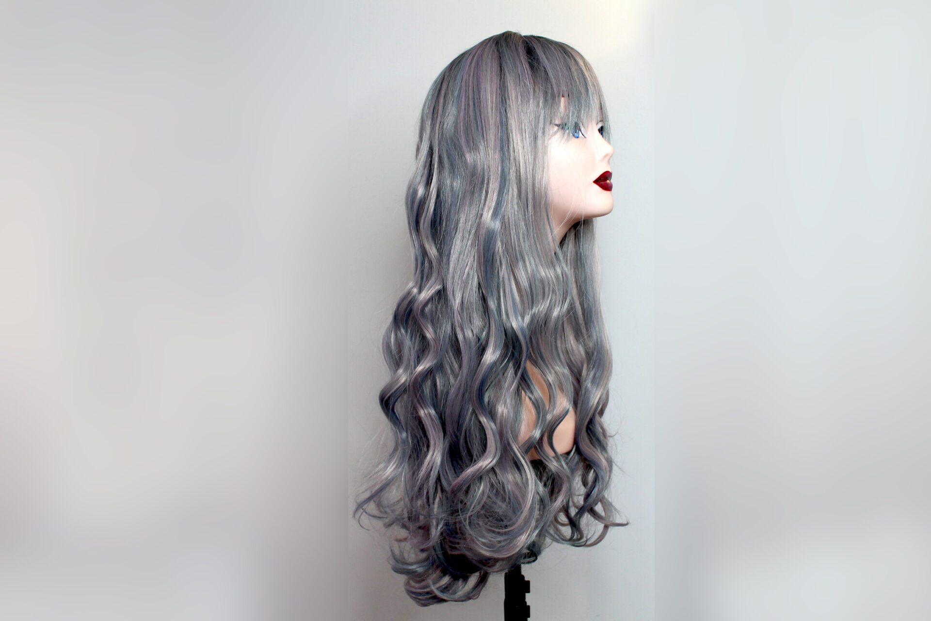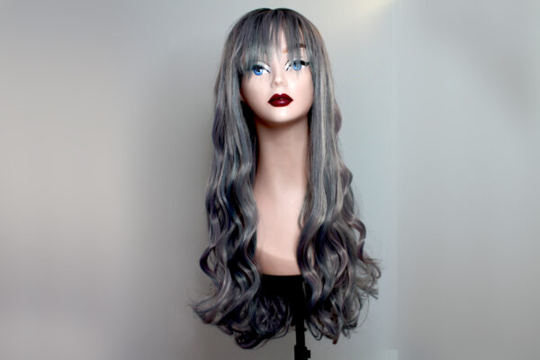This is Darla. She is a longer grey wig in a soft wave pattern with a fringe or bangs and multi tonal high/lowlights in blues, purples and pinks. Super cute, pretty much shake-n-go.