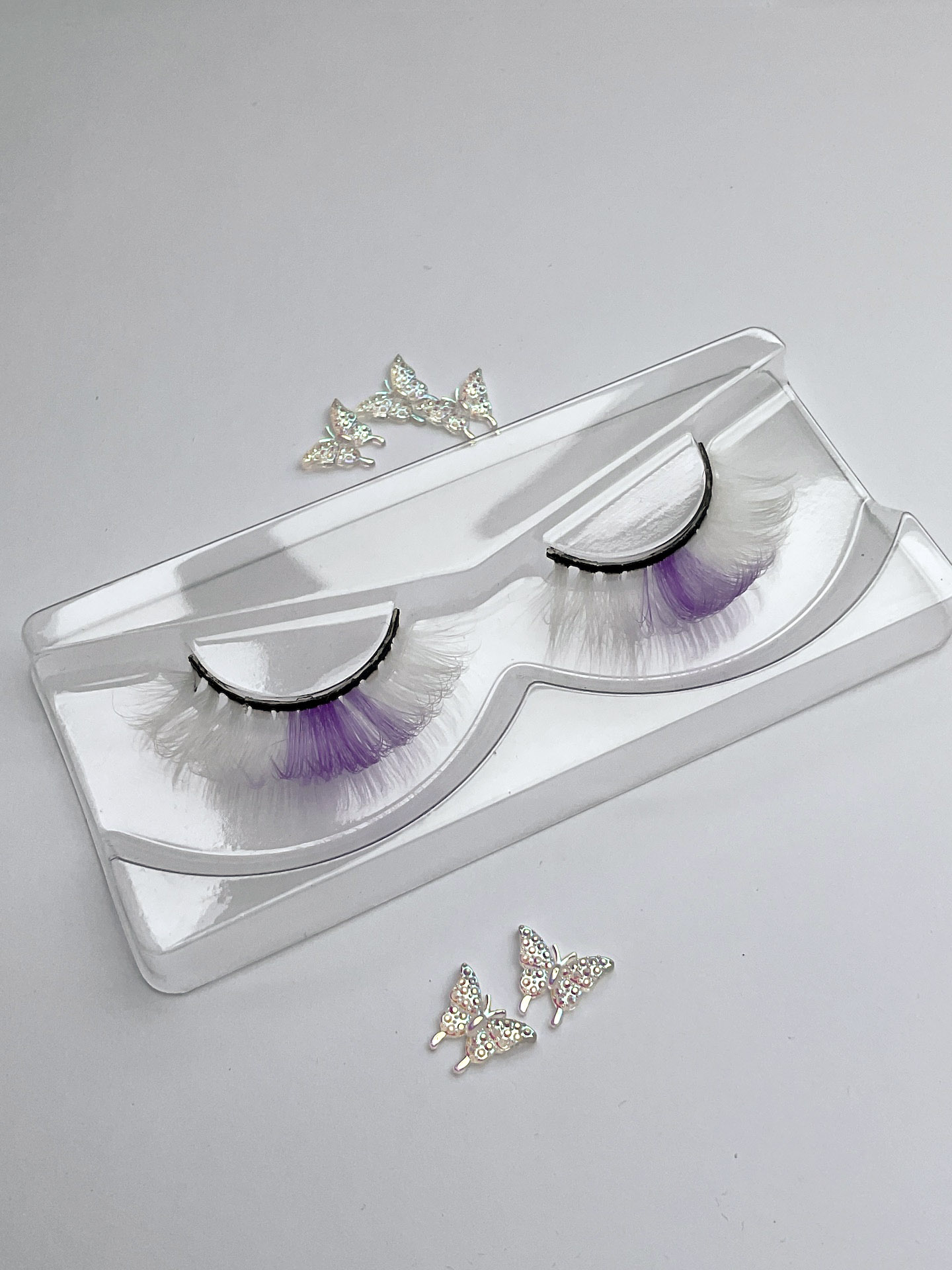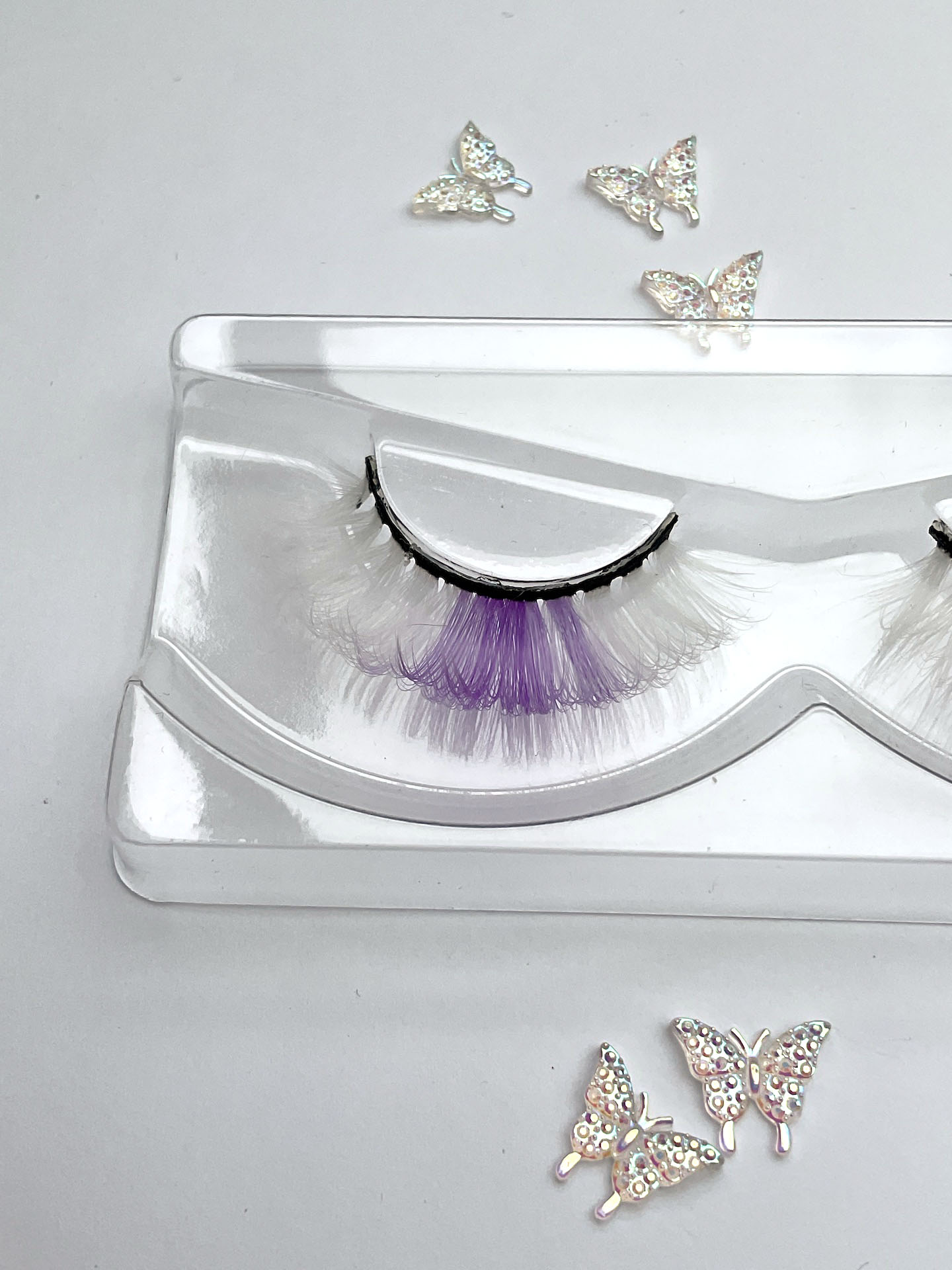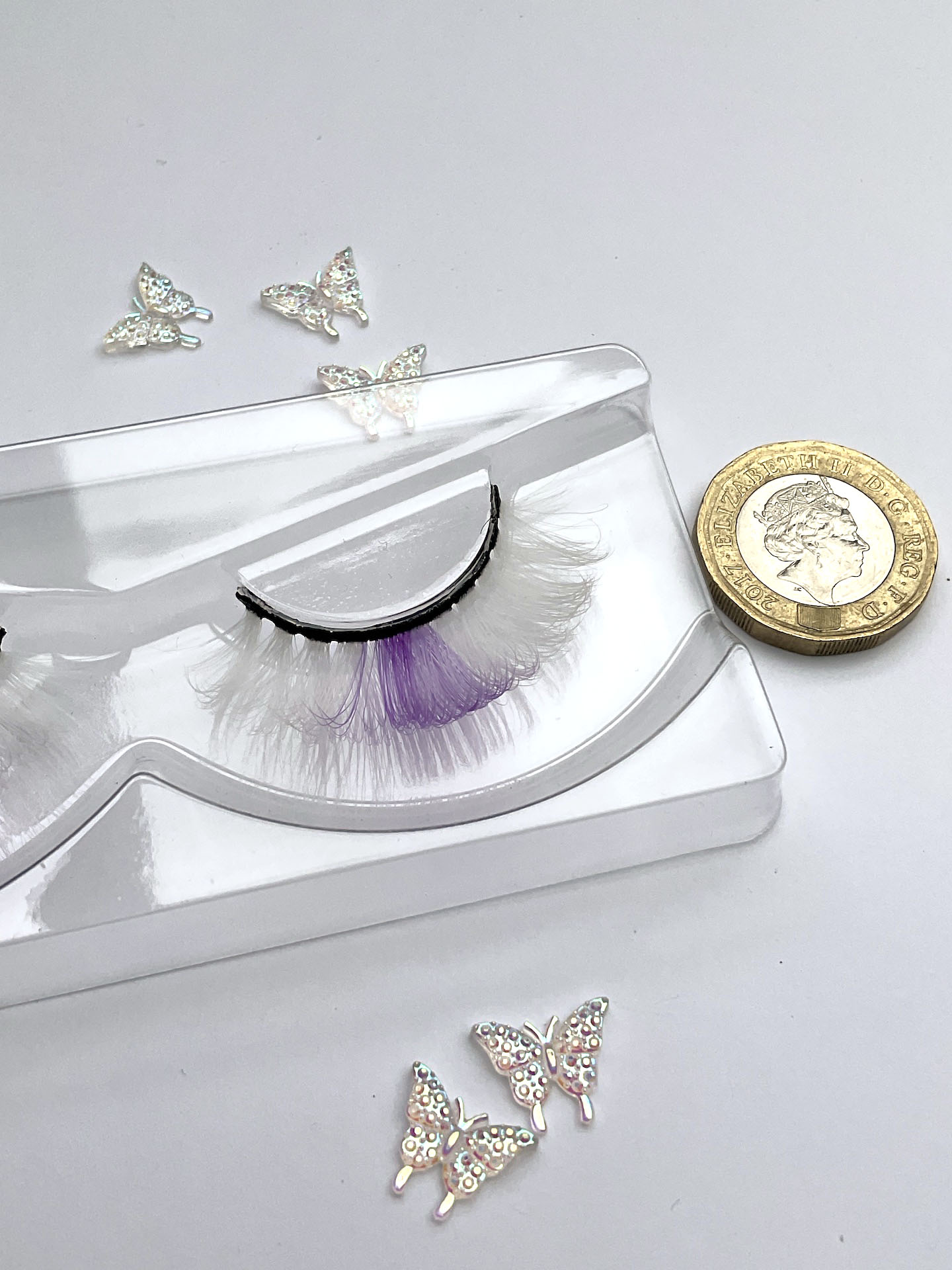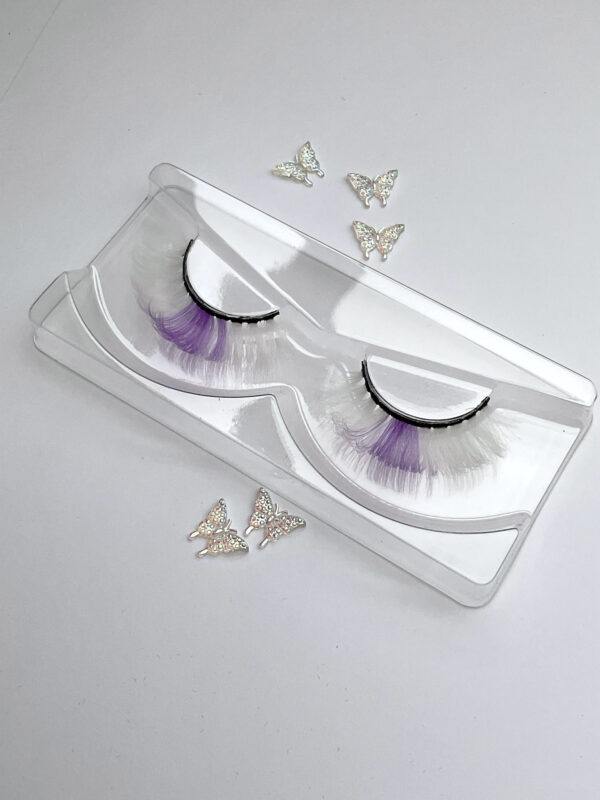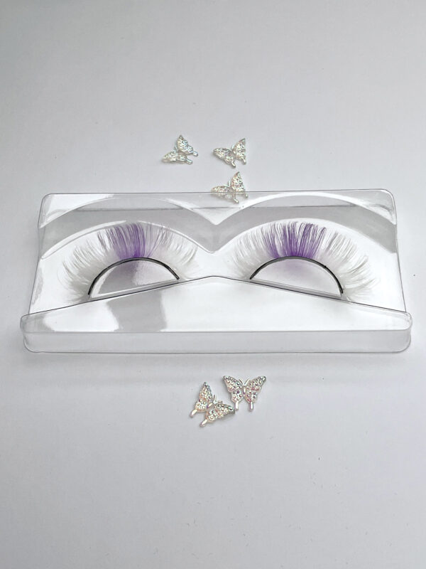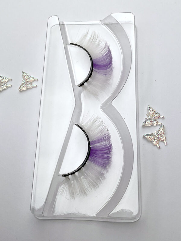This is the Diamond Pearl Festival Lash in White. She is a super cute, curly, fun and colourful shorter set of lashes in white with a lilac streak, that is perfect for a summer festival look.