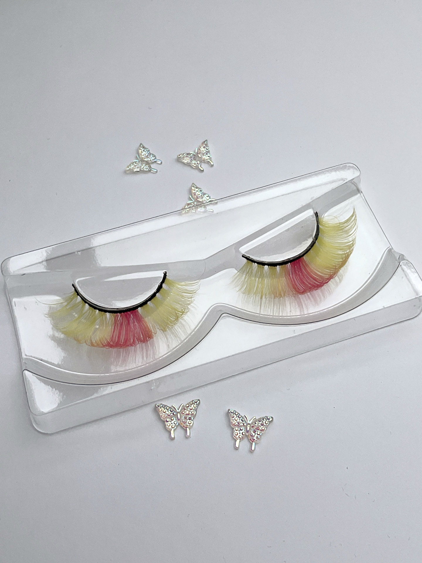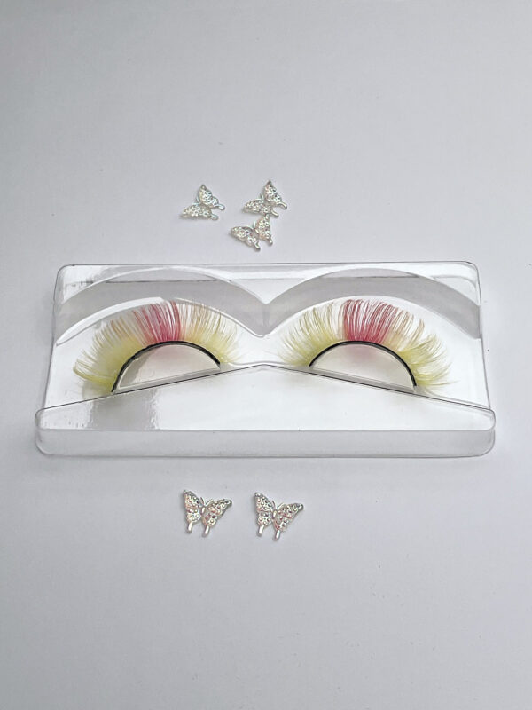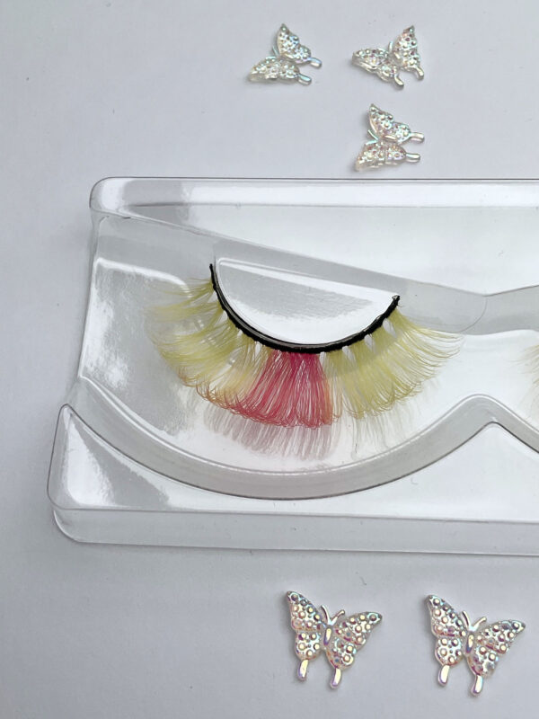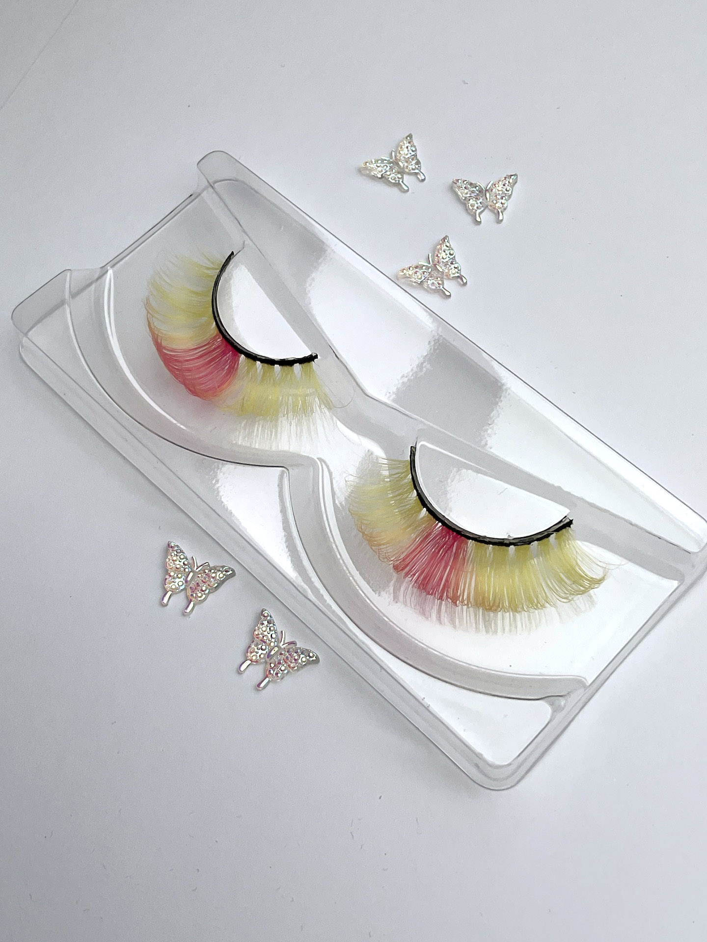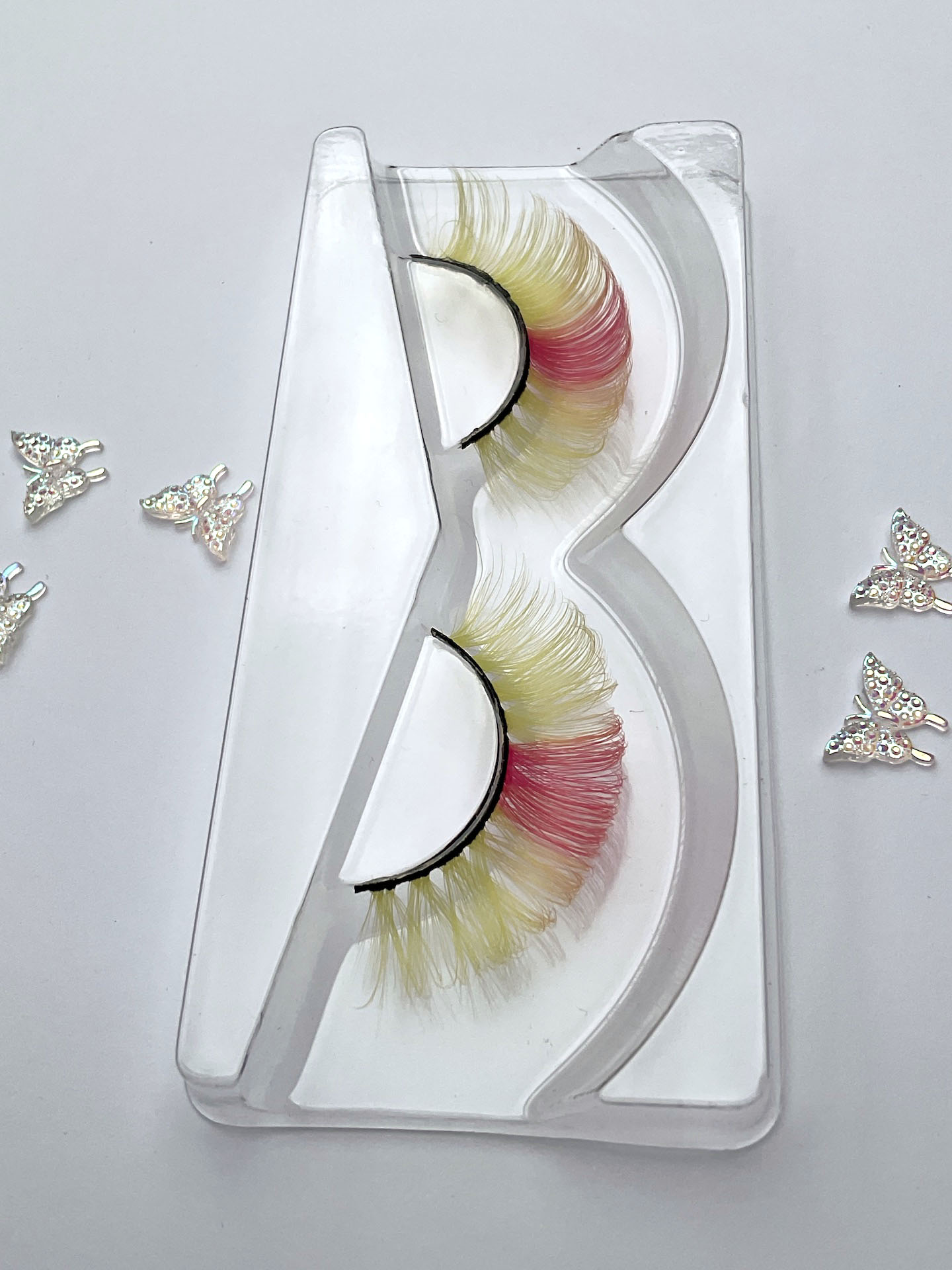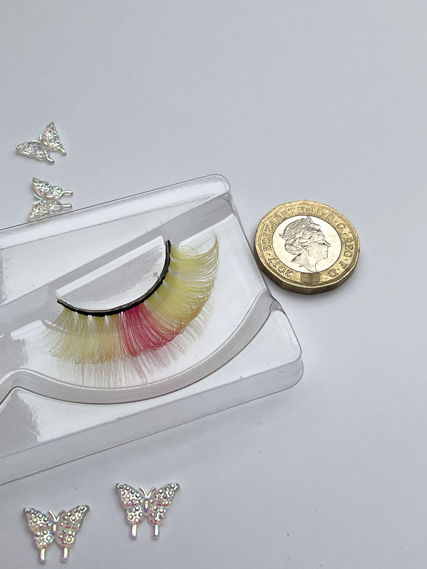 This is the Diamond Pearl Festival Lash in Yellow. She is a super cute, curly, fun and colourful shorter set of lashes in yellow with a pinky red streak, that is perfect for a summer festival look.