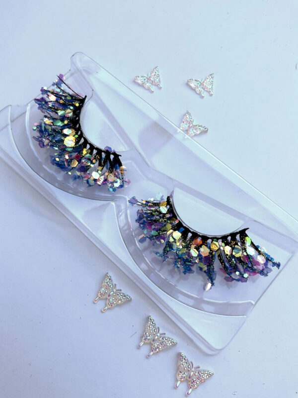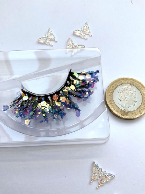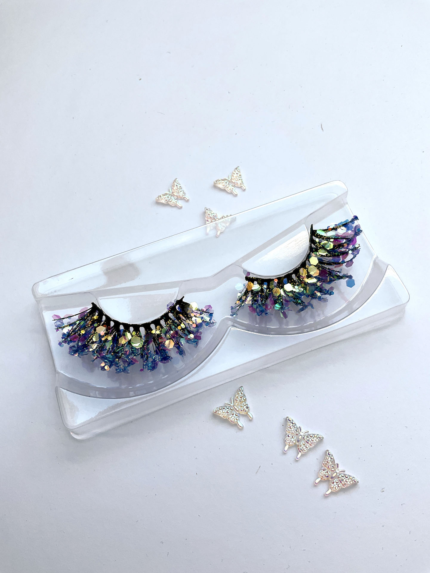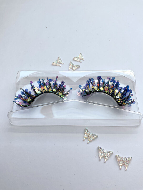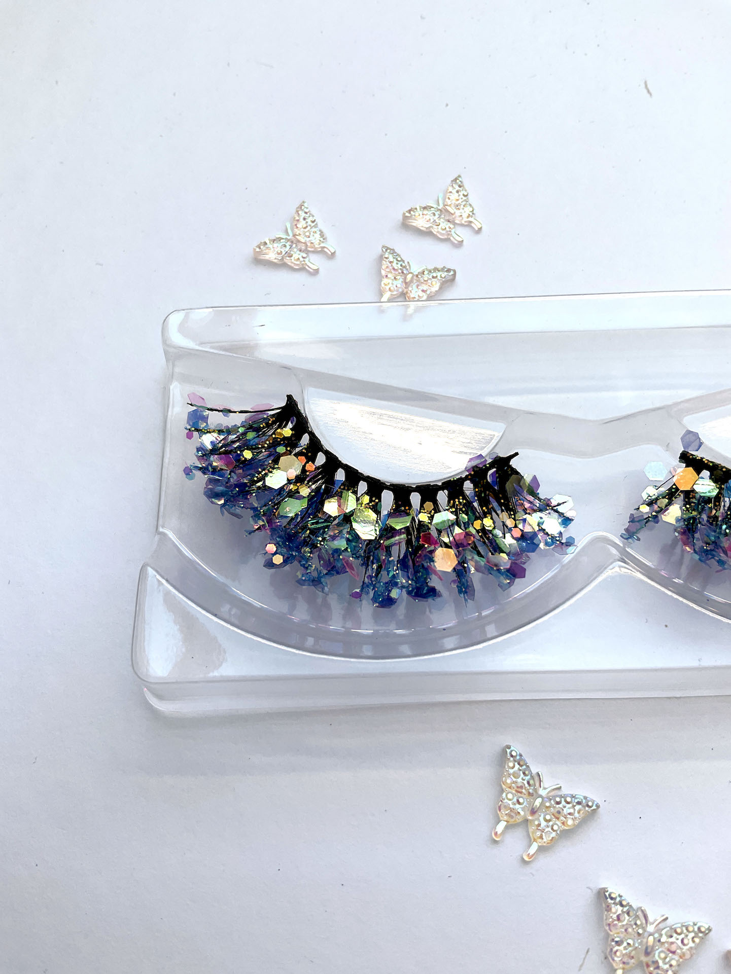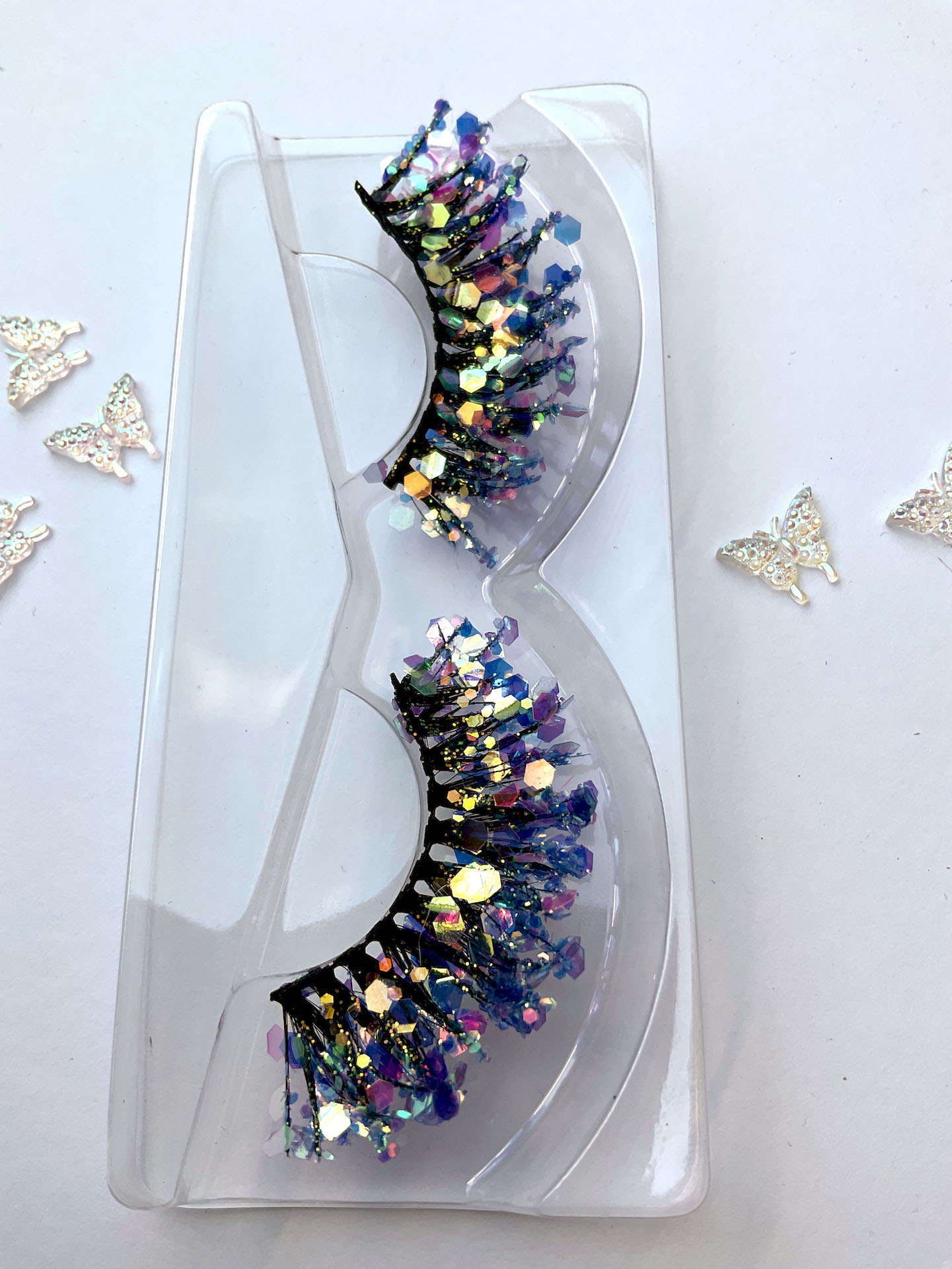 This is Fabulous. She is one pair of fabulous 15-20mm false eyelashes, in black with a generous coating of chunky pale blue glitter. Each lash set is different.