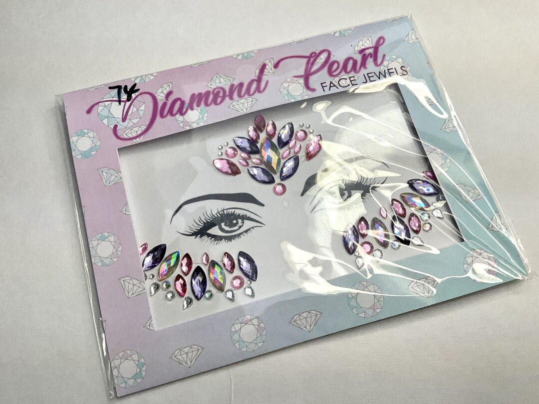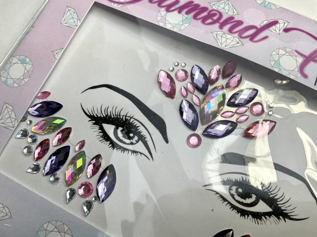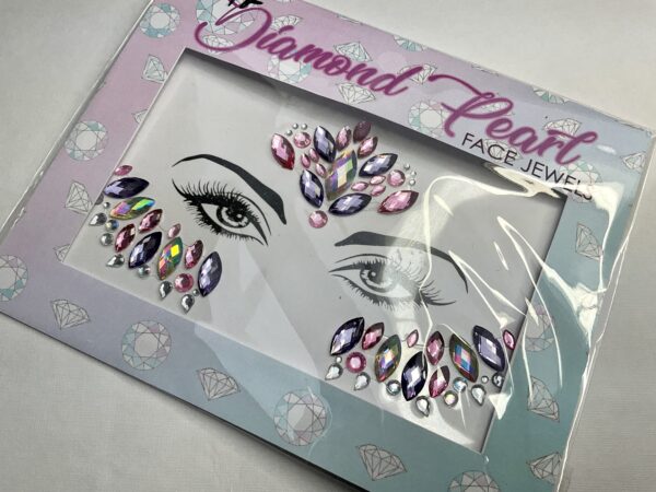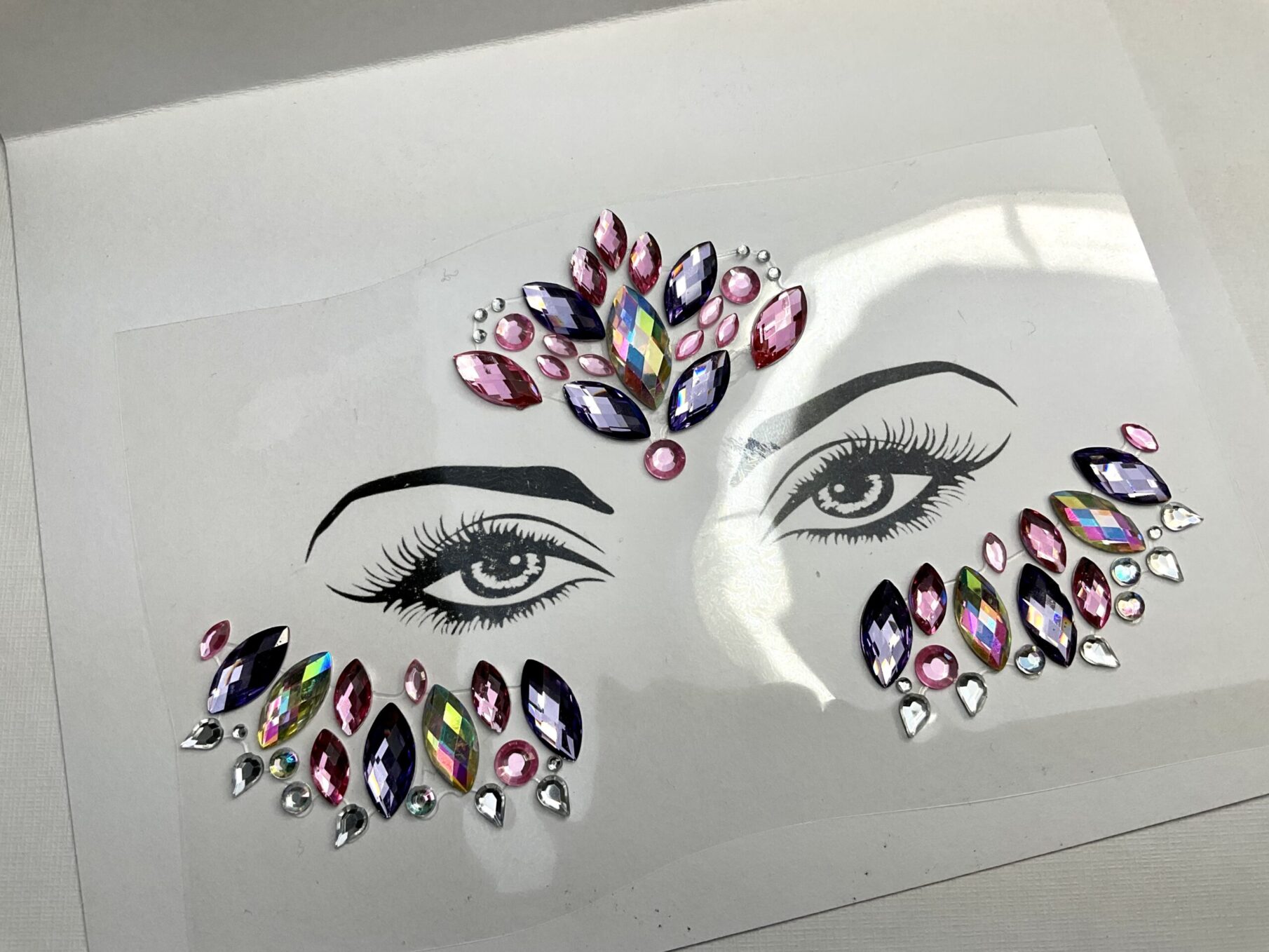 This is one set of fabulous face jewels, in pink and lilac / mauve AB. The jewels are acrylic so they are lightweight and have a sticky backing to them so they can be reused. You can also use eyelash glue or spirit gum to attach them when the glue has been used up.