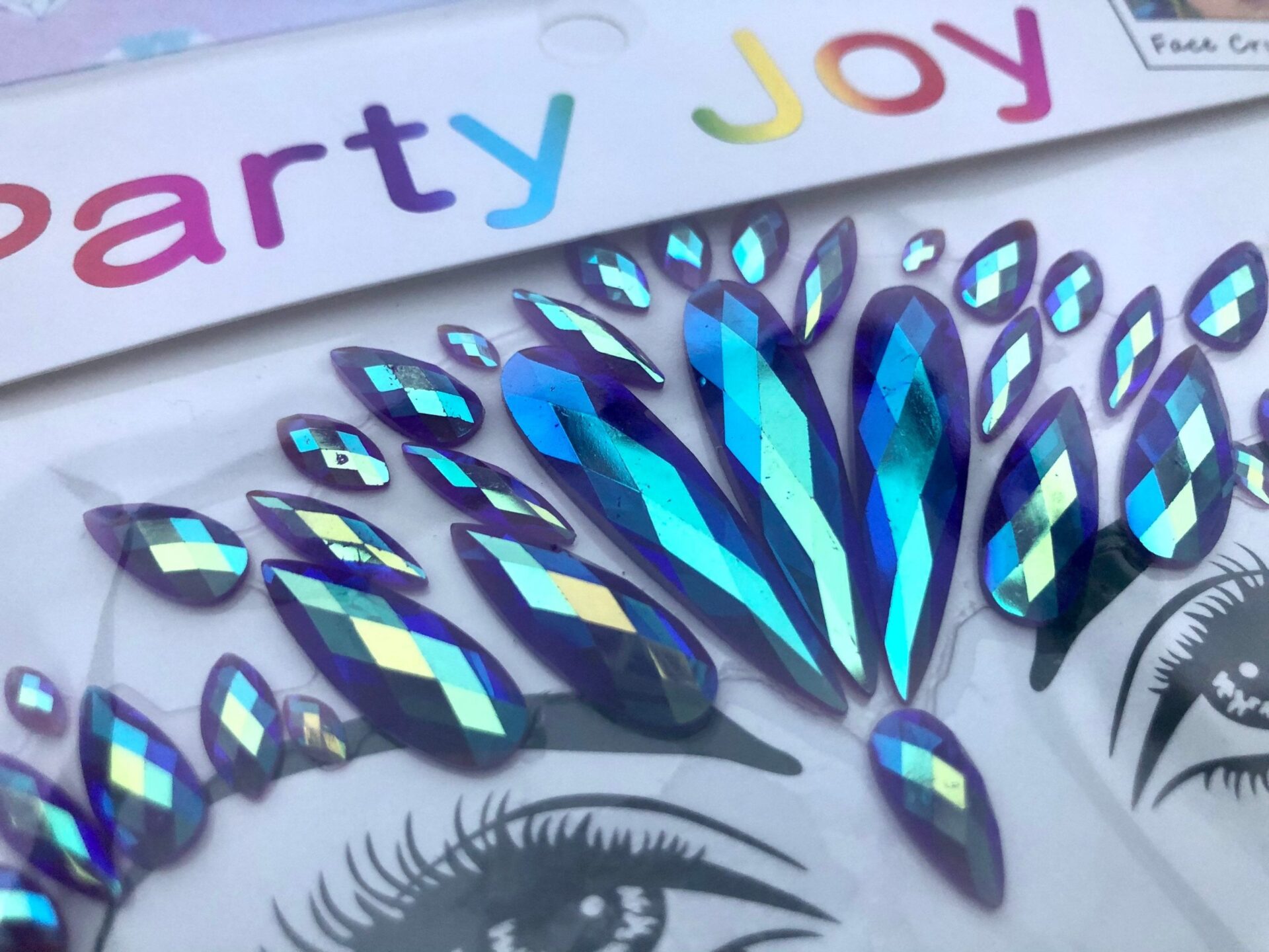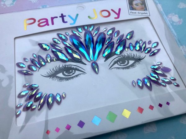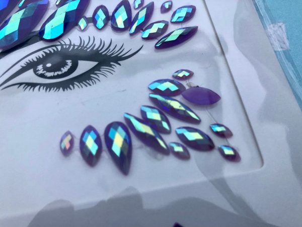 This is one set of fabulous face jewels, in turquoise and blue AB with purple undertones. The jewels are acrylic so they are lightweight and have a sticky backing to them so they can be reused. You can also use eyelash glue or spirit gum to attach them when the glue has been used up. Fabulous for festivals and parties.