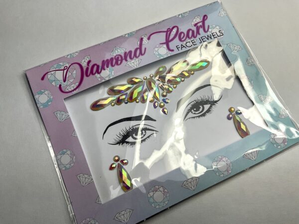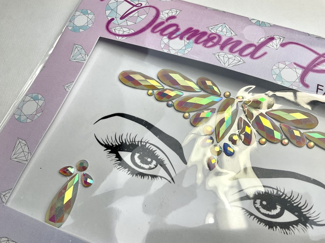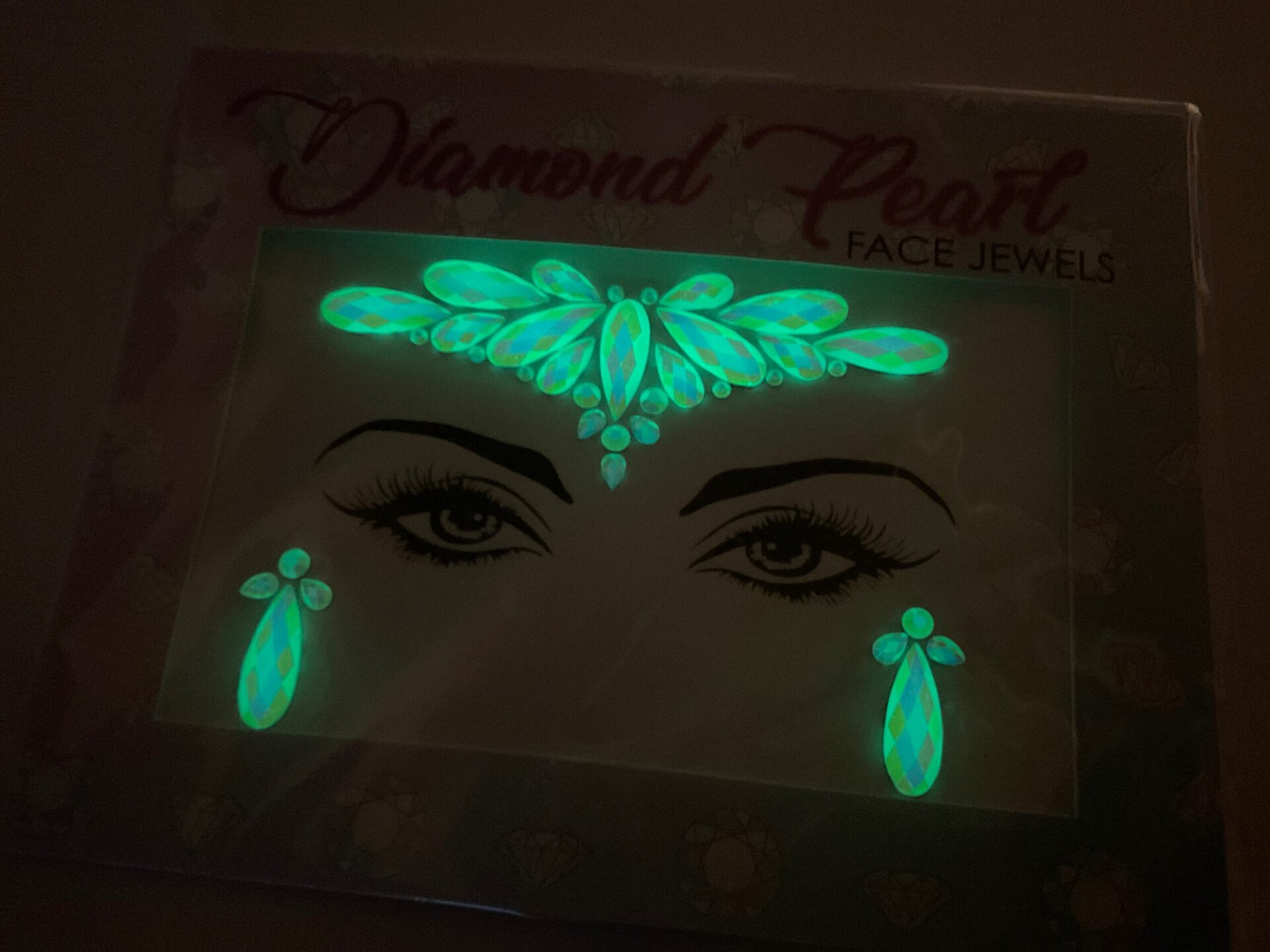 This is one set of fabulous face jewels, in yellow and clear AB that glows in the dark. The jewels are acrylic so they are lightweight and have a sticky backing to them so they can be reused. You can also use eyelash glue or spirit gum to attach them when the glue has been used up.