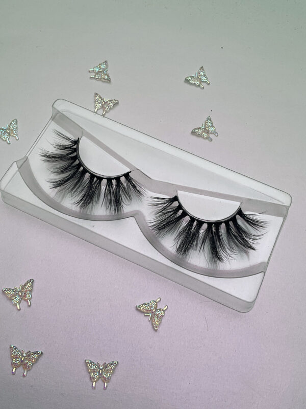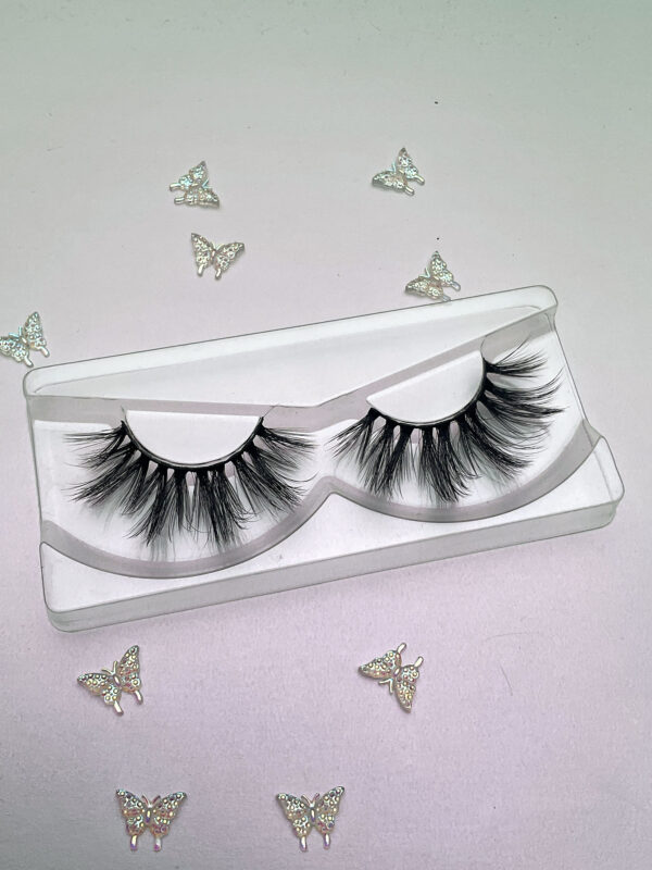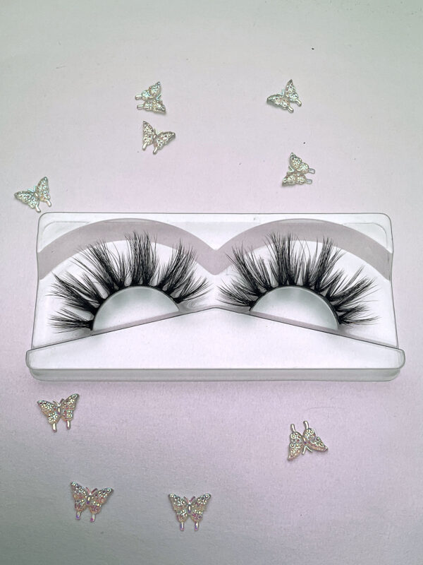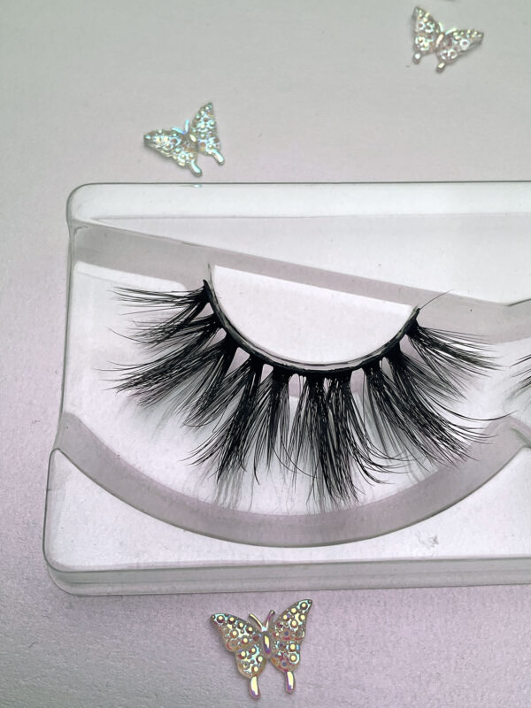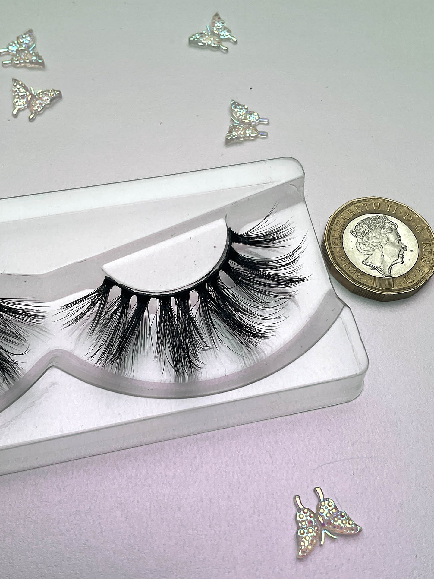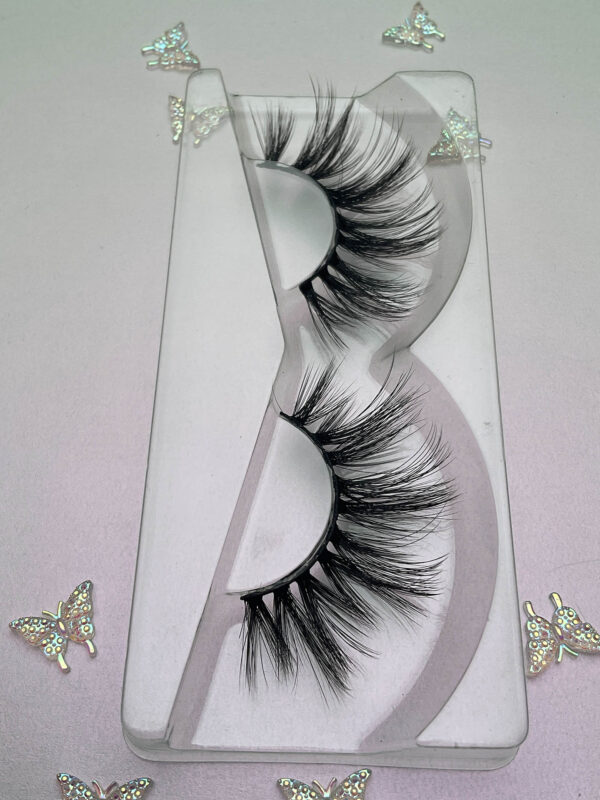 This is Farrah. She is shorter and spiky, and full of fun. Long hairs criss cross to make a flirty pair of lashes. She would make a great lower lash if you wear big lashes!