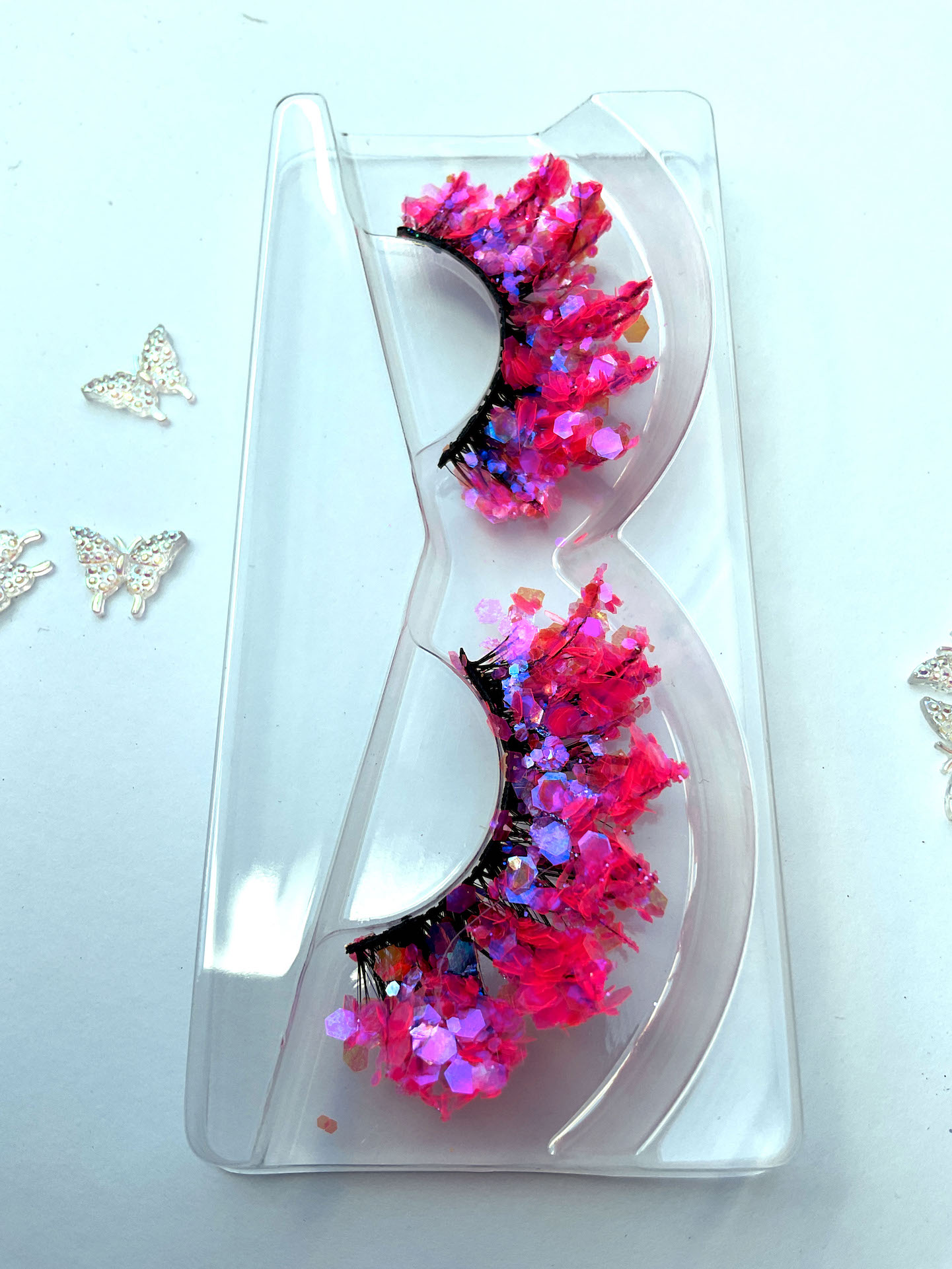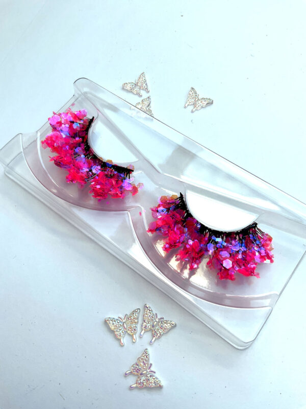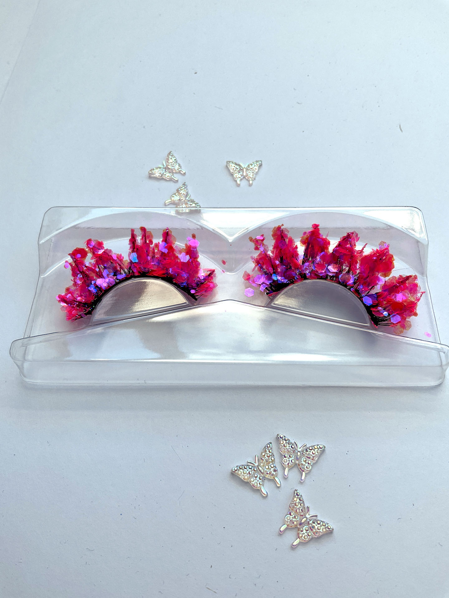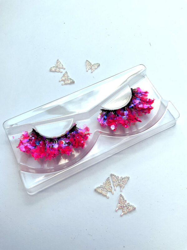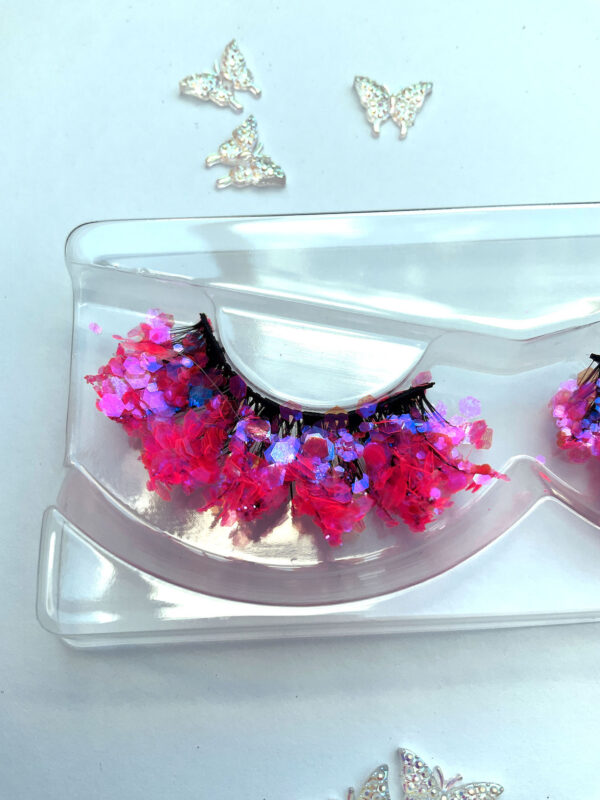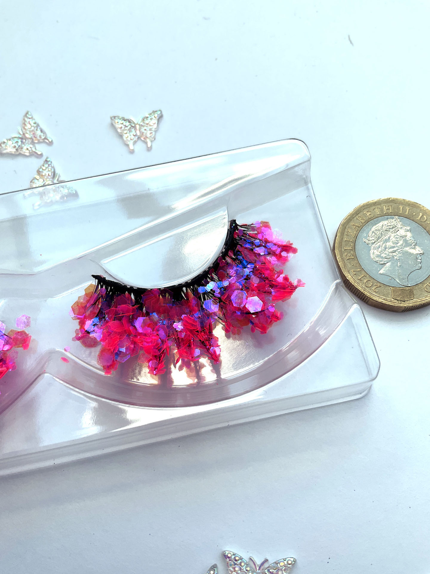 This is Festive. She is one pair of fabulous 15-20mm false eyelashes, in black with a generous coating of chunky hot pink glitter. Each lash set is different.