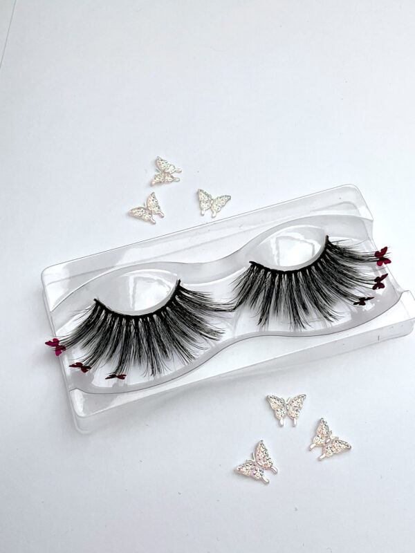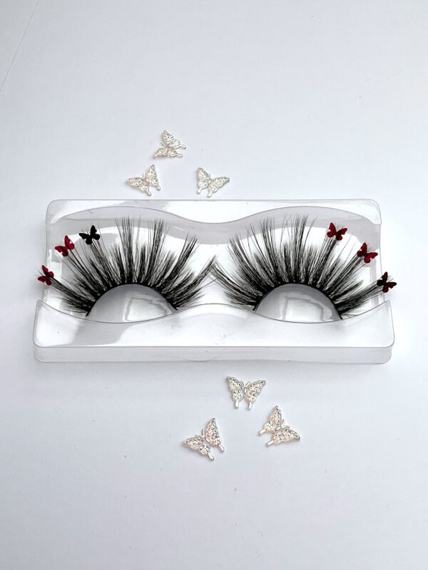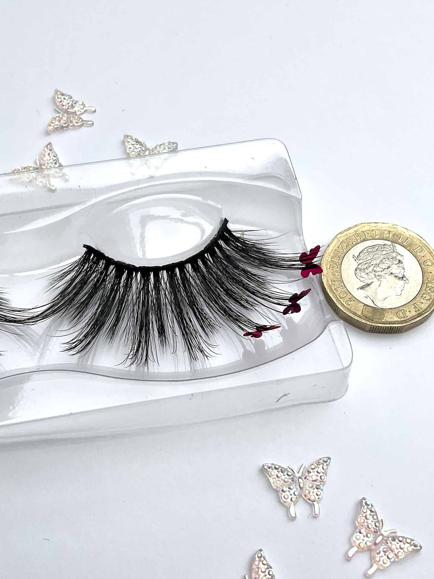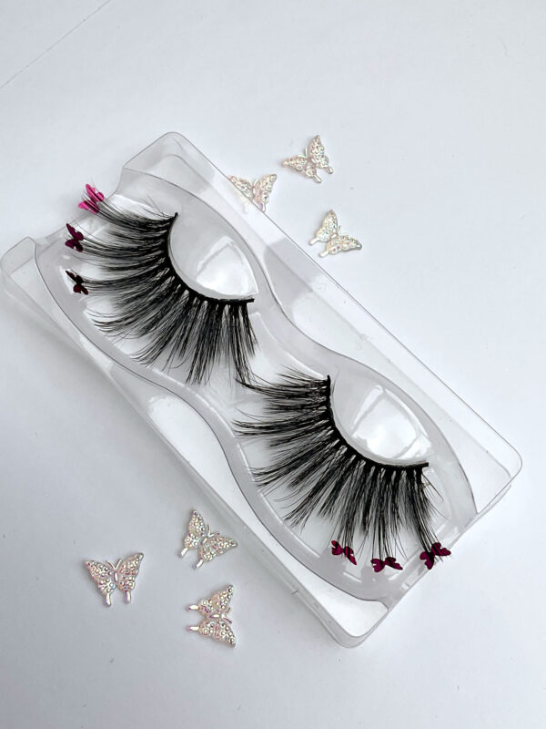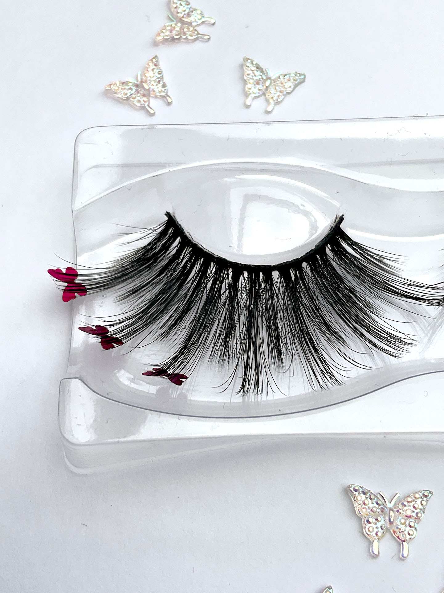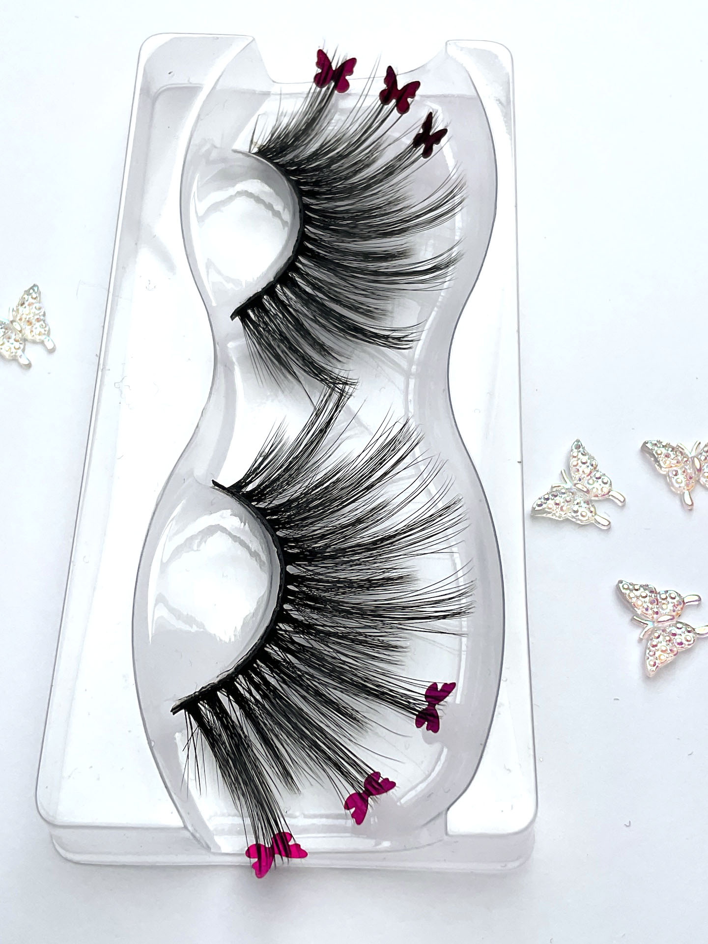 This is Floof. She is one pair of fabulous 25-30mm false eyelashes, in black with three metallic pink butterflies on each wing. Each lash set is different.