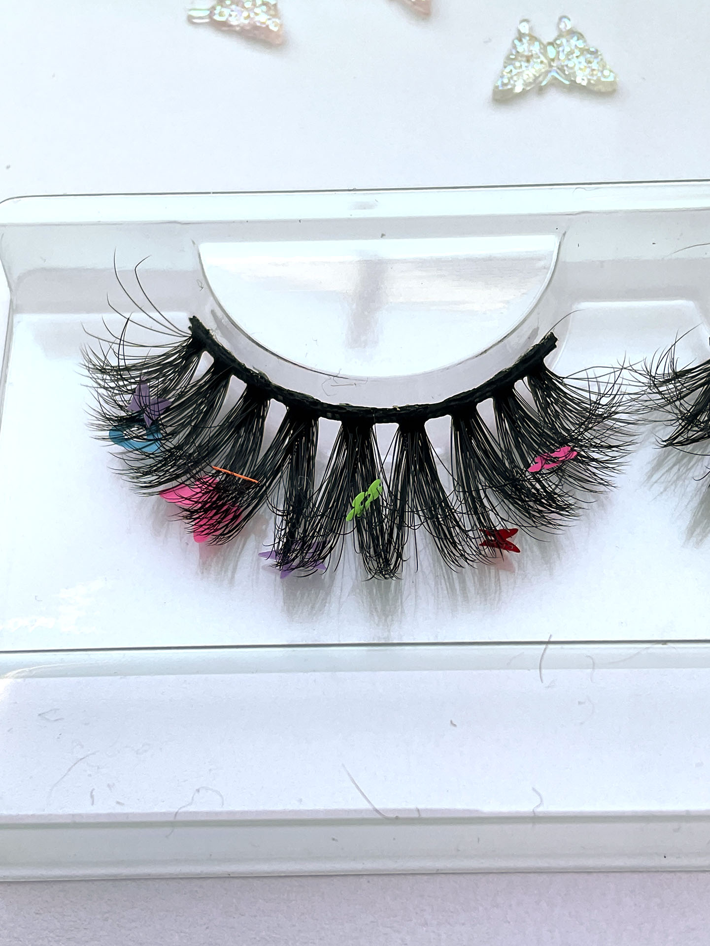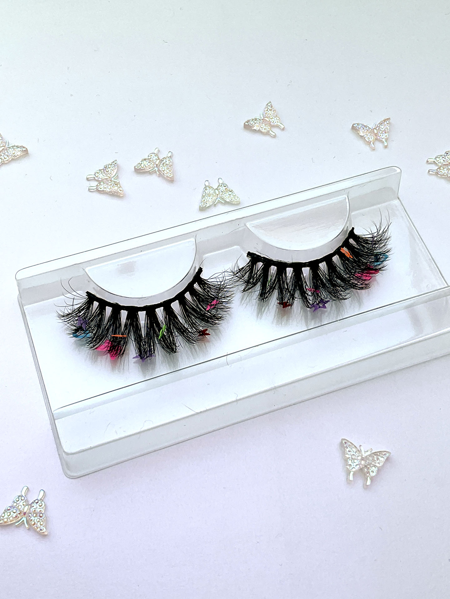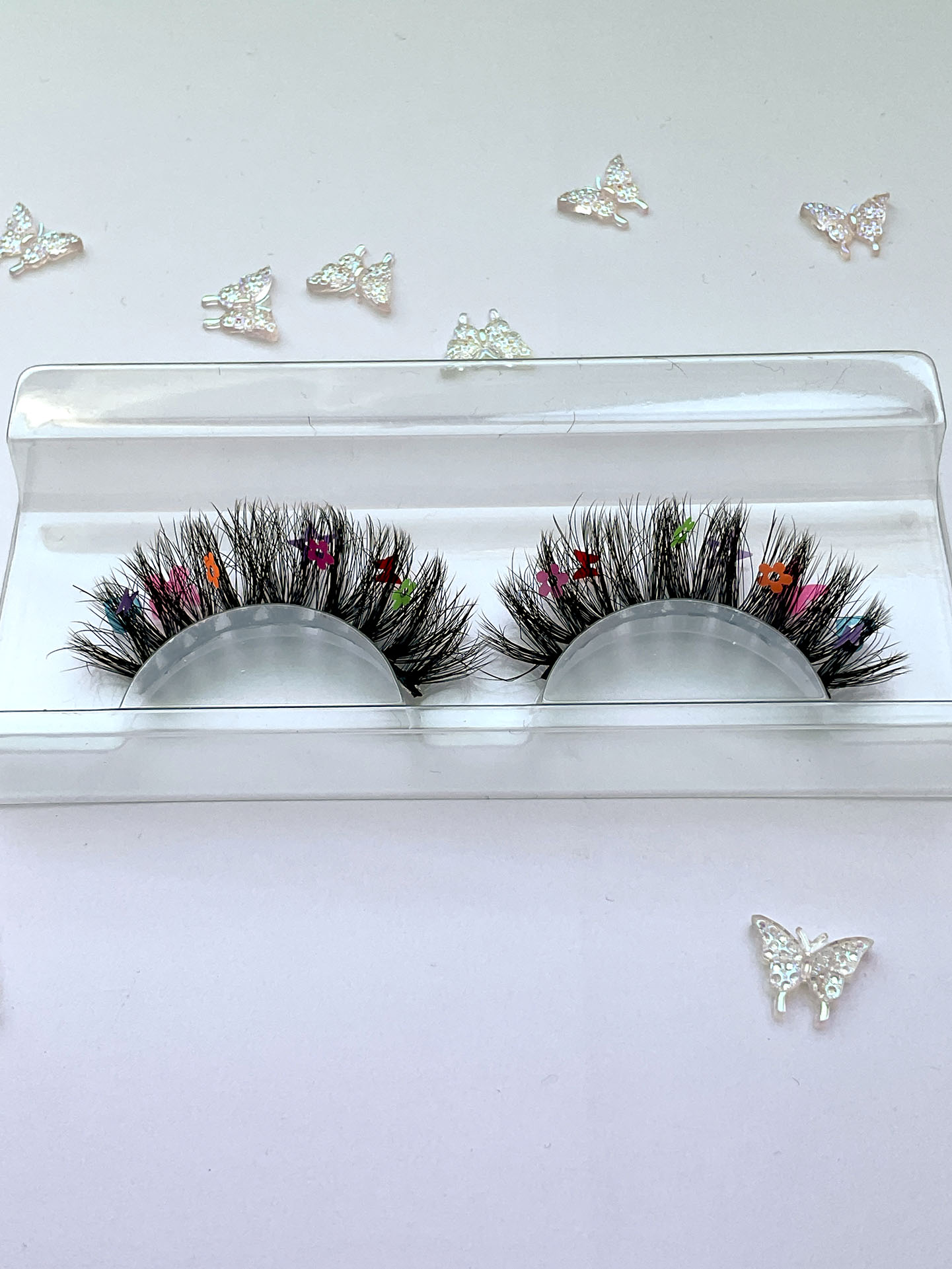 This is Flora. She is one pair of adorable 15-20mm false eyelashes, in black with a drizzle of tiny multi coloured sequins in shapes of flowers, butterflies and stars. Each lash set is different.