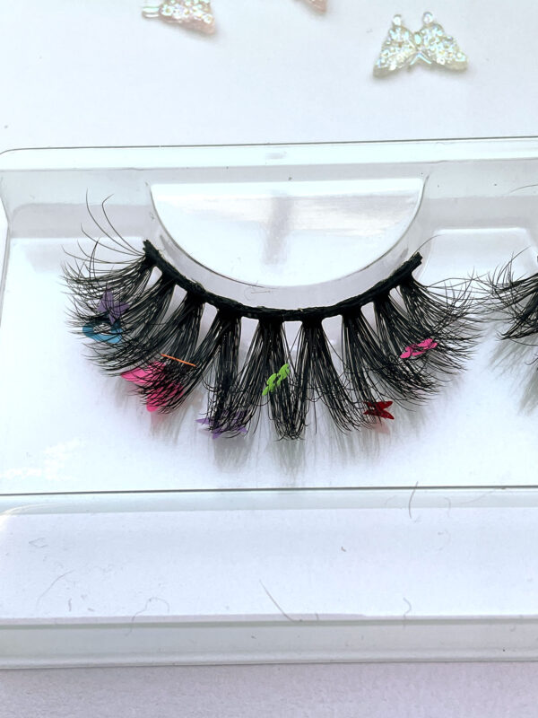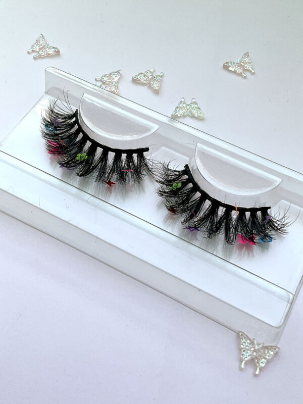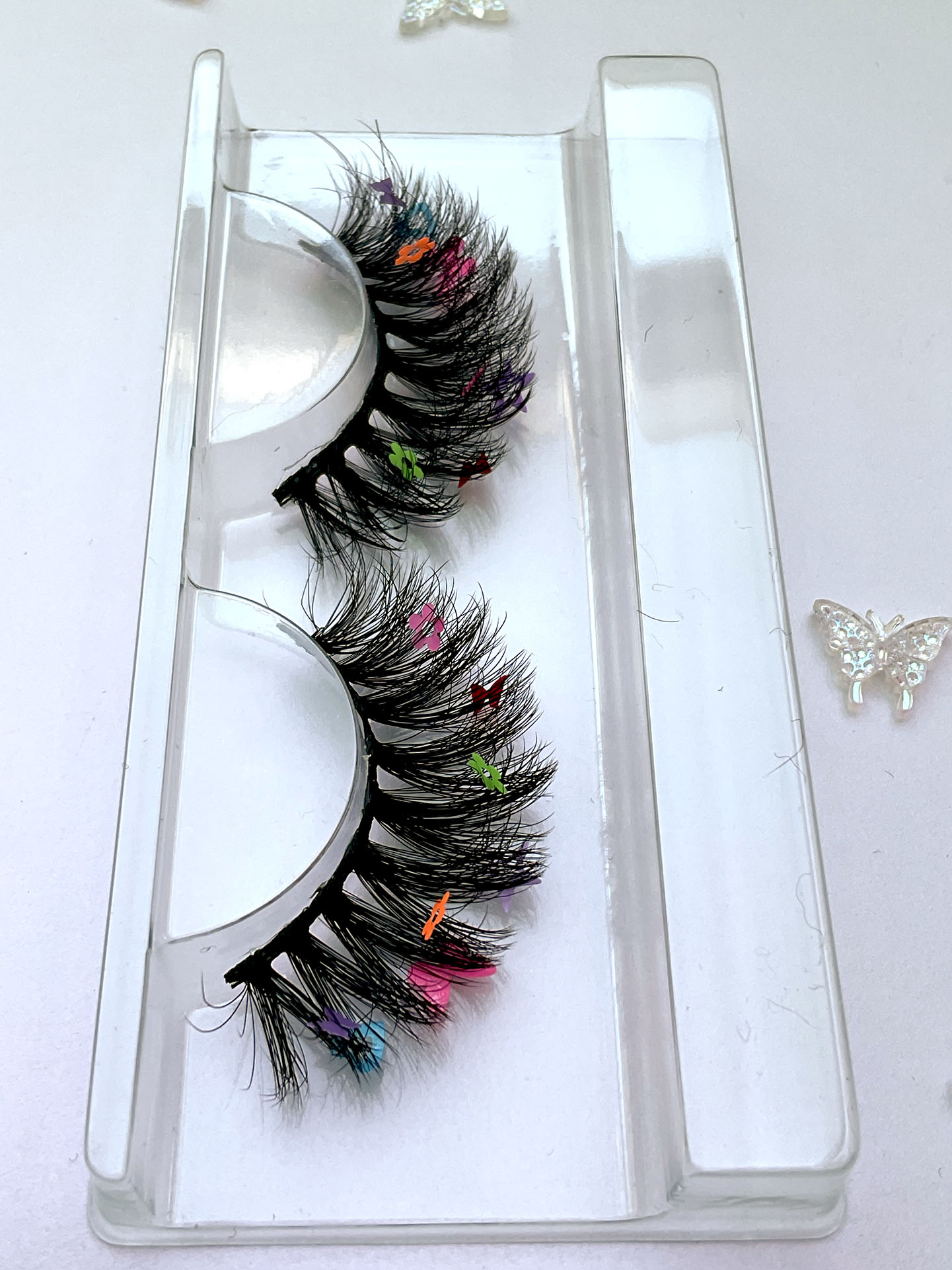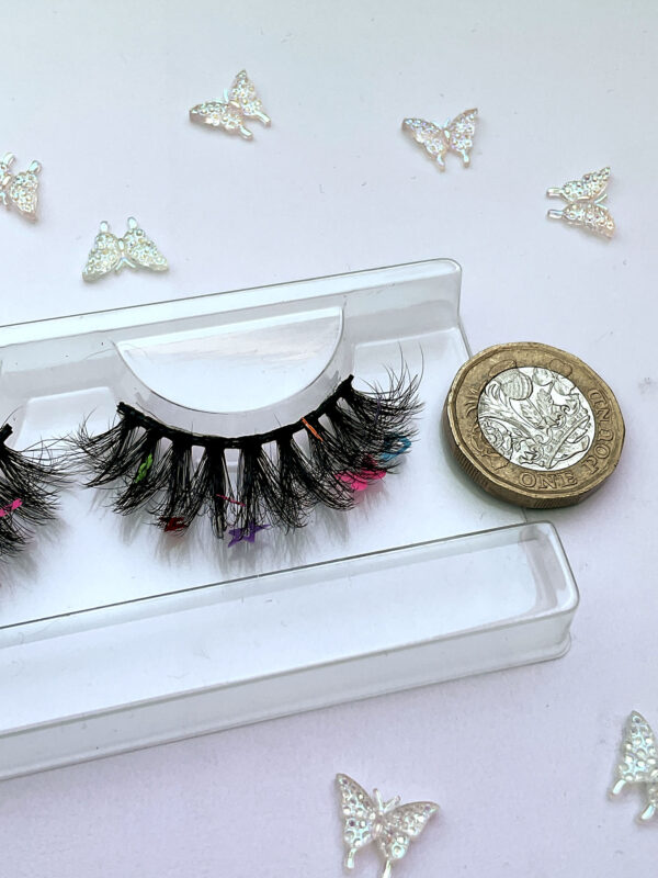 This is Flora. She is one pair of adorable 15-20mm false eyelashes, in black with a drizzle of tiny multi coloured sequins in shapes of flowers, butterflies and stars. Each lash set is different.
