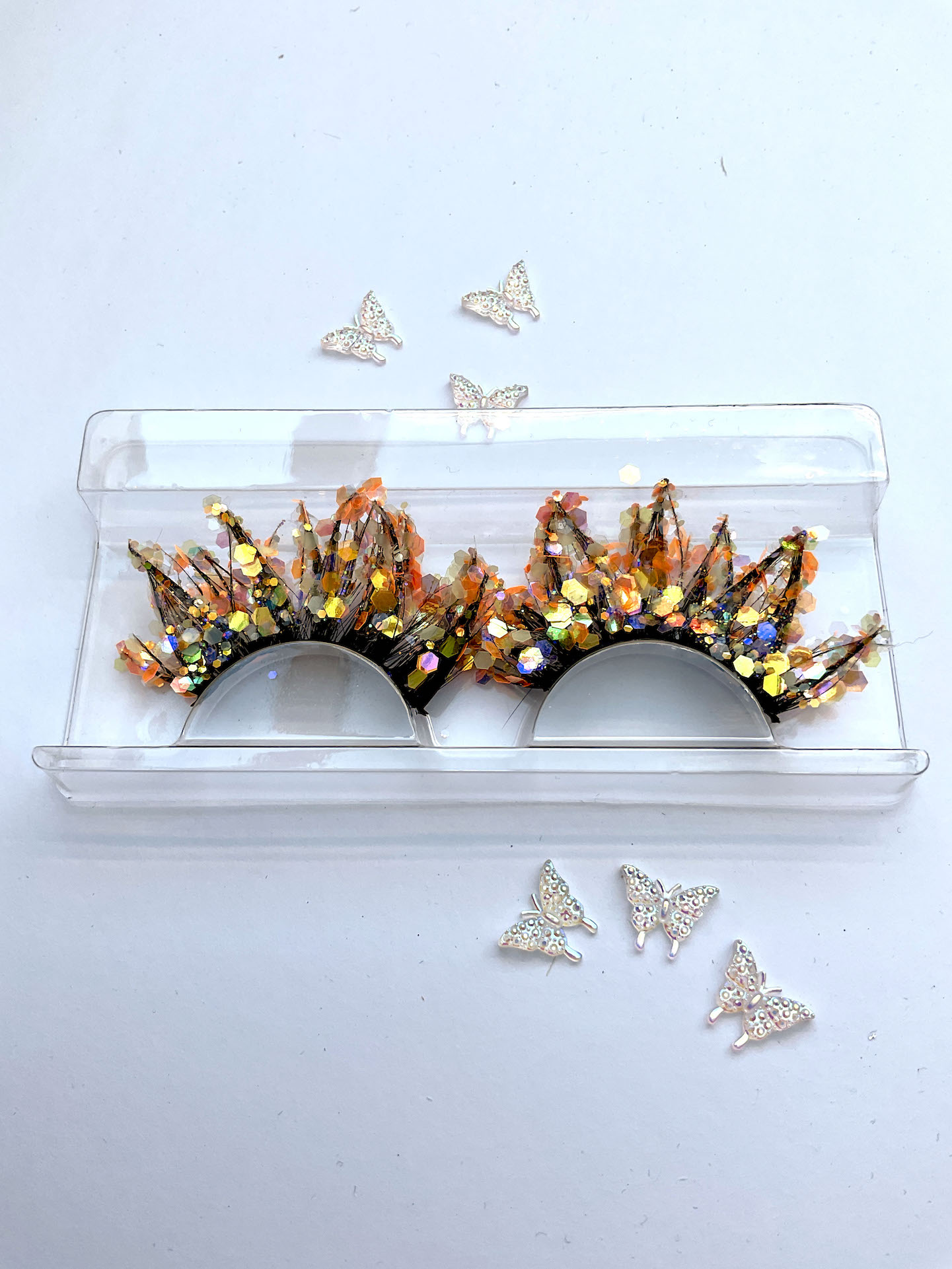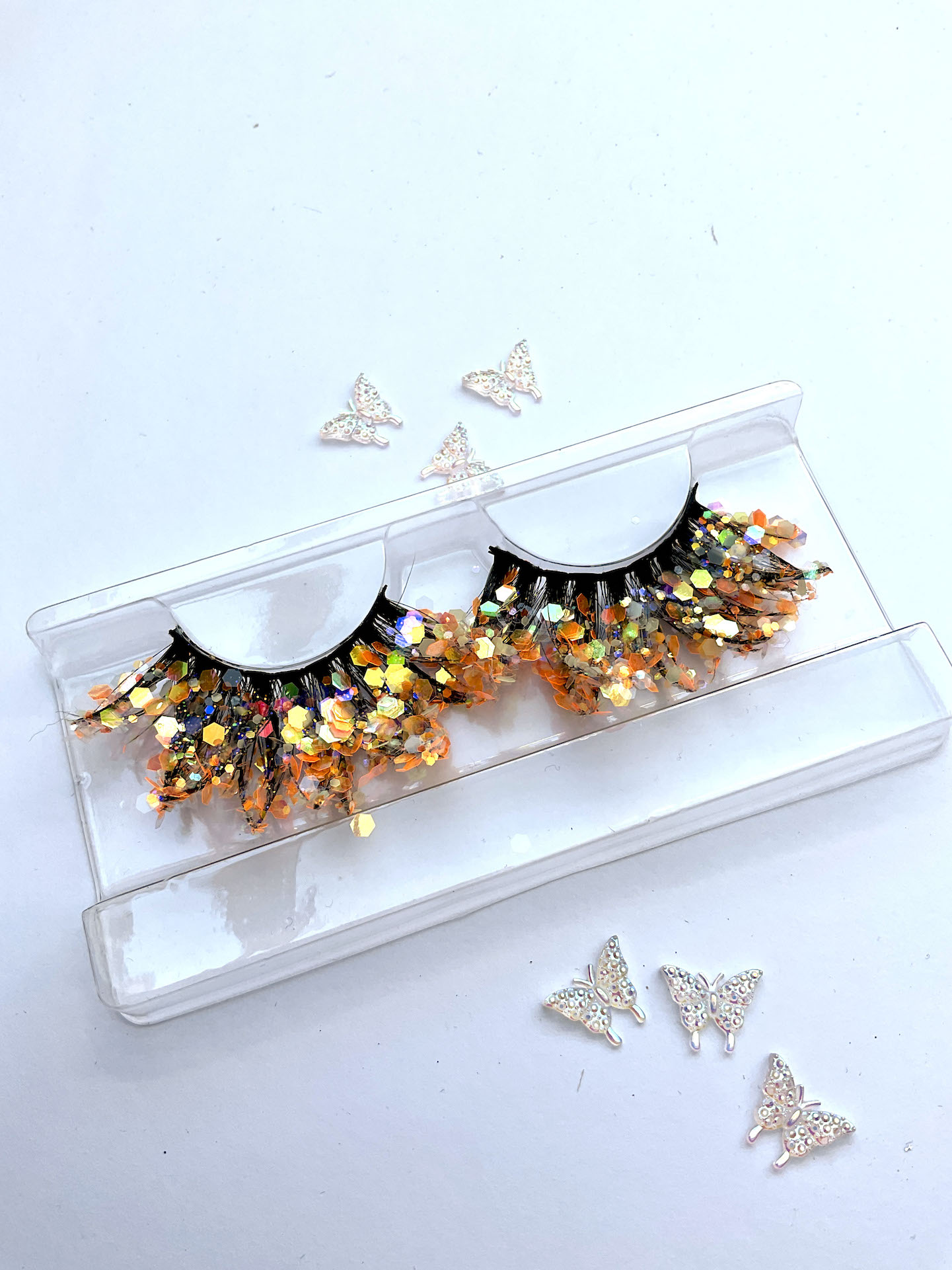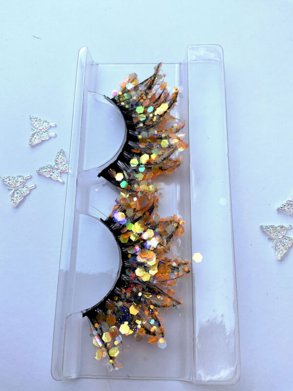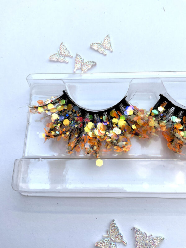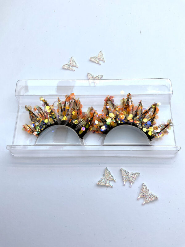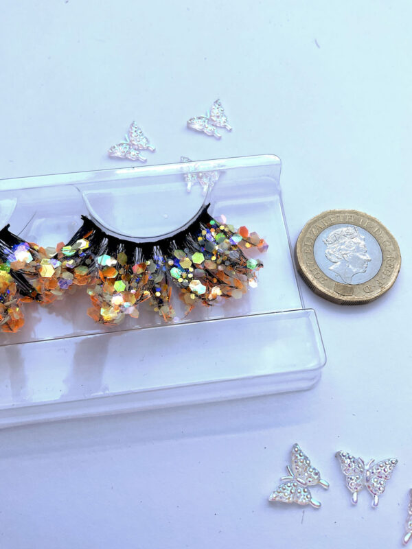 This is Flair. She is one pair of fabulous 20mm false eyelashes, in black with a generous coating of chunky orange glitter. Each lash set is different.