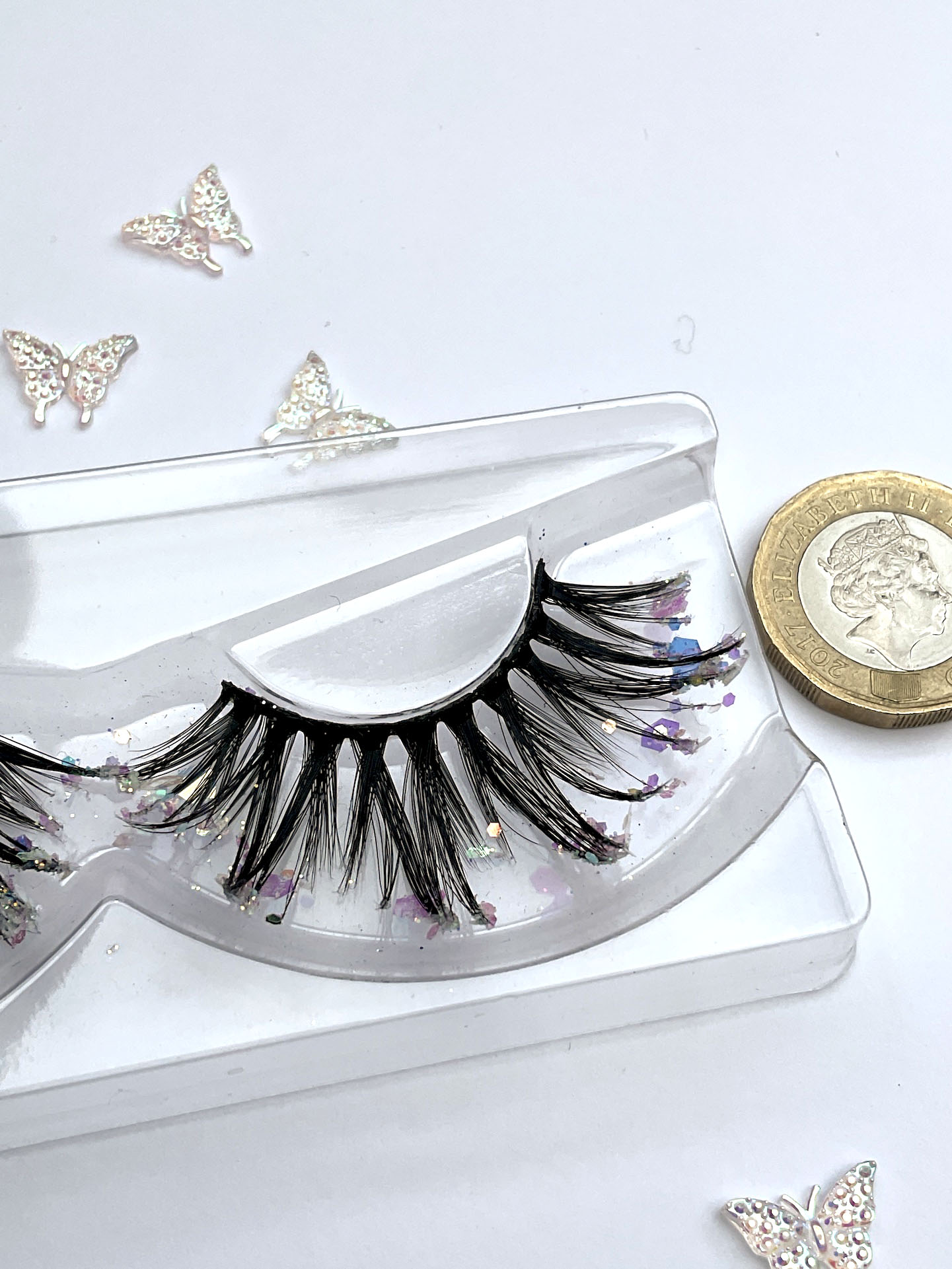 This is ICY. She is one pair of fabulous 25mm false eyelashes, in black with a generous coating of chunky iridescent lilac glitter. Each lash set is different.