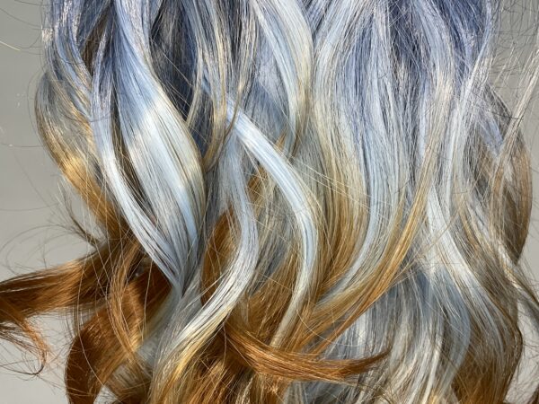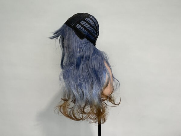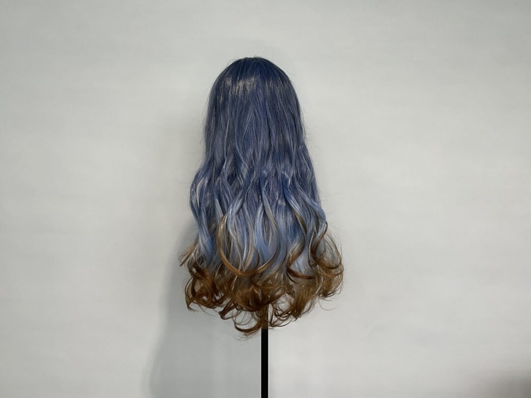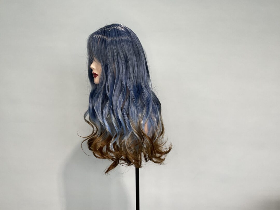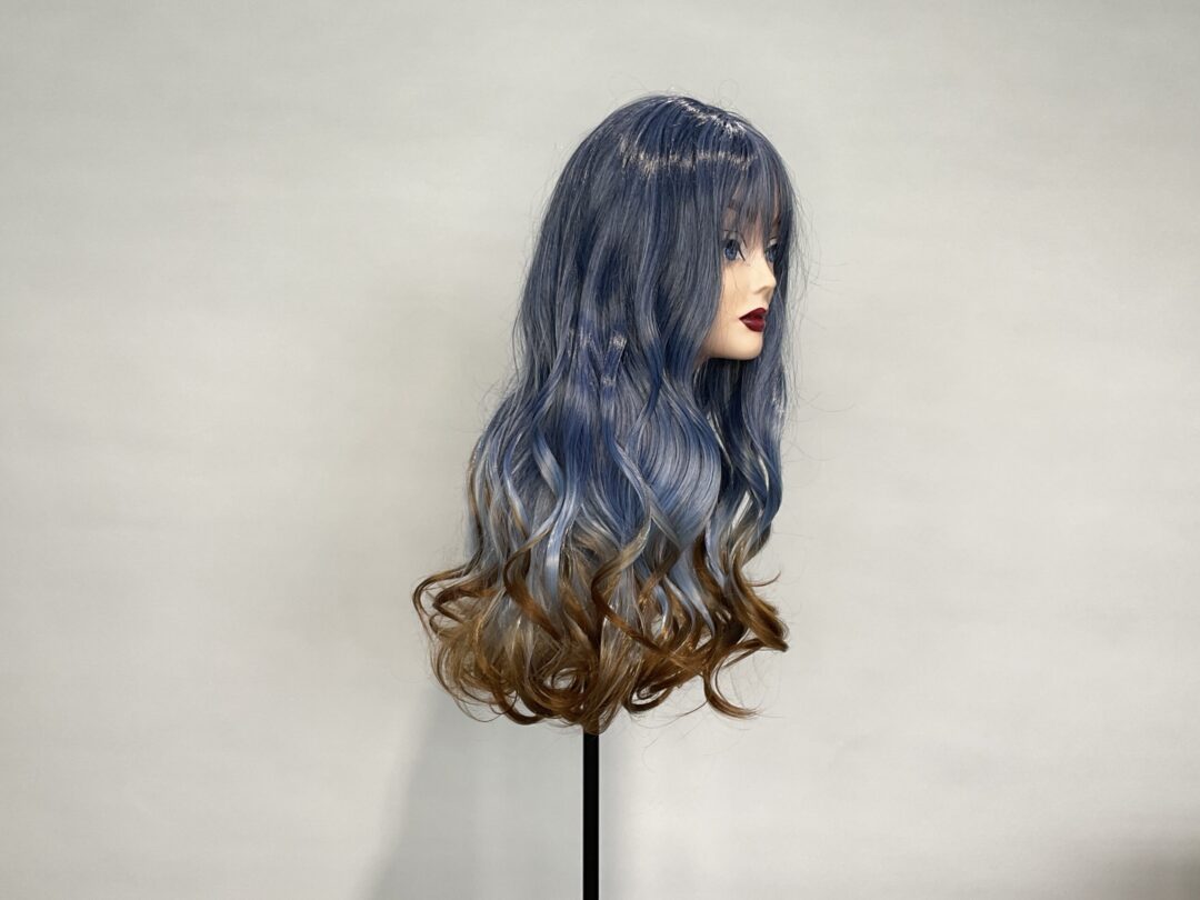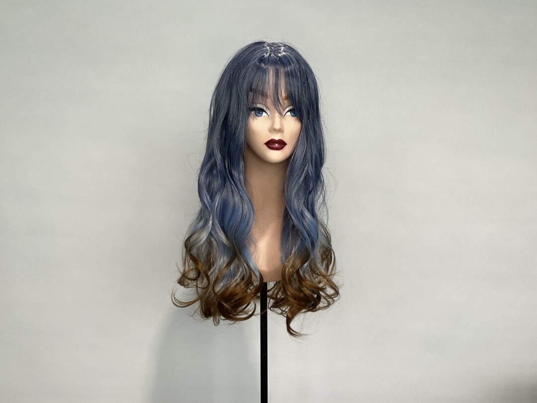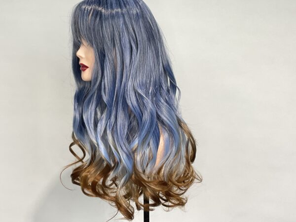 This is Isla. She is a rich mixed blue into pale blue into brown rooted ombre bob wig with a fringe or bangs. Super cute, pretty much shake-n-go.
