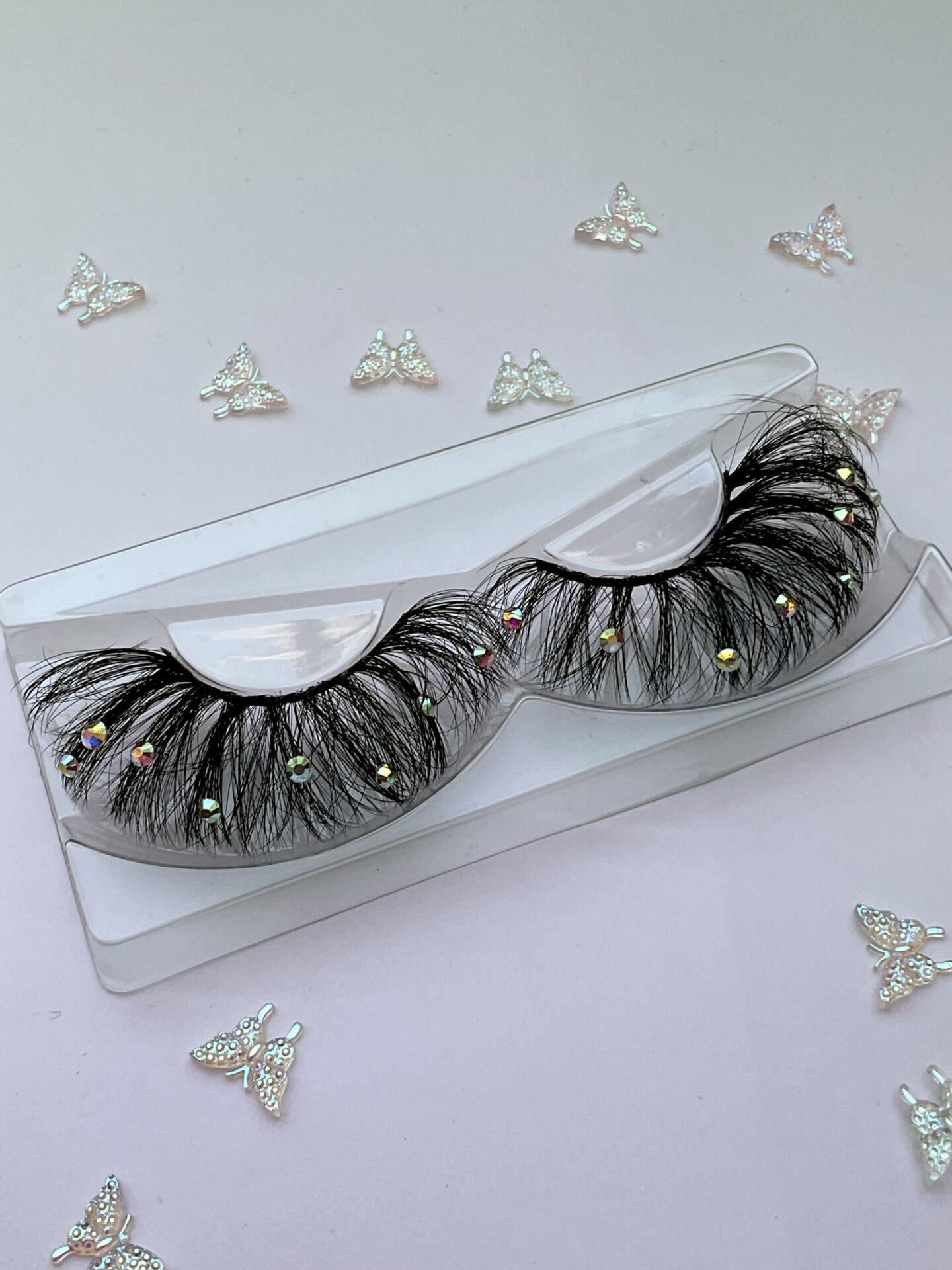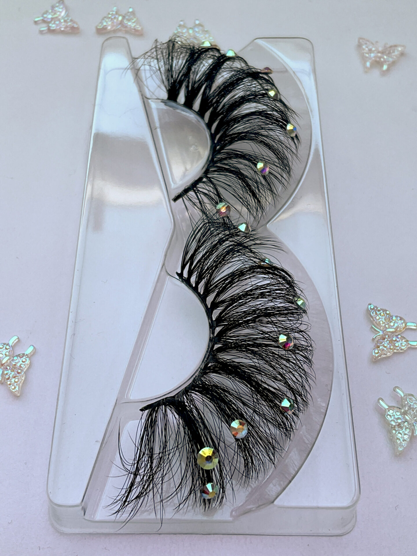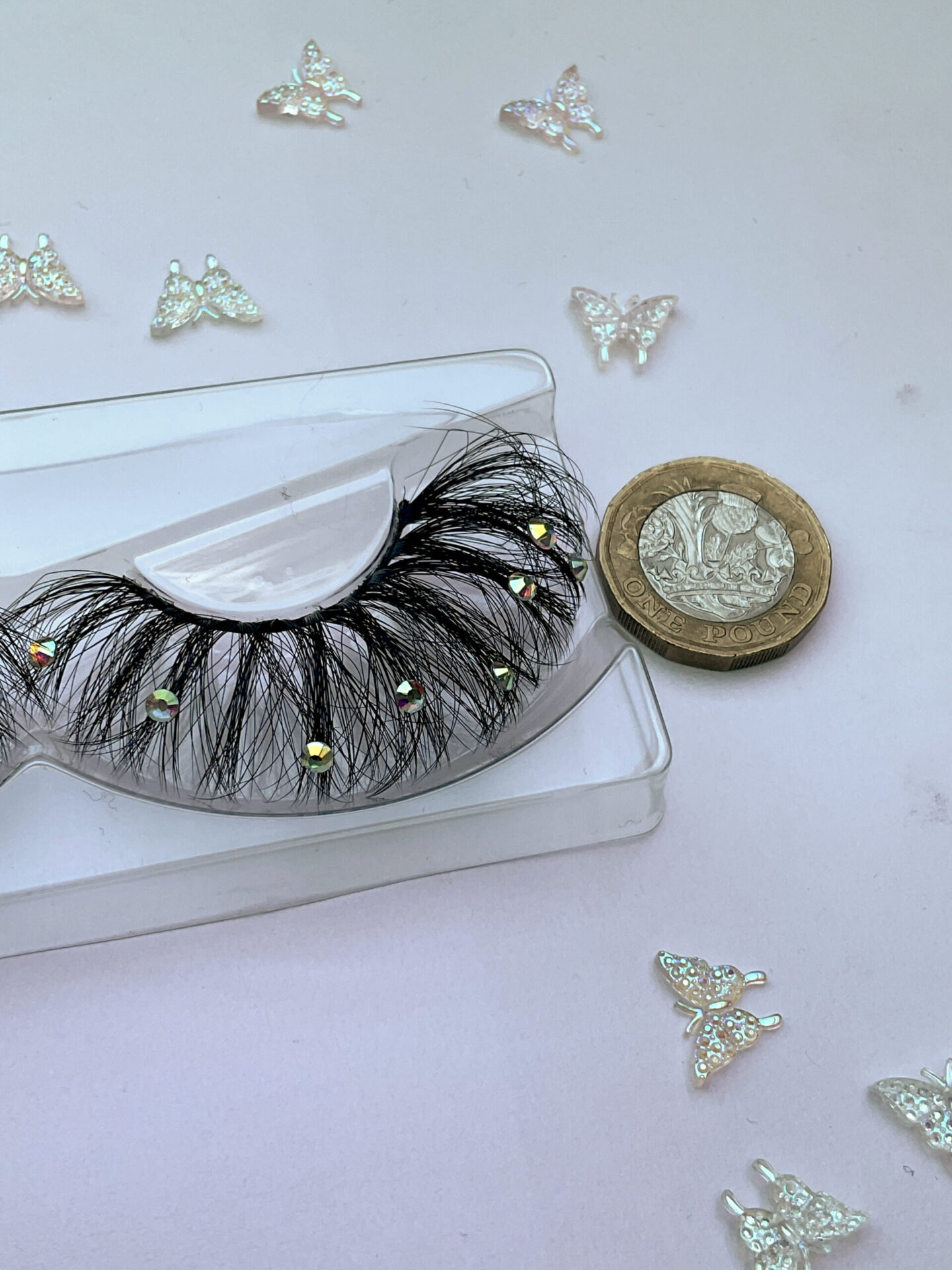 This is Jewel. She is one pair of fabulous 25mm false eyelashes, in black with a load of AB iridescent crystals or diamanté on them. Each lash set is different.