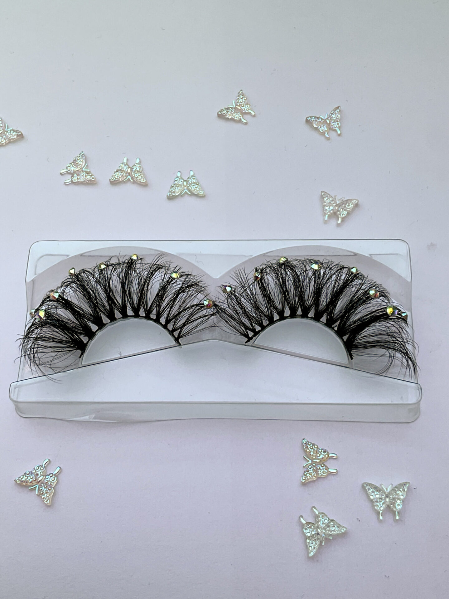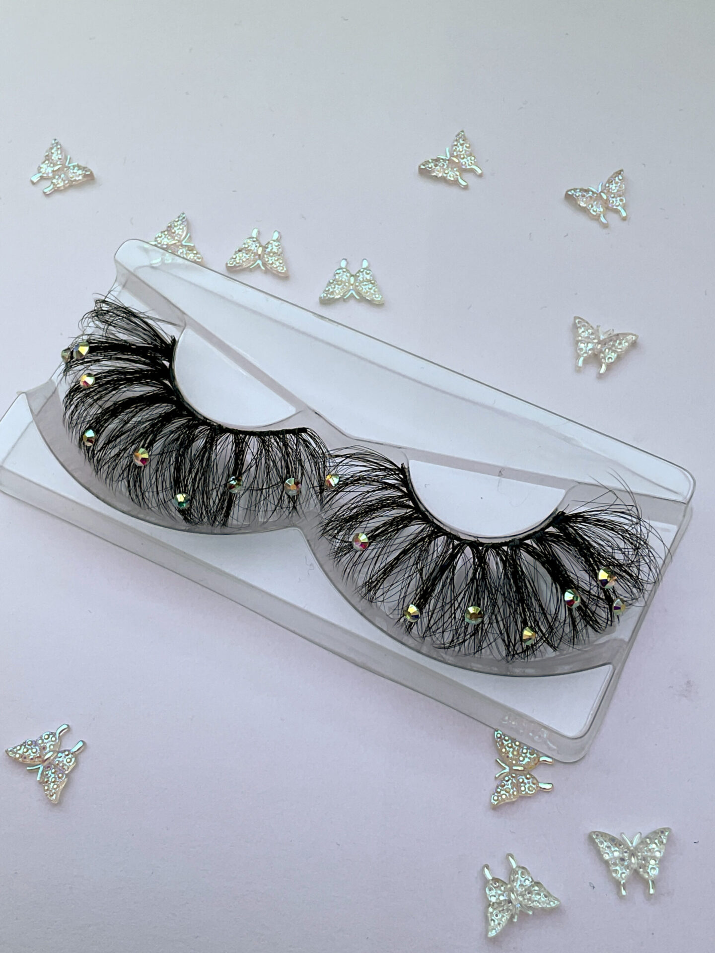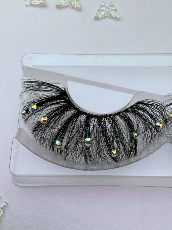 This is Jewel. She is one pair of fabulous 25mm false eyelashes, in black with a load of AB iridescent crystals or diamanté on them. Each lash set is different.