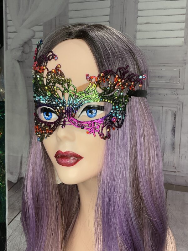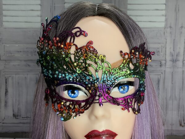 This is our Jewel Rainbow Mask “The Peacock”. Really festive and fun for a seasonal look. Order fast to get them before Christmas (UK only).