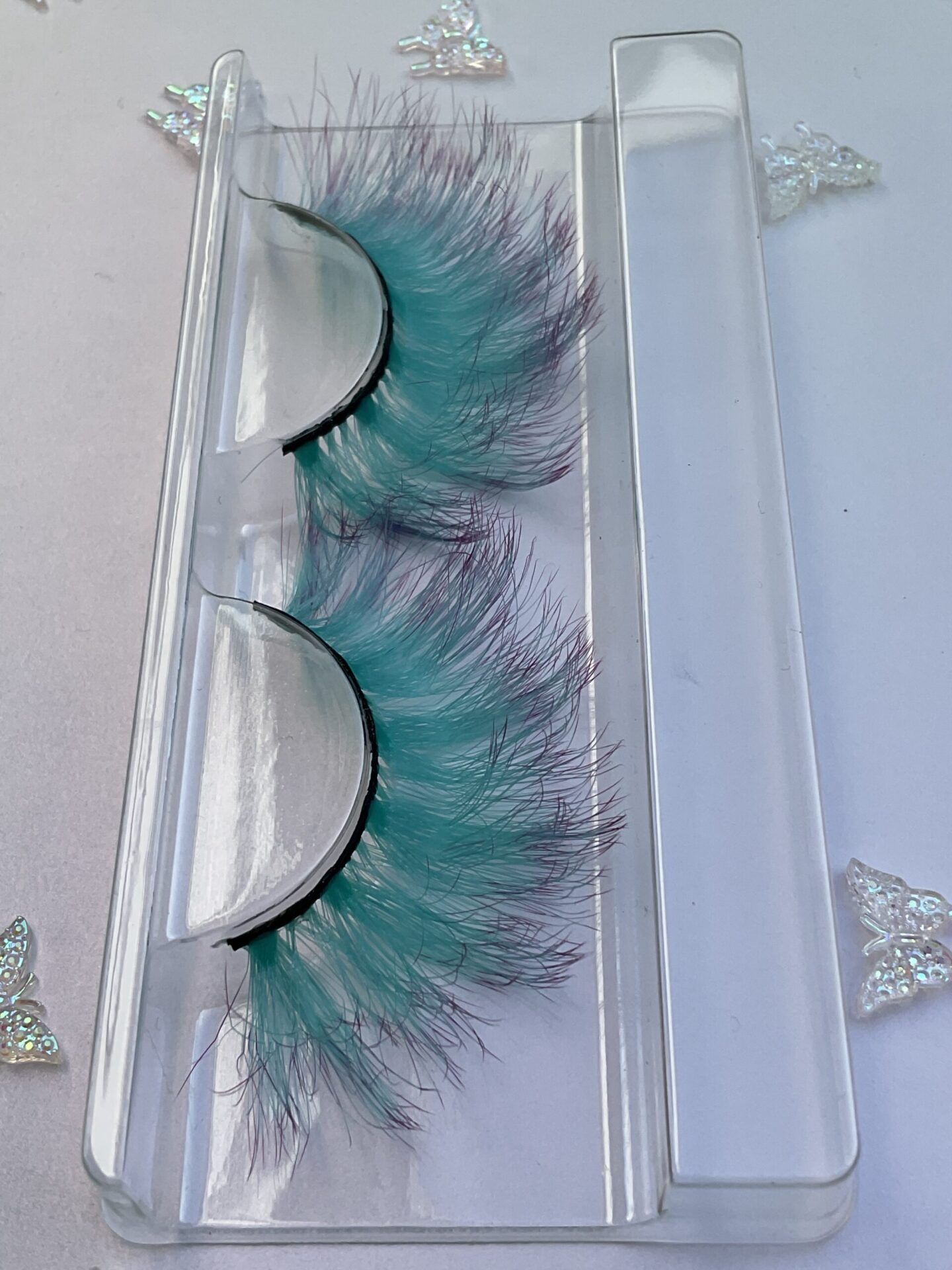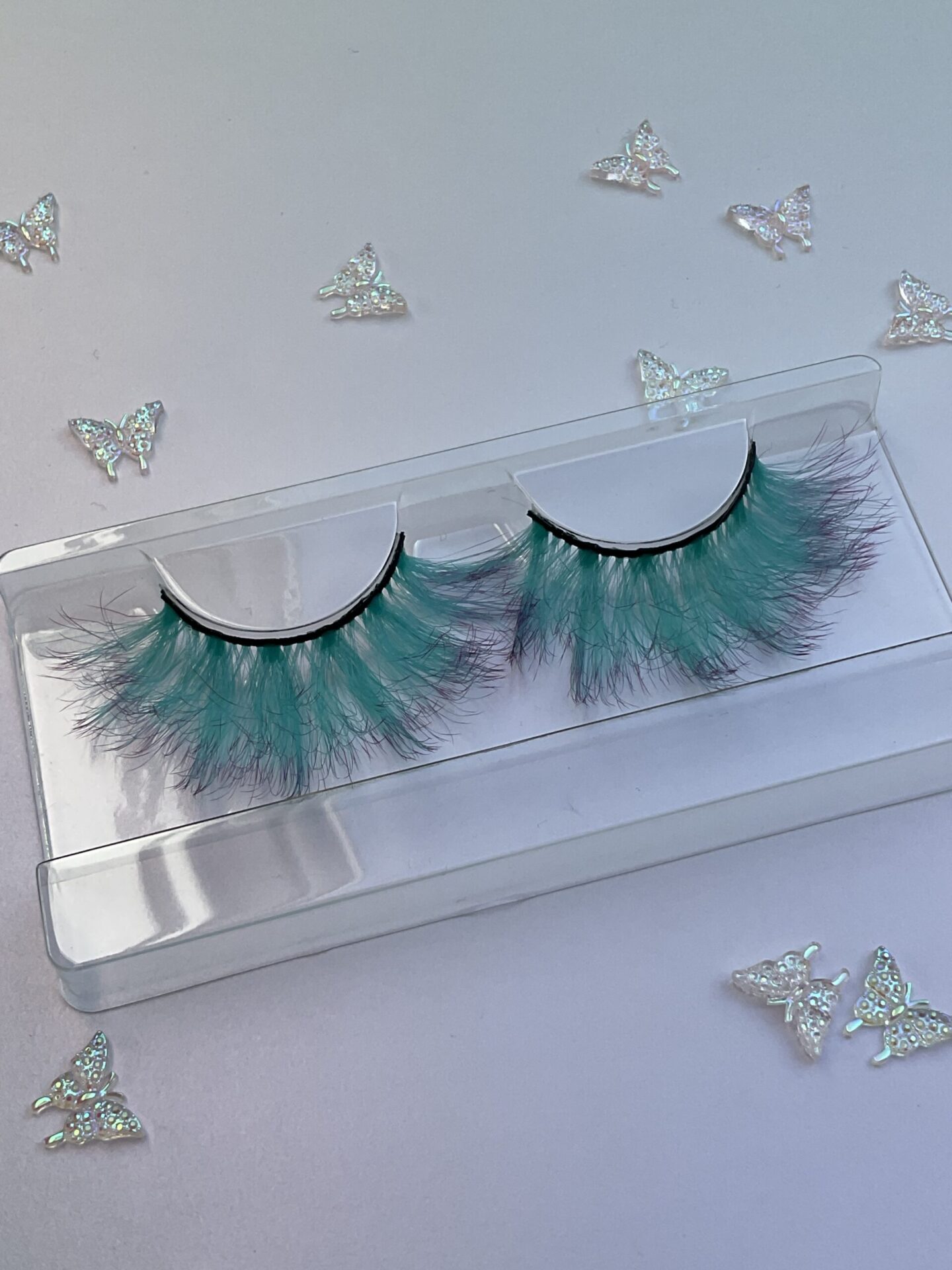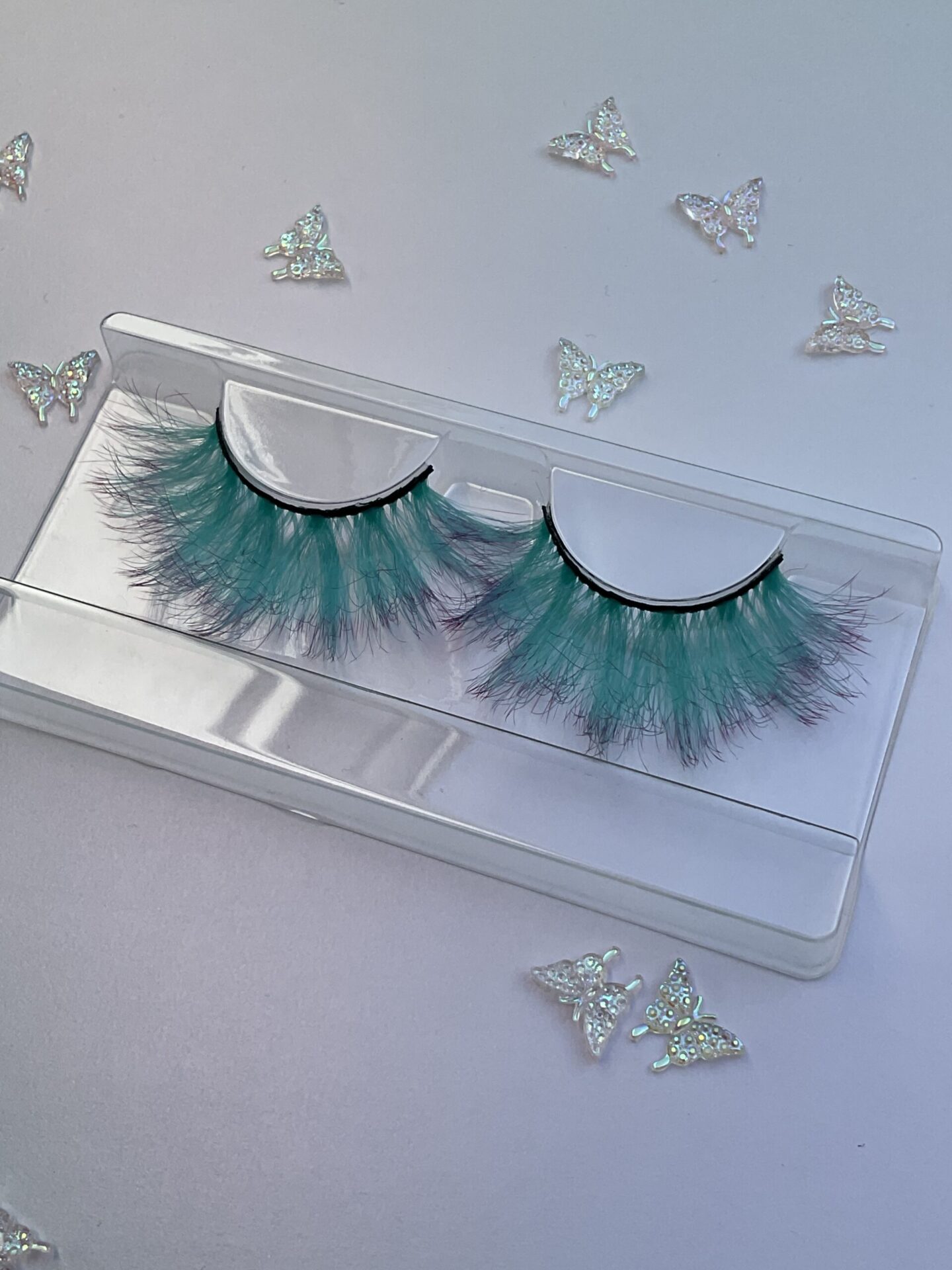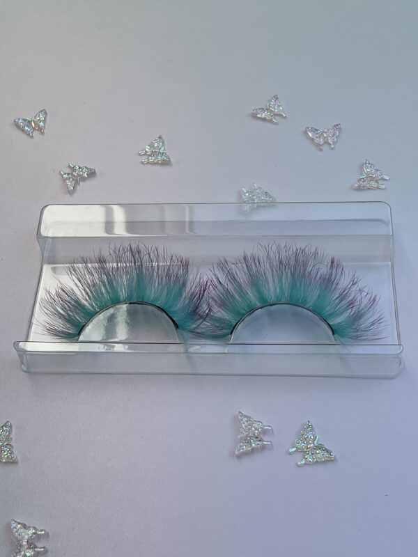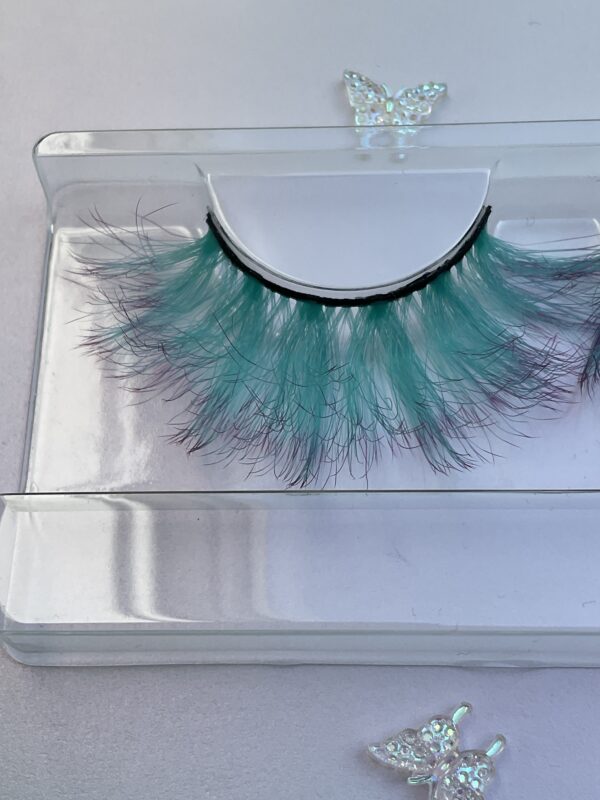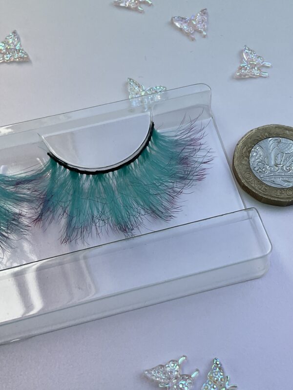 This is Leone. She is a longer and fuller set of ombré lashes, soft mint green into violet purple tips, a great contrast lash.