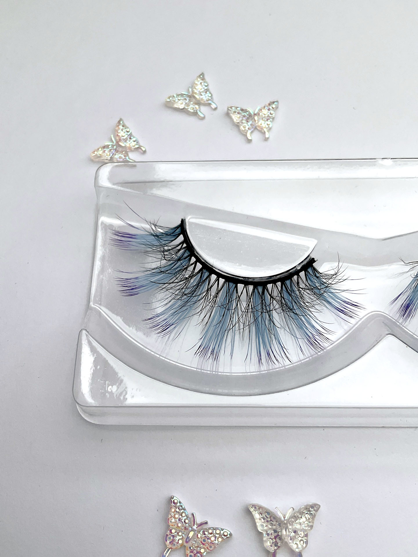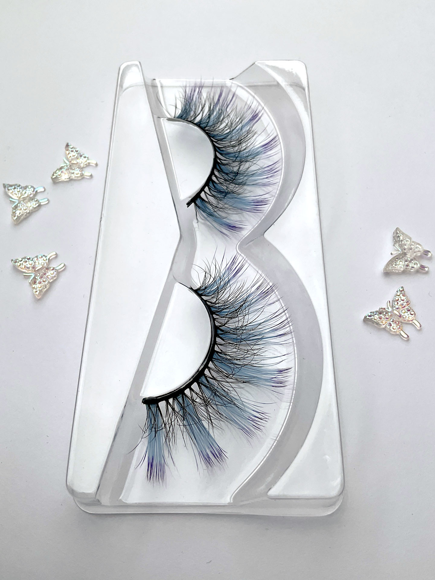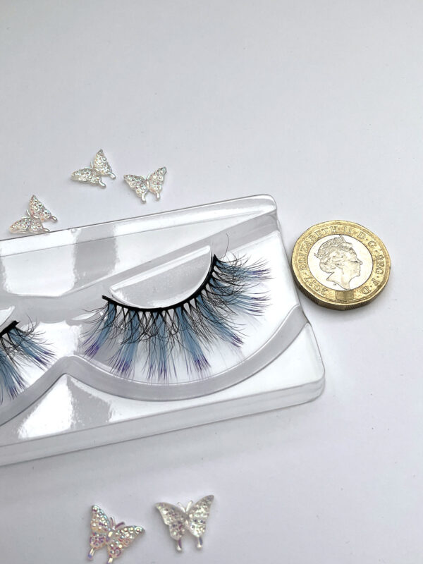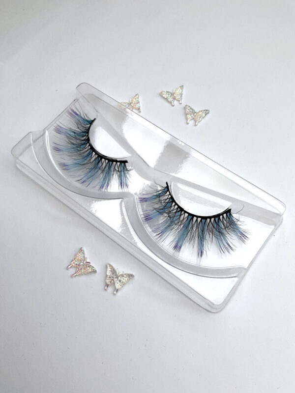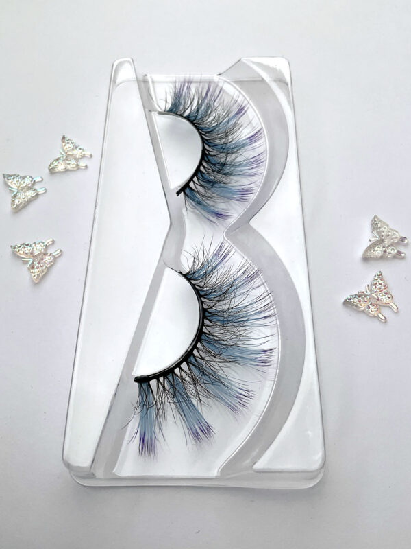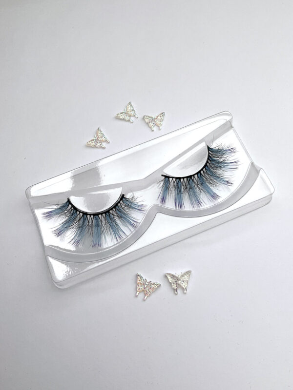 This is Leslie. She is a shorter set of lashes in black with a pale blue streak at the wing tip.