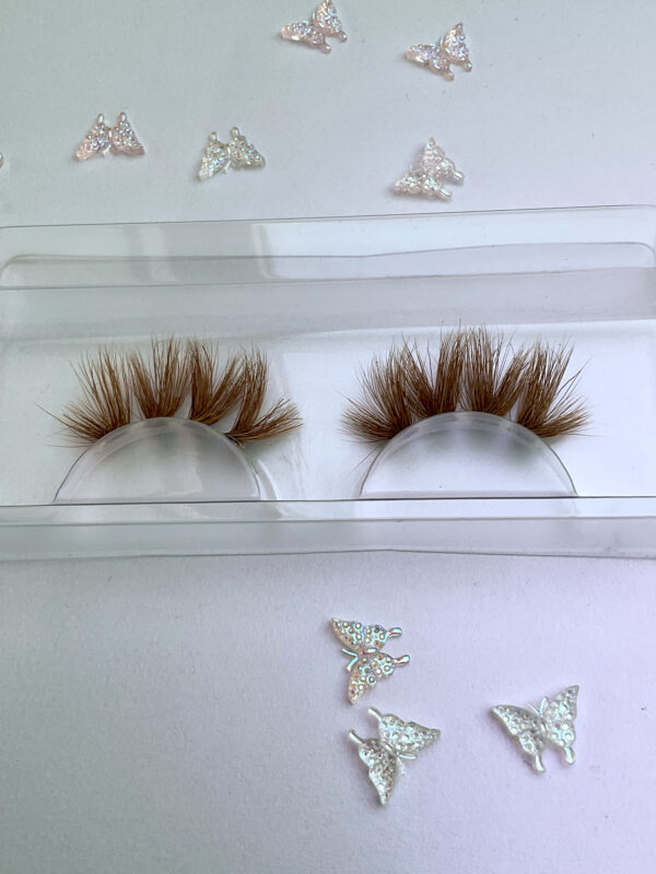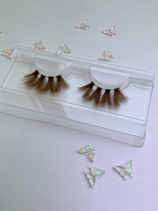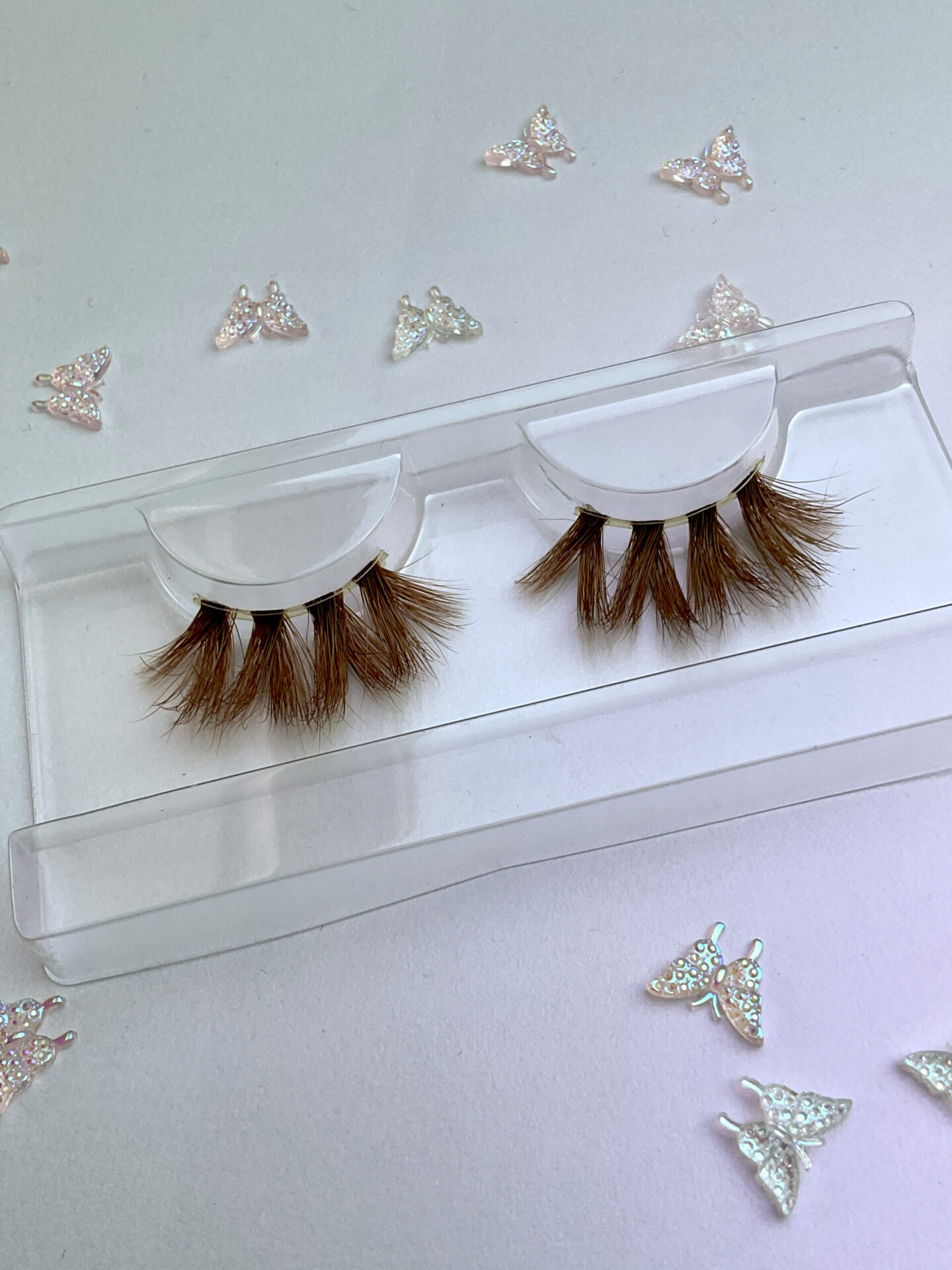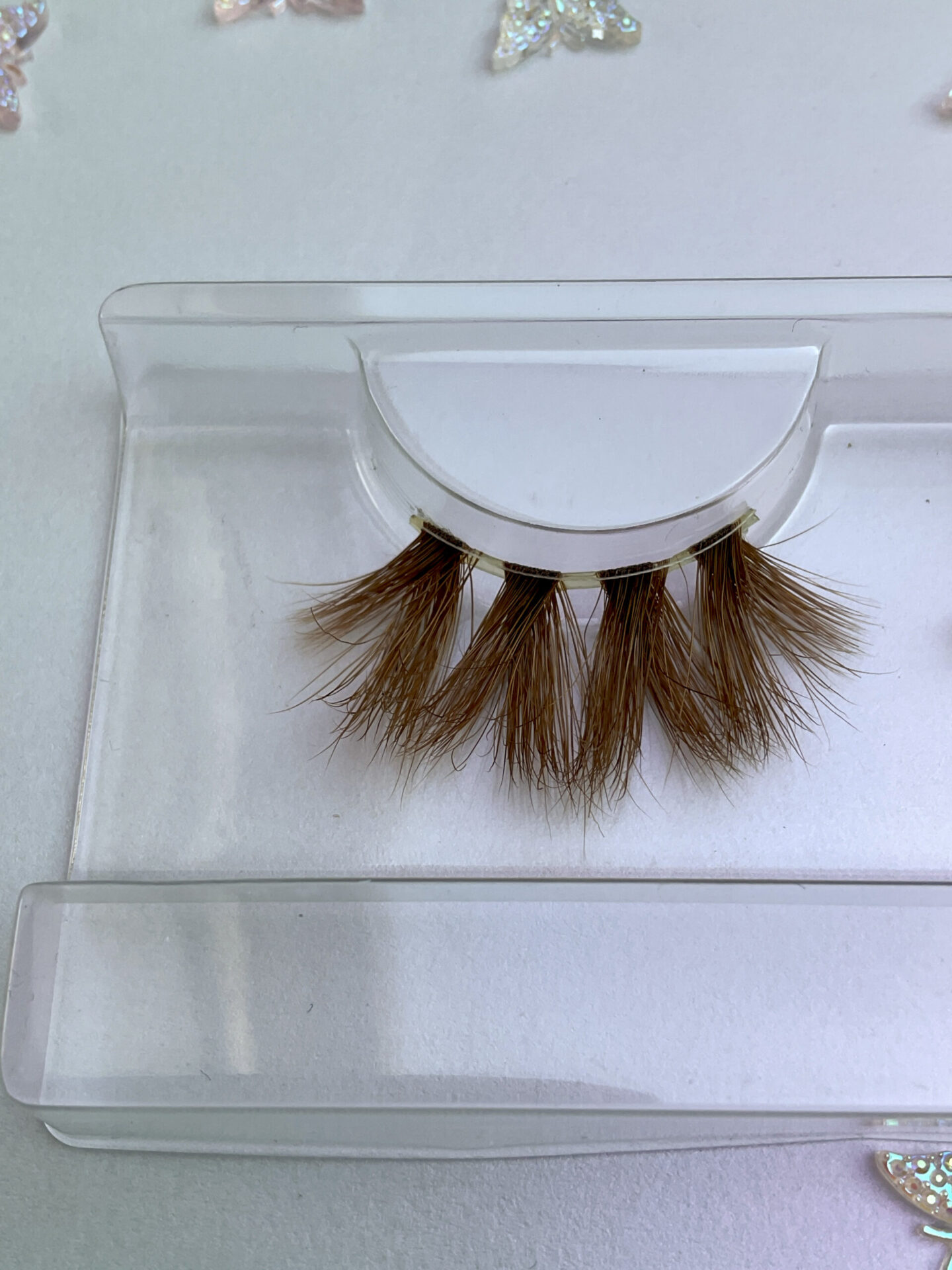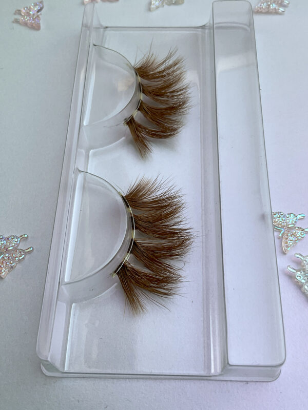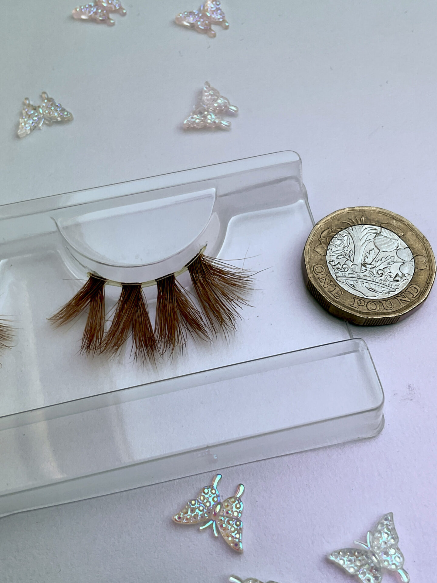 This is Marianne. She is a pretty tan brown semi lash, a great contrast lash, fab worn with red or light brown hair. A semi lash is a shorter lash band that normally sits towards the outer edge of the lid, but the placement is up to you!