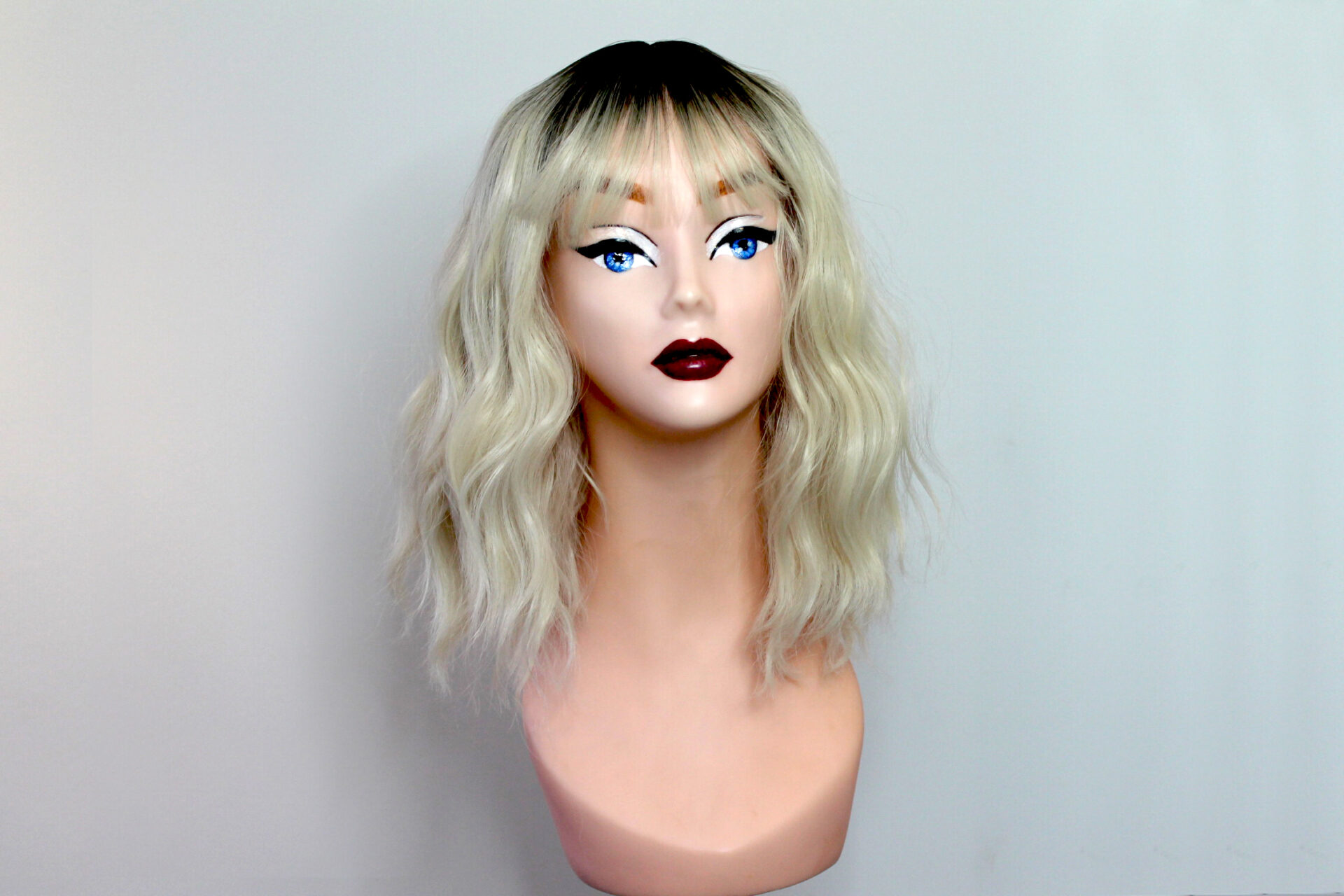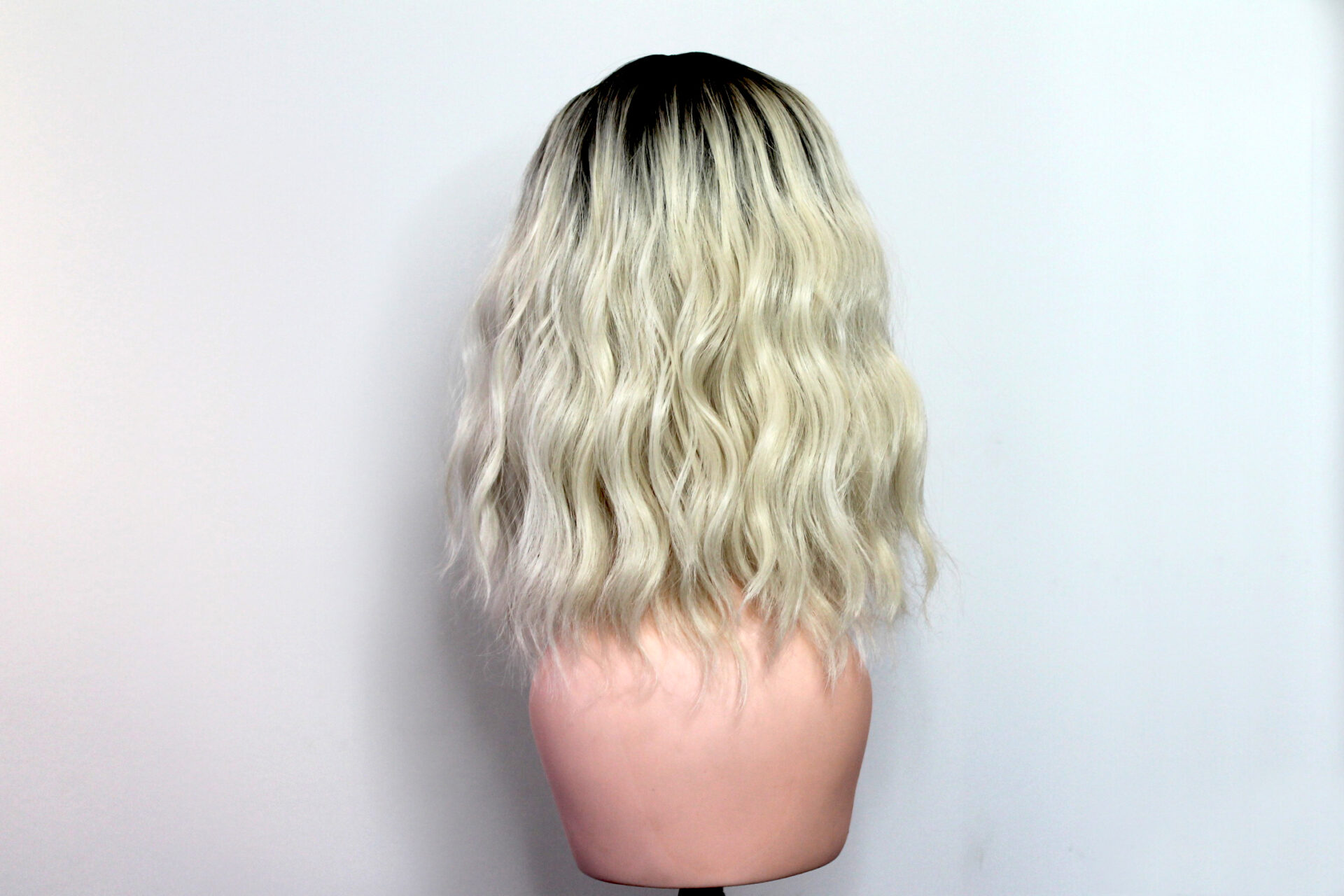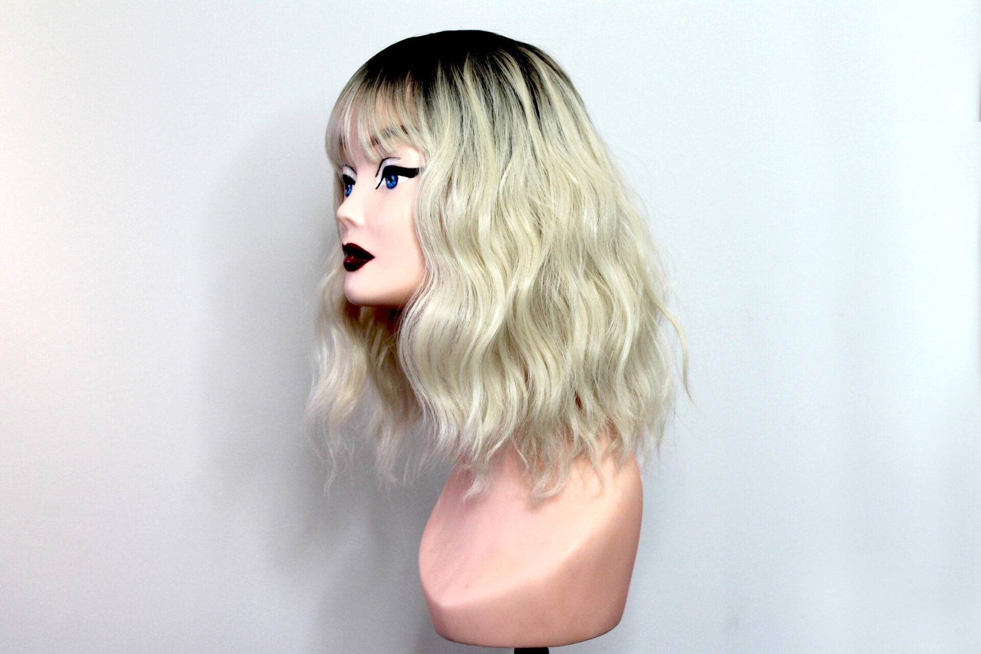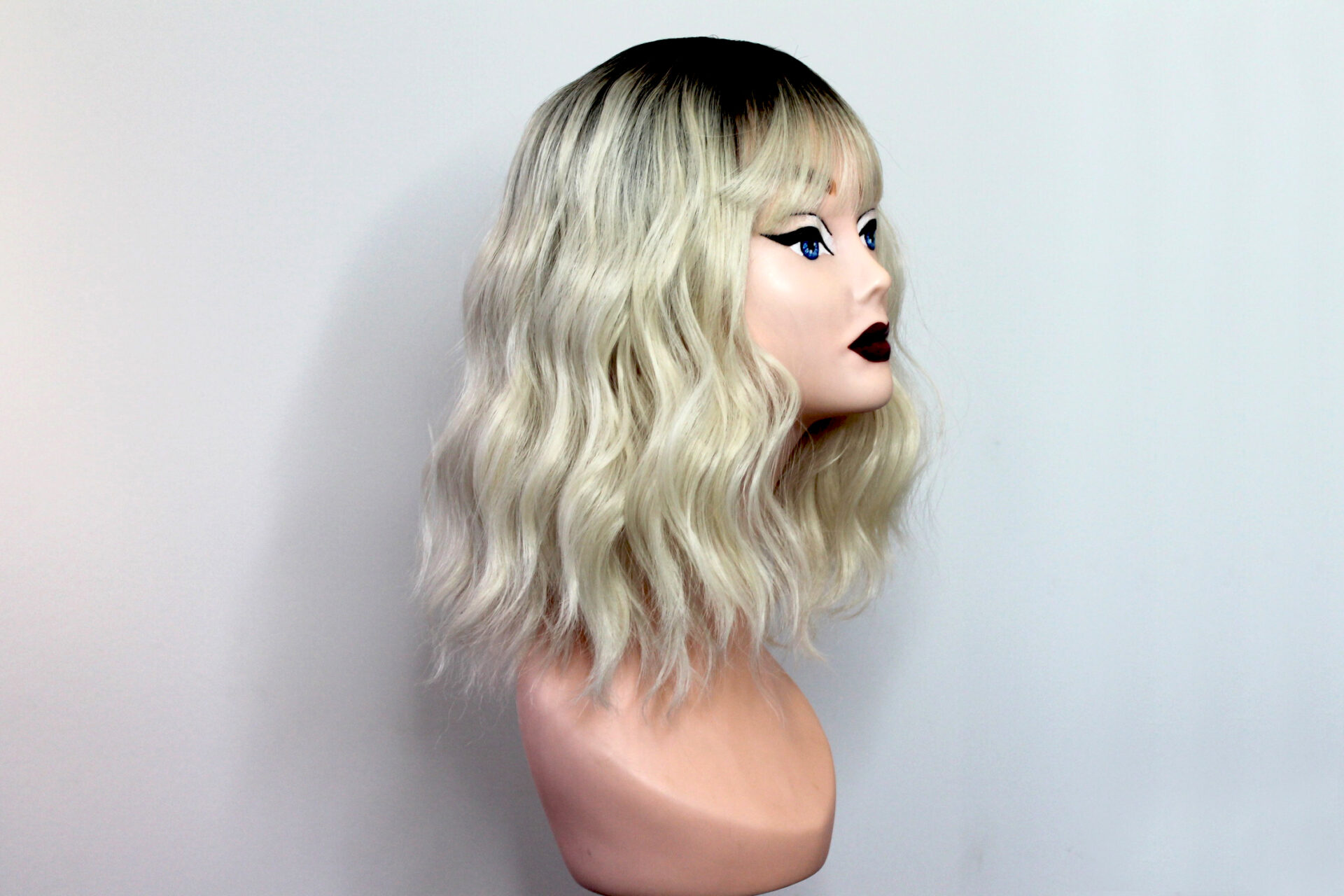 This is Marlene. She is a dark brown rooted blonde ombré in a beach wave curl pattern with a fringe or bangs. Super cute, pretty much shake-n-go.
