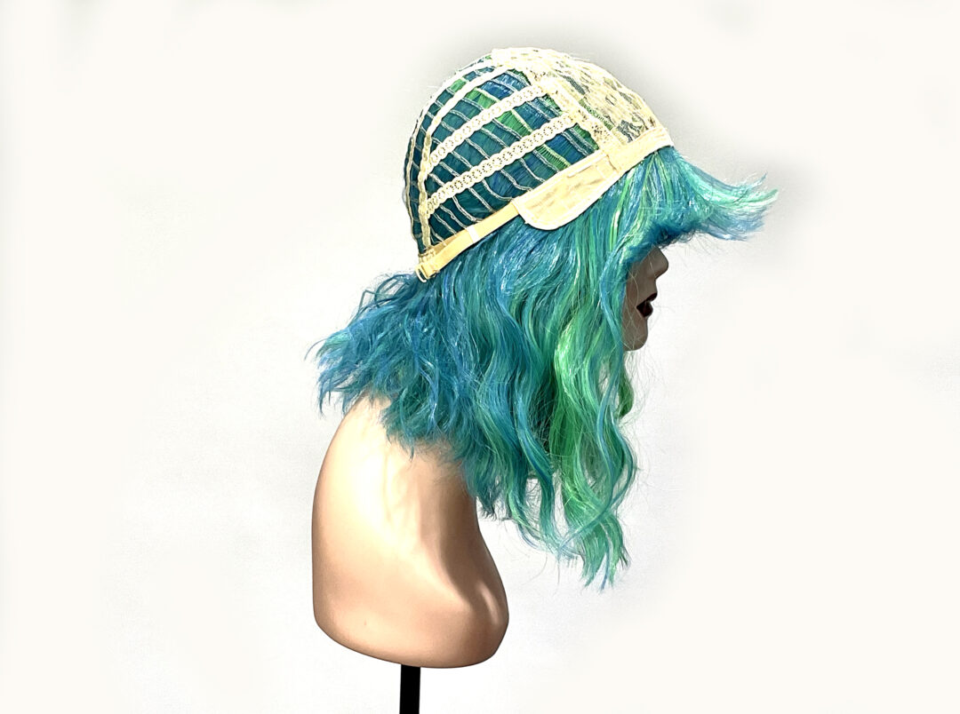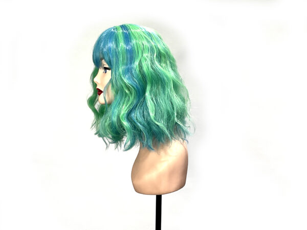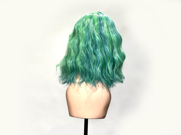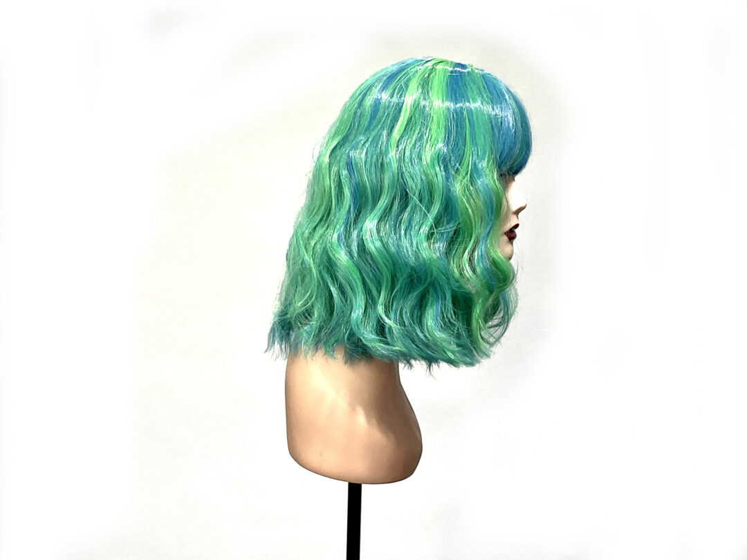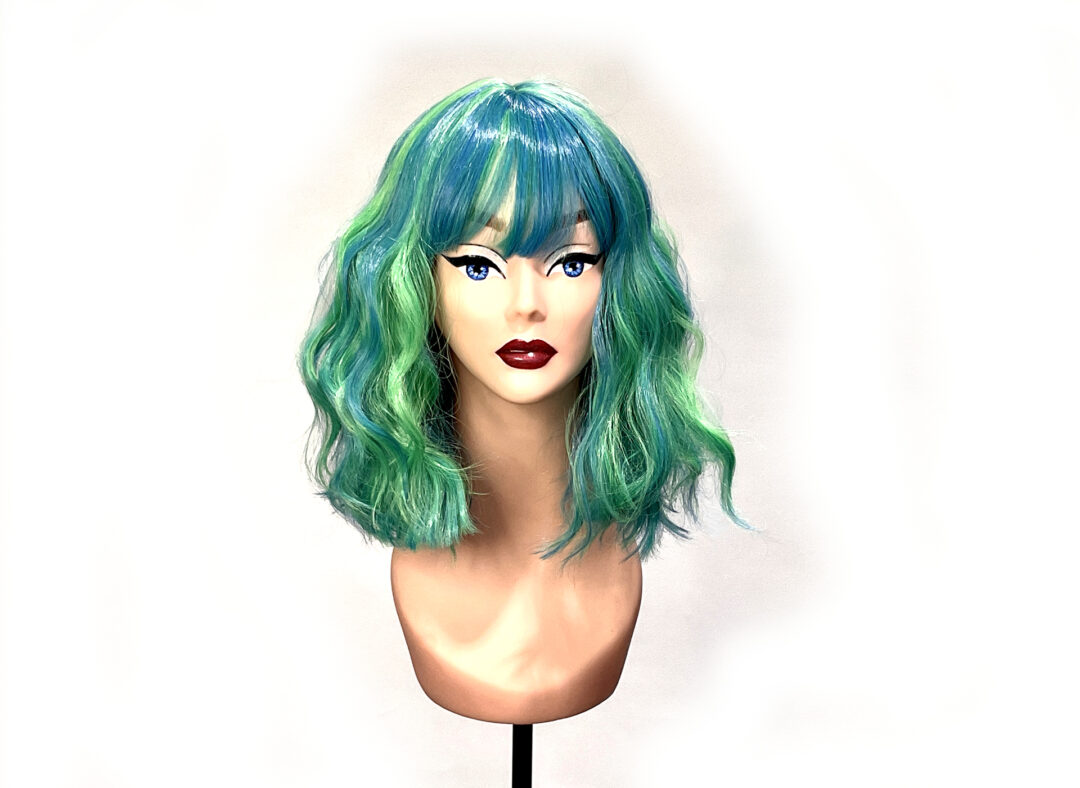 This is Mermaid. She is a funky blue and green streaked beach wave curl pattern hard front wig with a fringe or bangs. Super cute, pretty much shake-n-go. You can trim the fringe to your length or leave it as is.