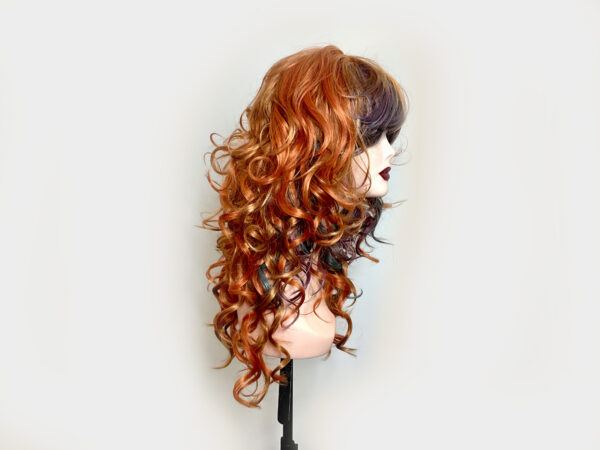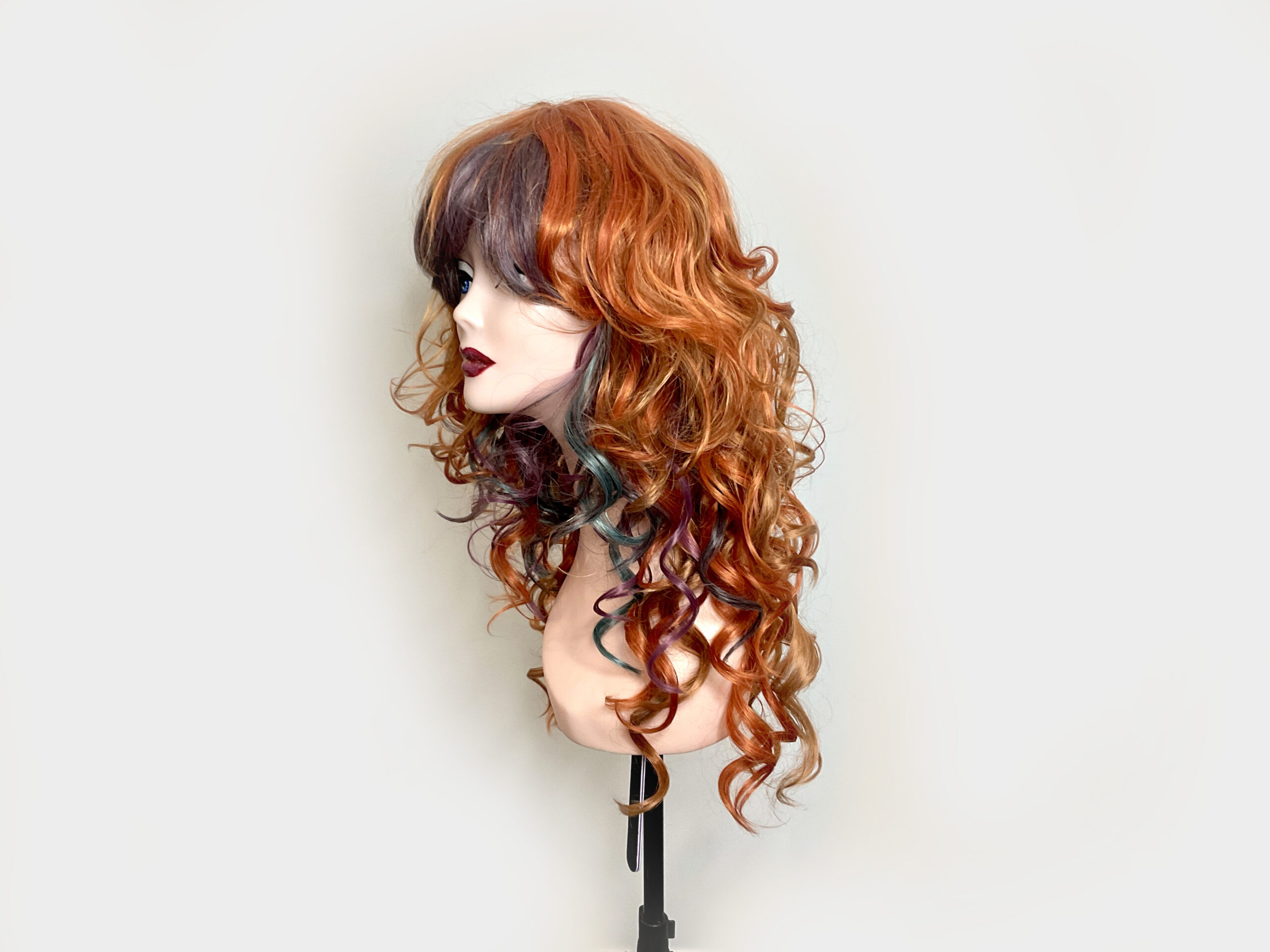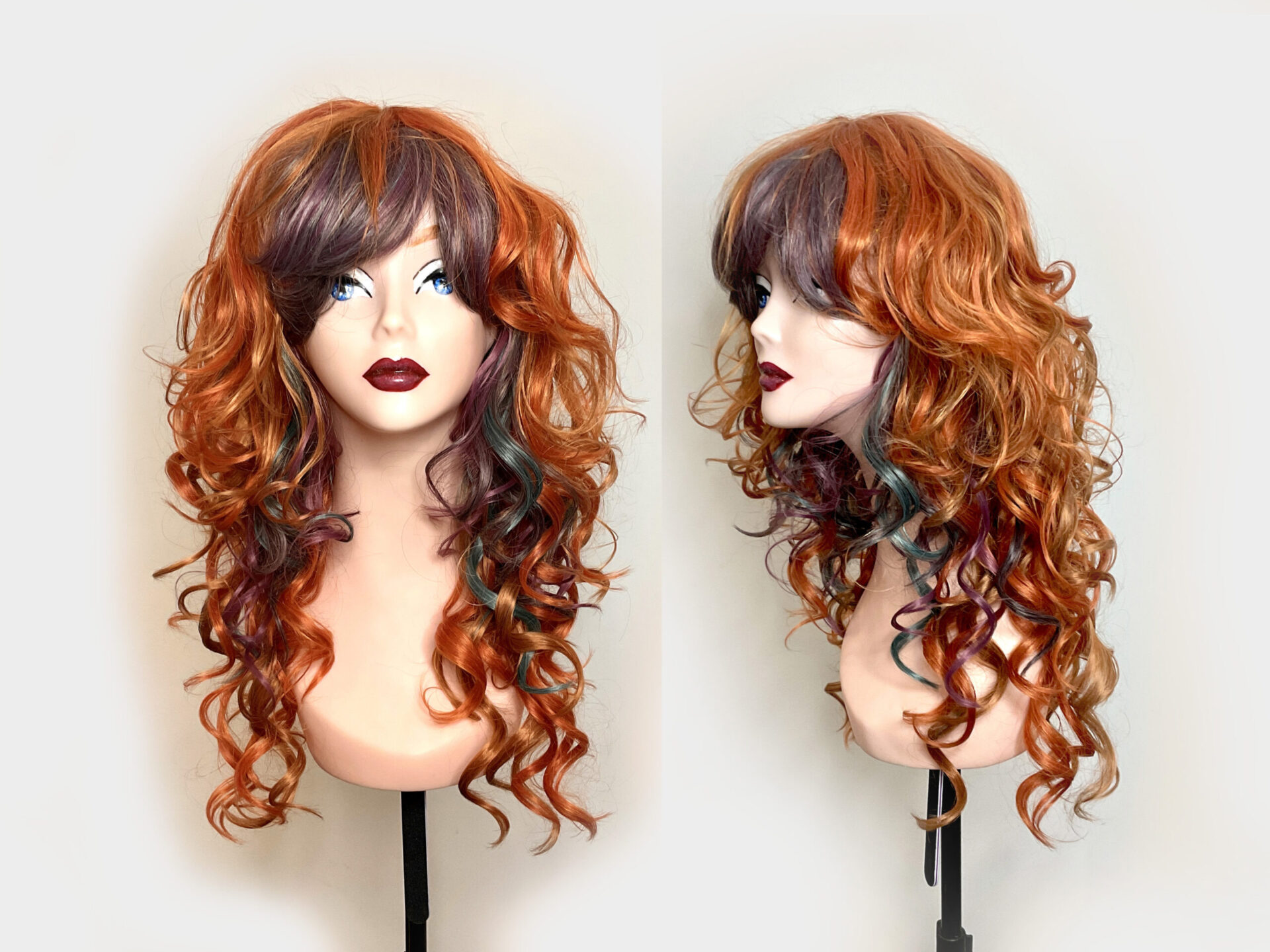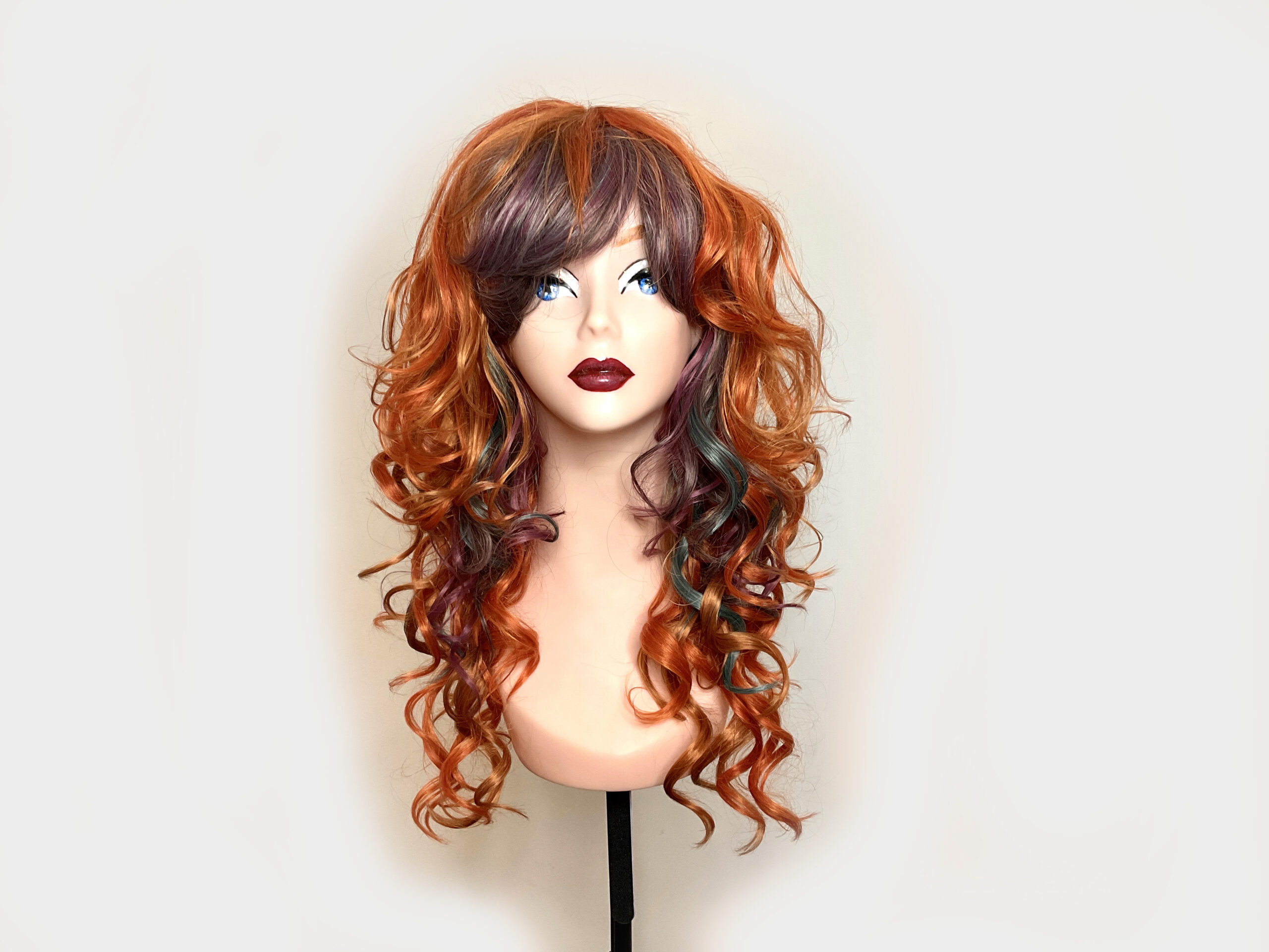 This is Nadia. She is a fun and fabulous reddish auburn hard front wig with a fringe or bangs. She has some lowlights in shades of aubergine purple and teal, pretty much shake-n-go.