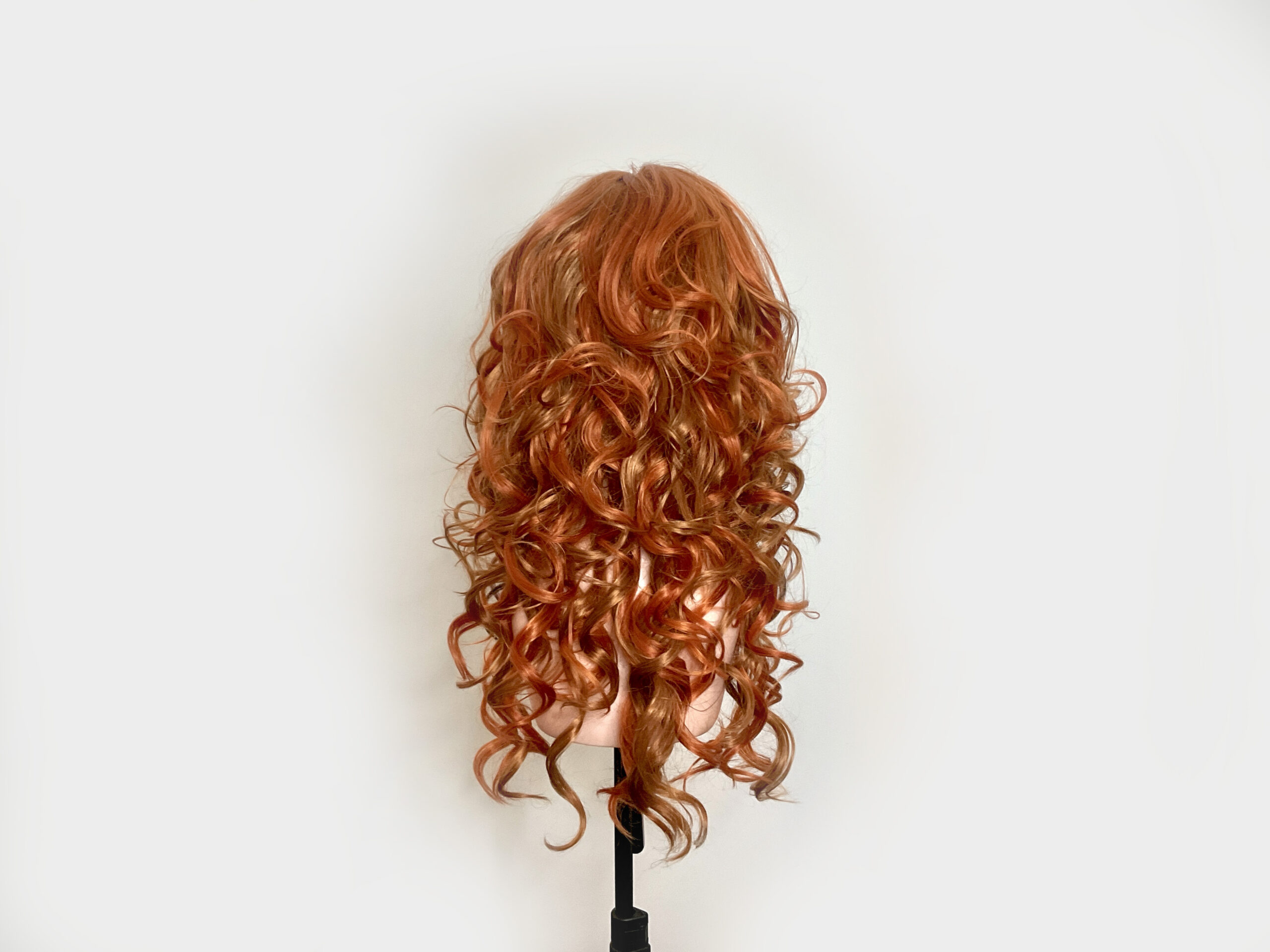 She is beyond shoulder length, with an irregular choppy curl, a hard front wig with lots of potential. 150% density.