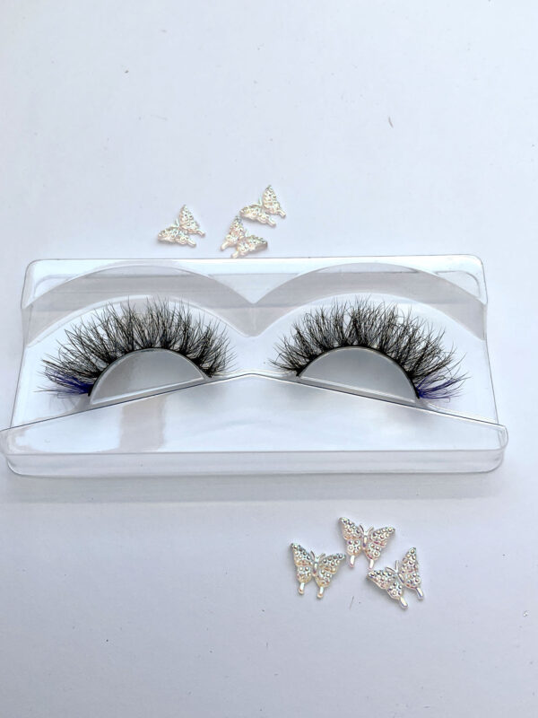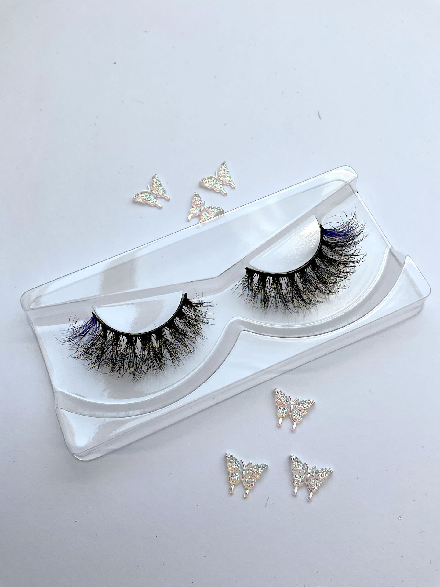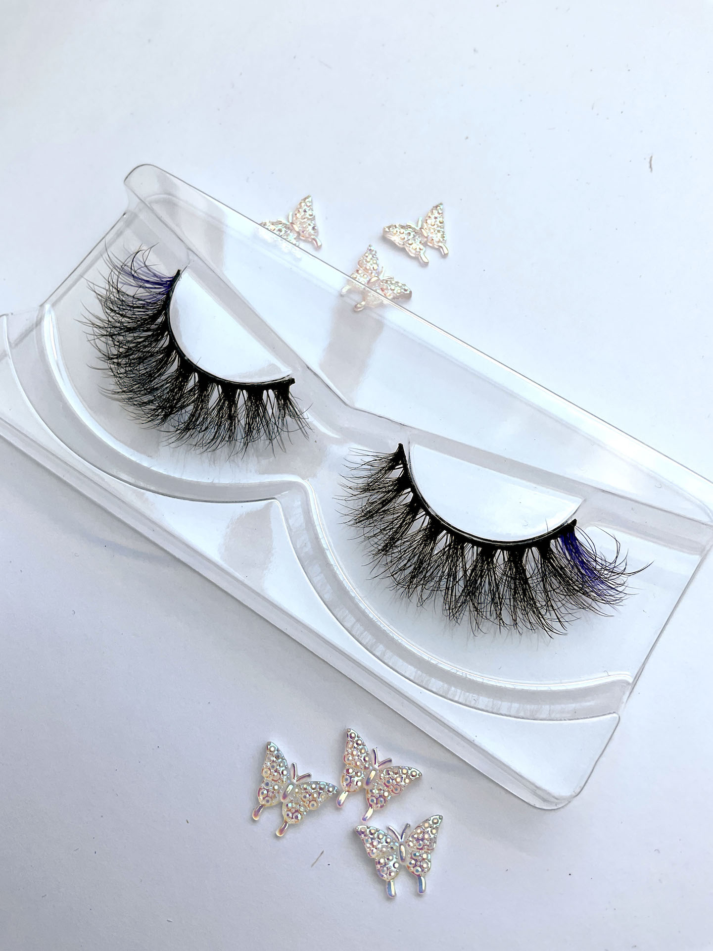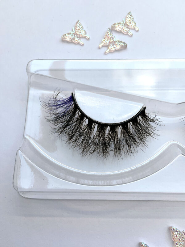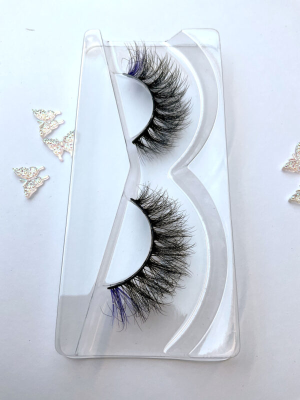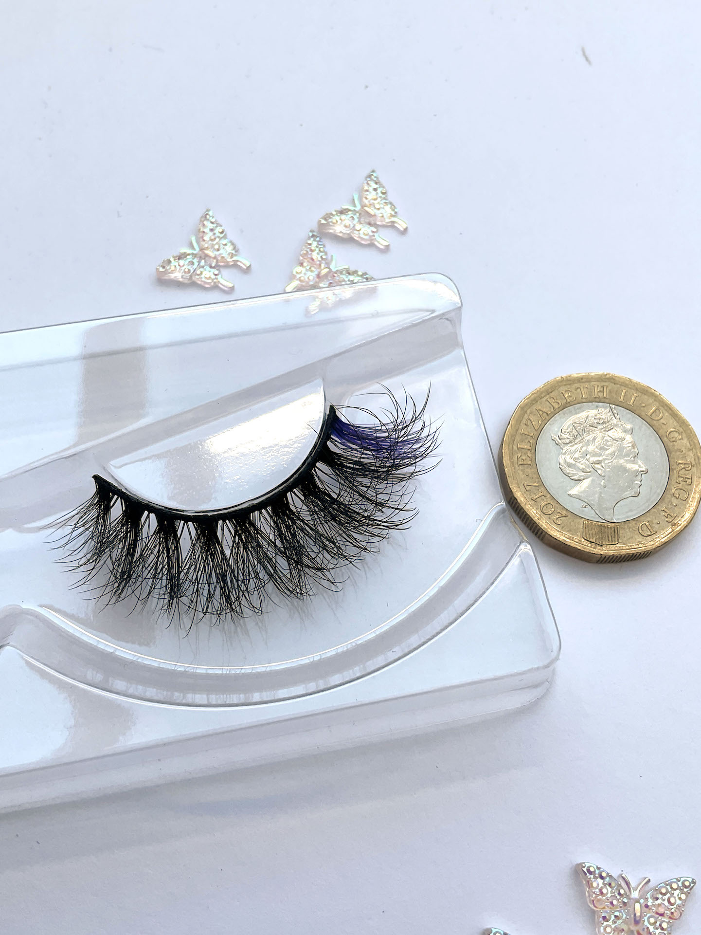 This is Nala. She is one pair of fabulous short and lightly curly 10mm false eyelashes, in black with a purple wing, the lash hairs positioned in a V-formation.
