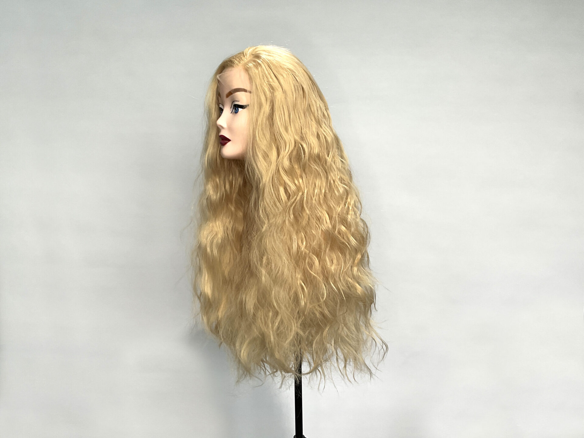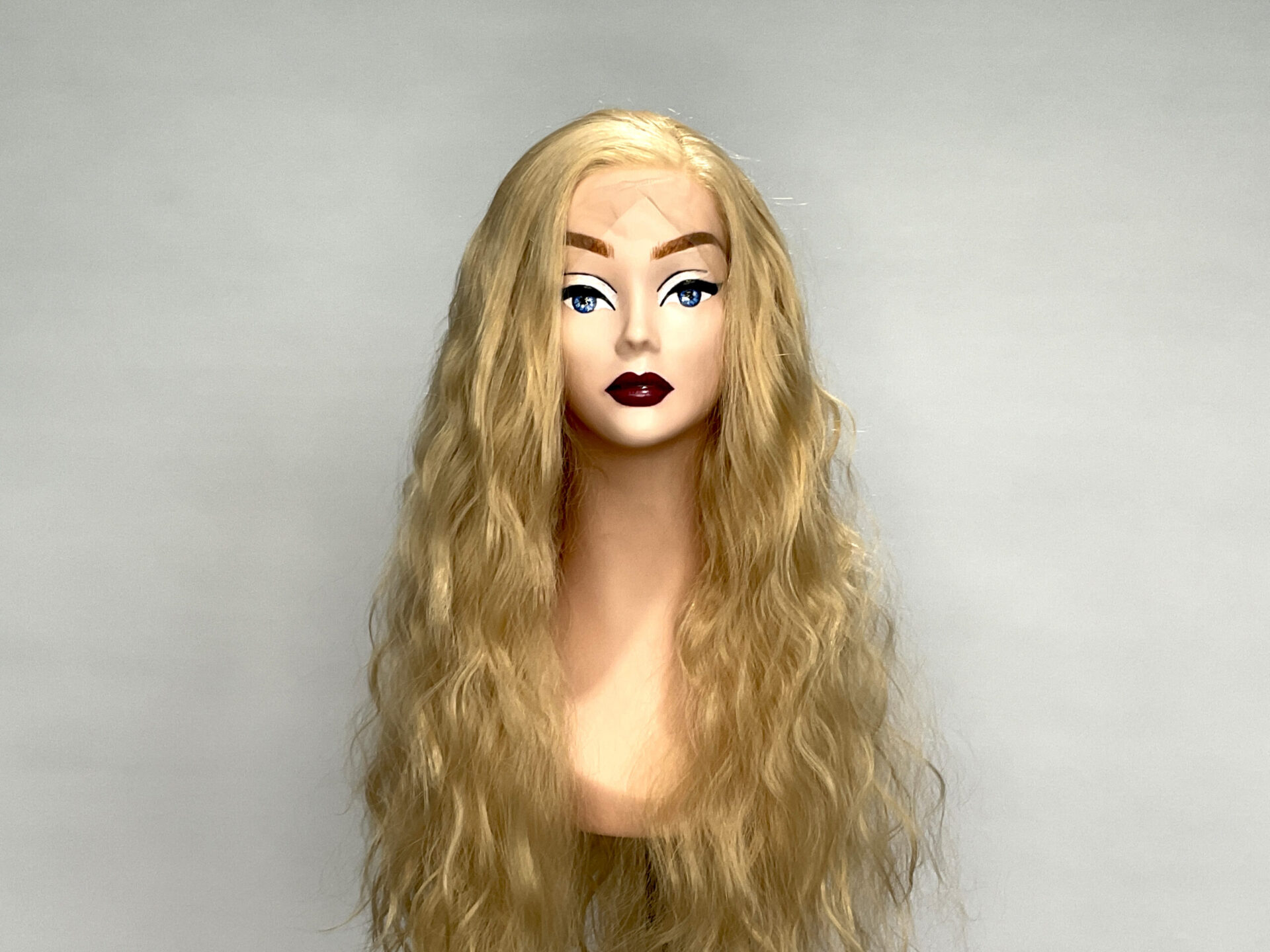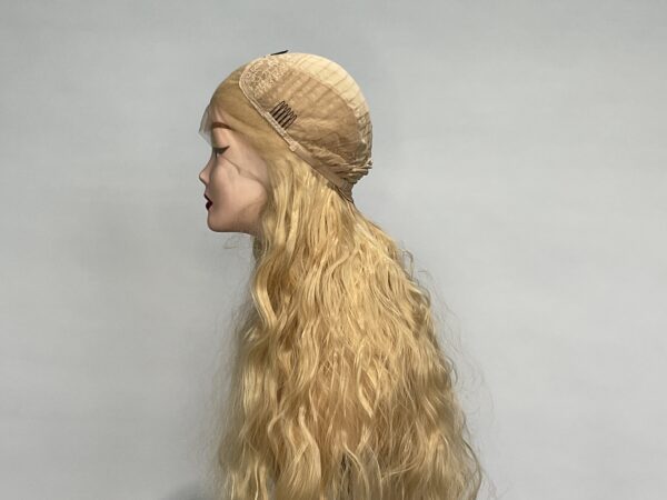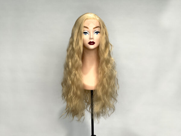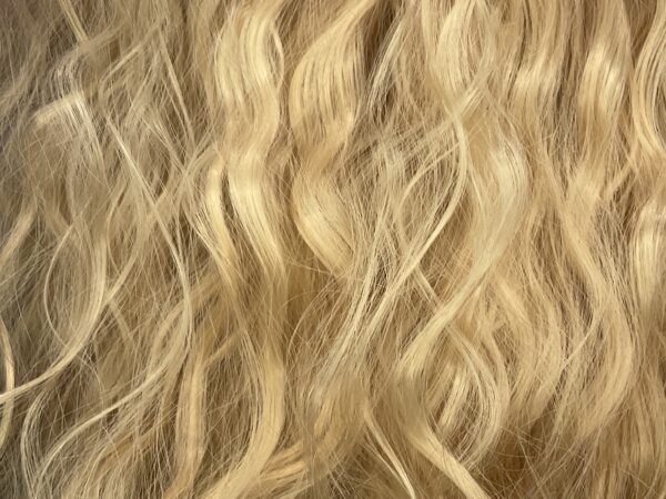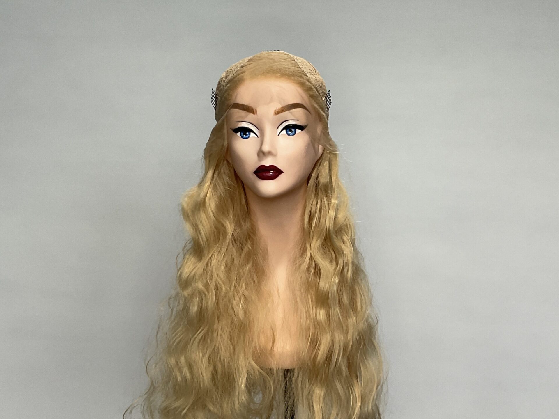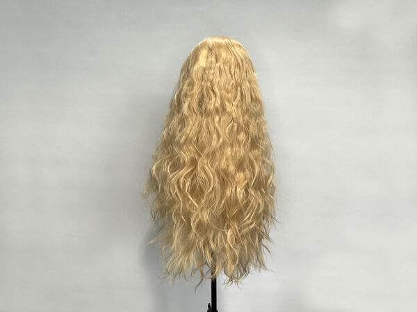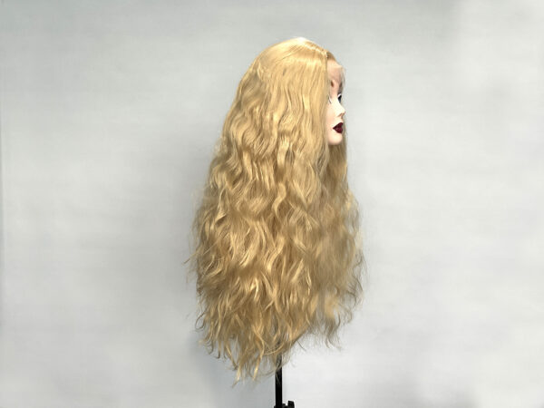 This is Nicole. She is a 26 inches long braided curl half hand tied lace front wig with 1.5-2 inches lace parting space in a pale blonde colour. Inspired by Nicole Kidman in “Nine Perfect Strangers”. The lace is a transparent light beige, best suited for lighter skin but can be coloured with foundation. 150% density but nice and full.