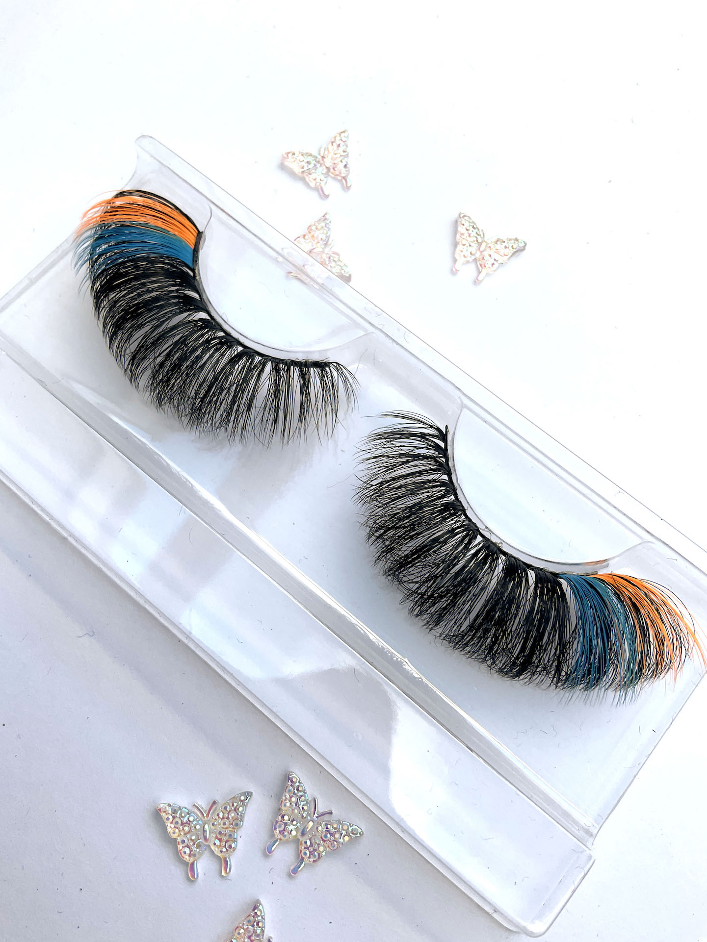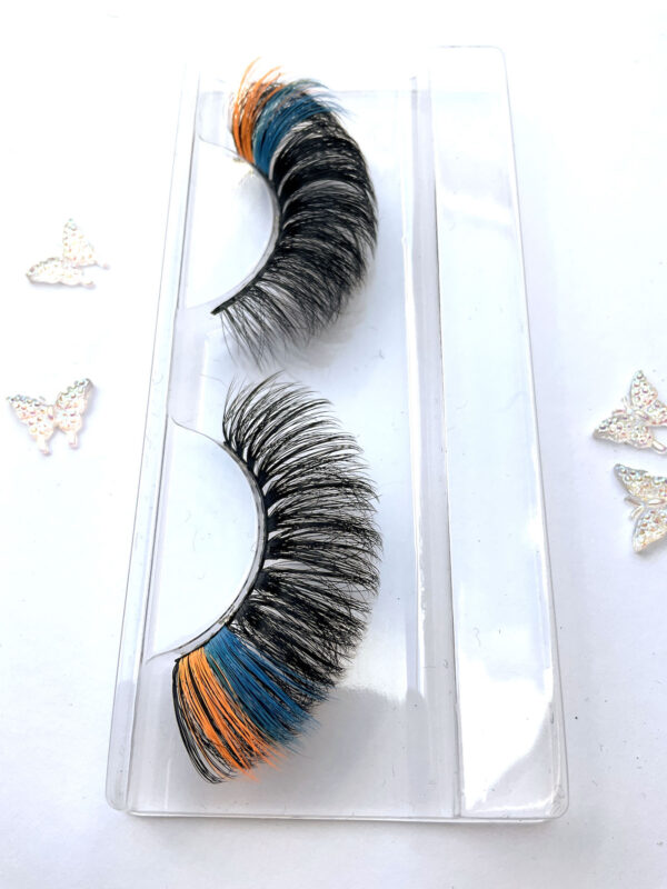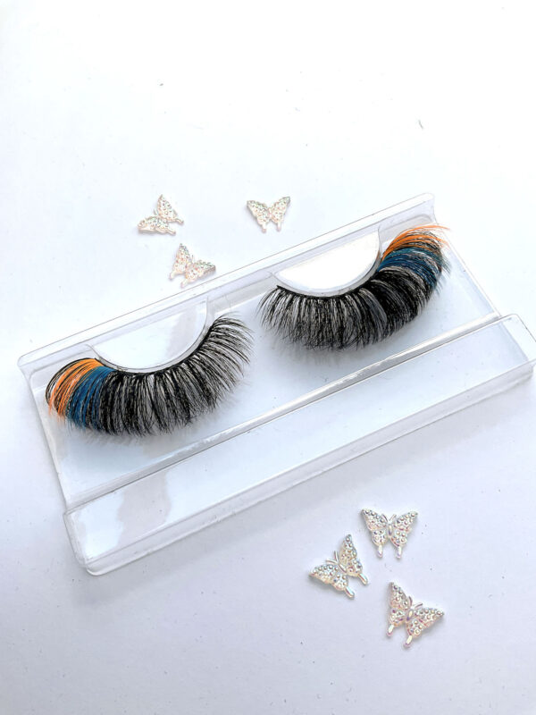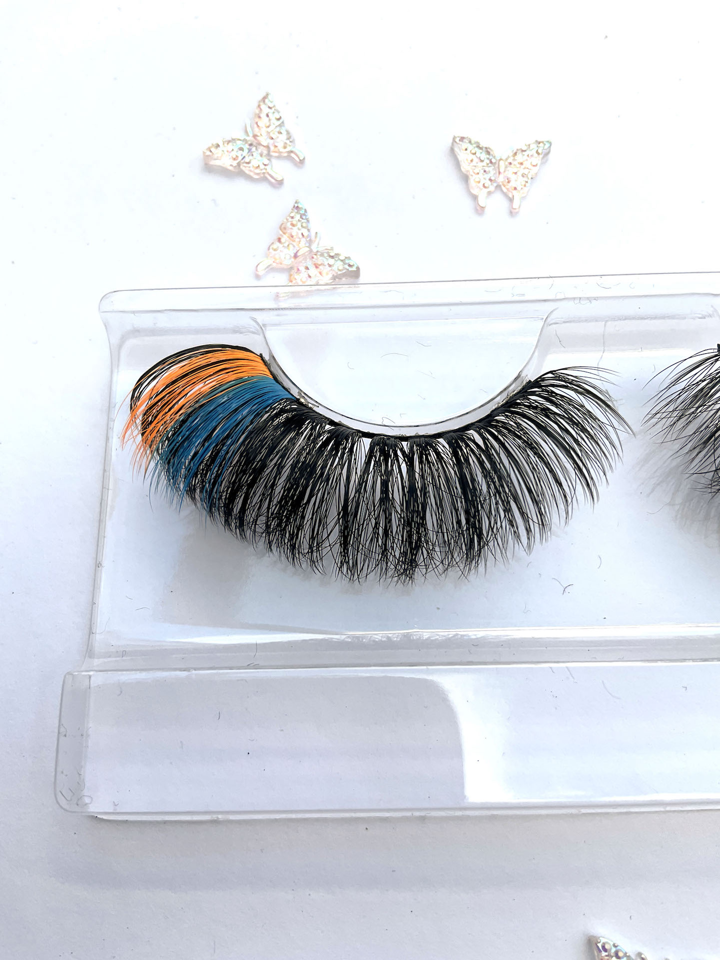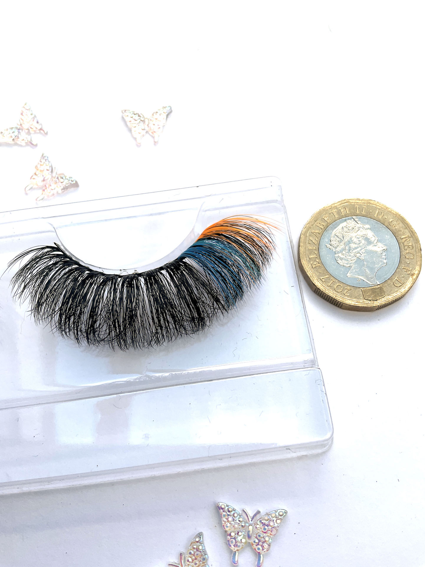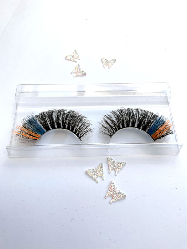 This is No 15. She is one pair of fabulous 20-25mm false eyelashes, in black with a blue and orange tipped wing, attached to the underside of the lash. Make sure to check the images carefully. This wing is also UV reactive and glows under black light.