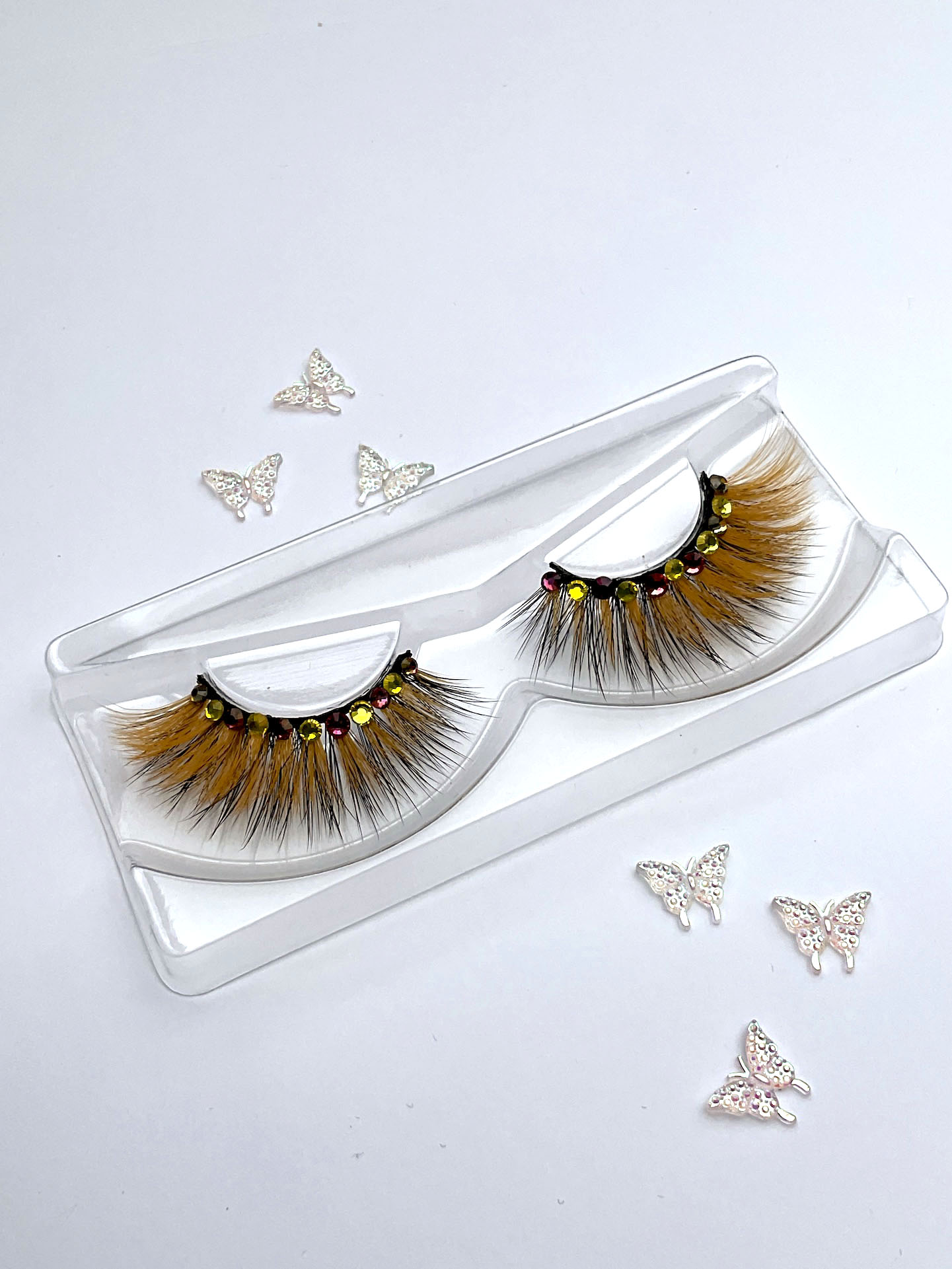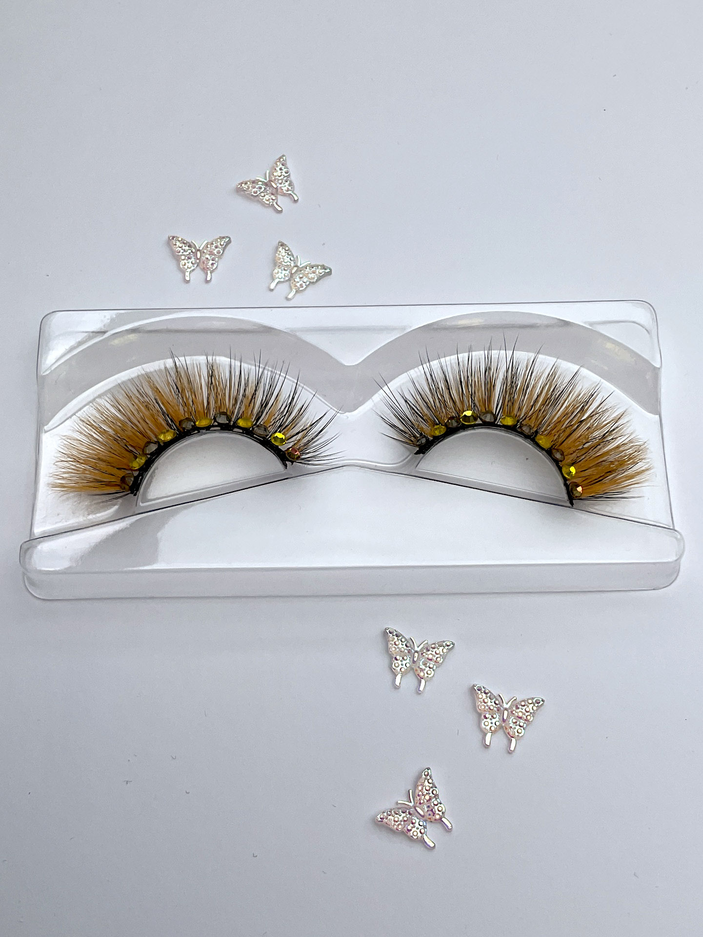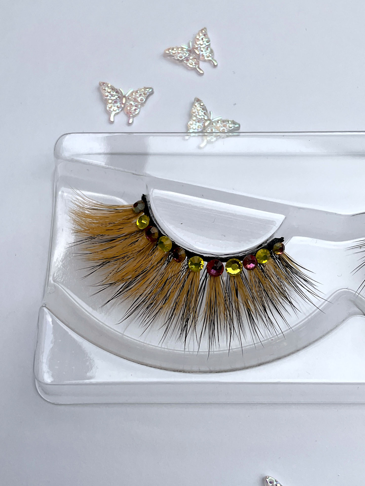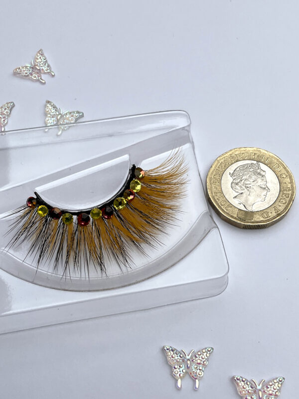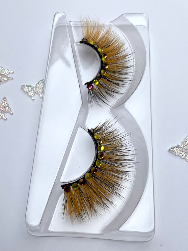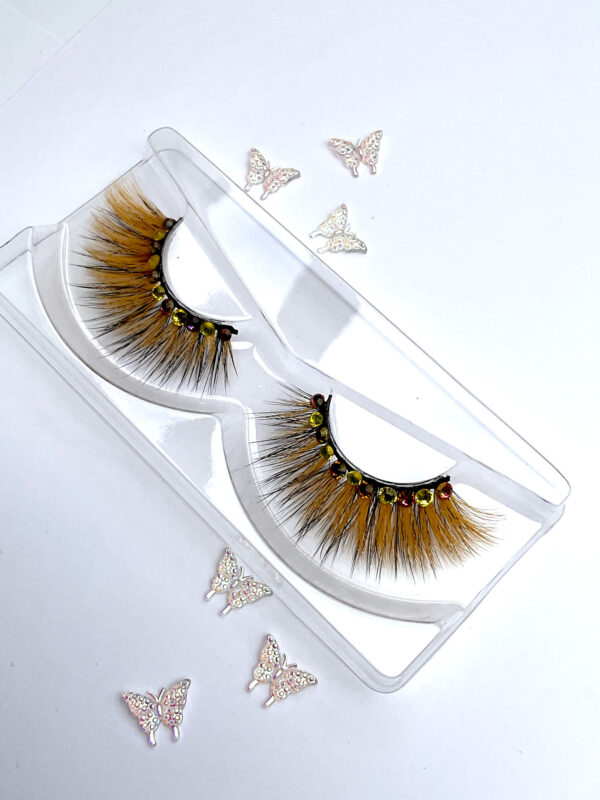 This is a custom hand made set of lashes, made from a pairs of our stacker lashes in orange and a pair of black lashes stacked together, and bedazzled with iridescent pinkish orange and yellow Austrian crystals, about 8-10 per pair! You might need strong eyelids to wear these!