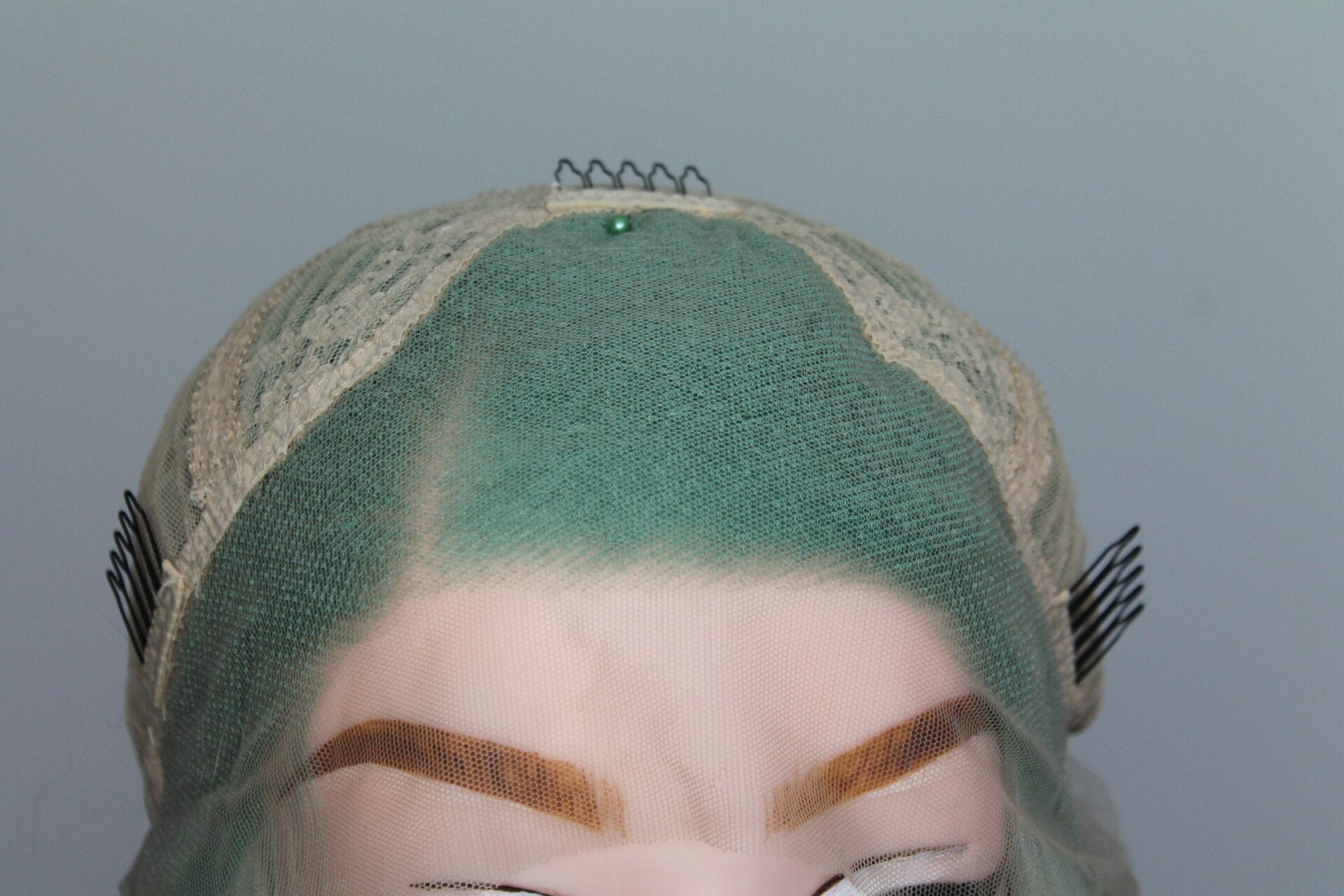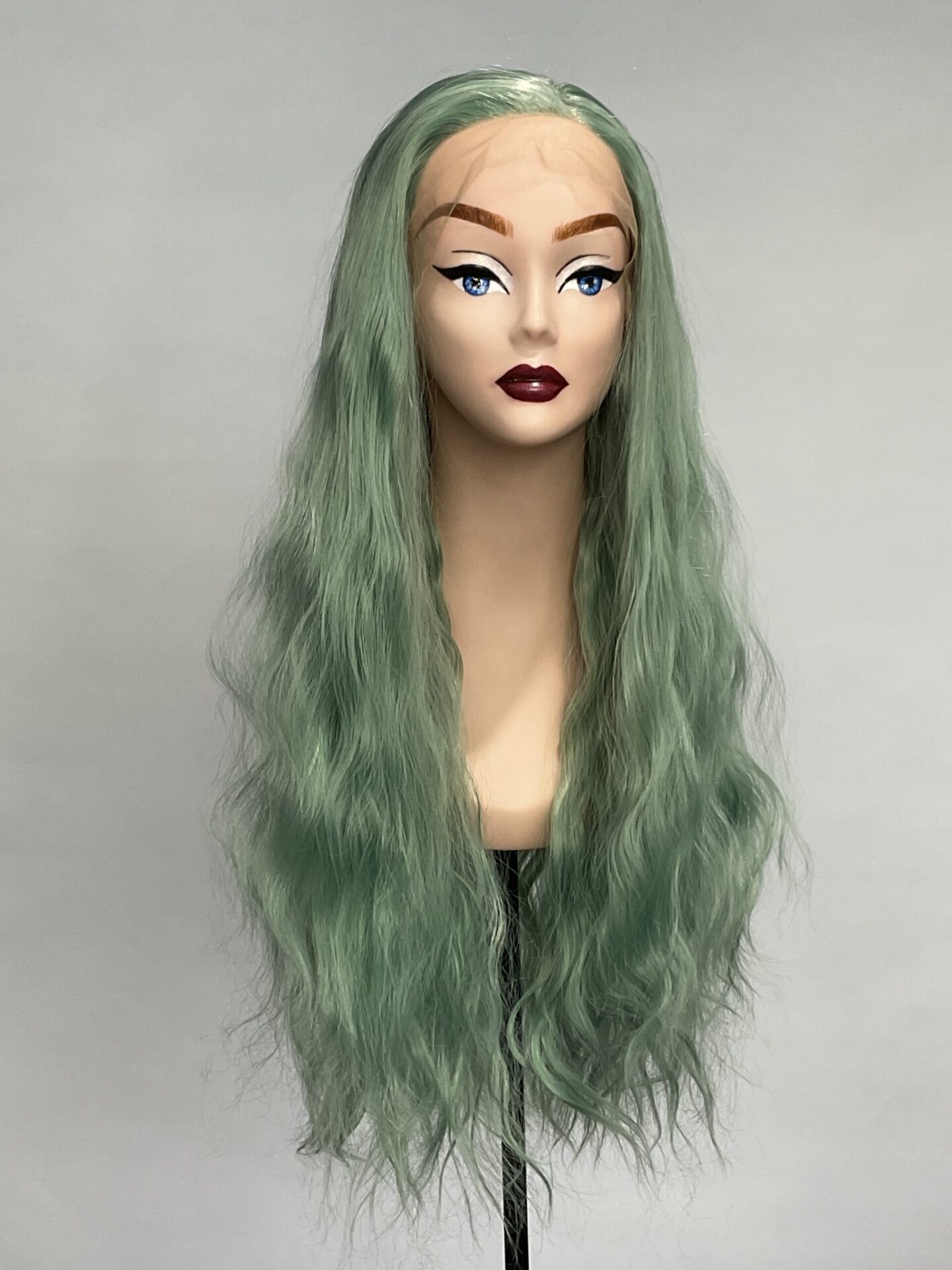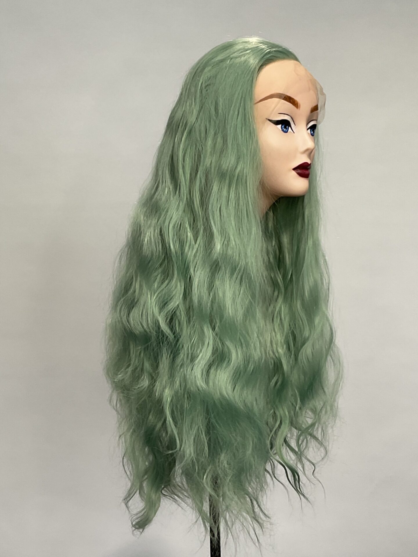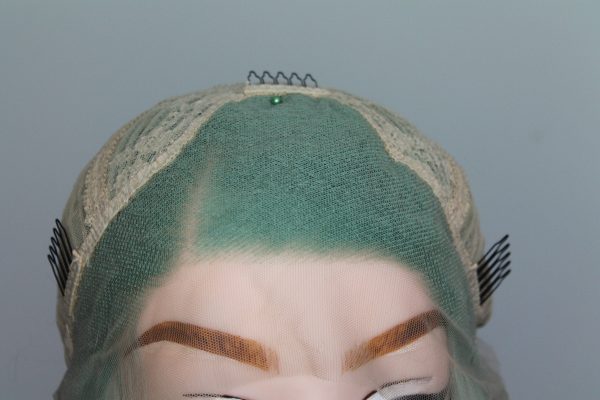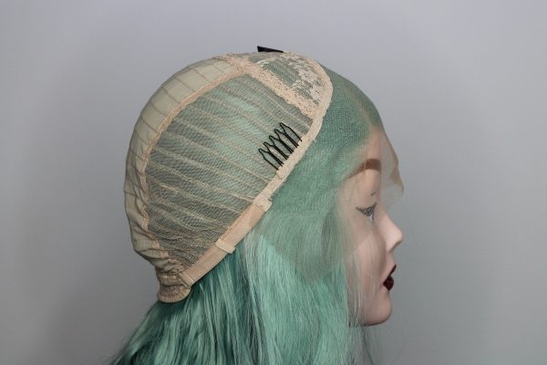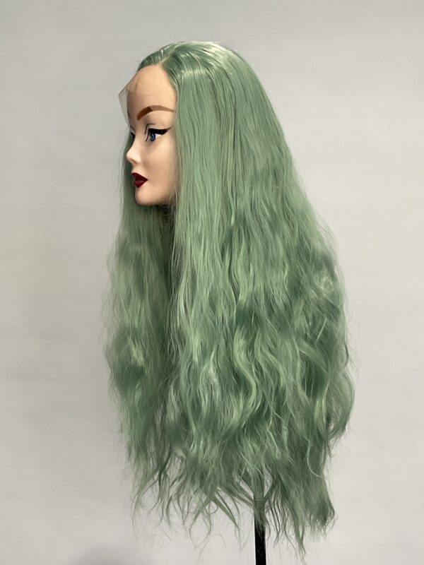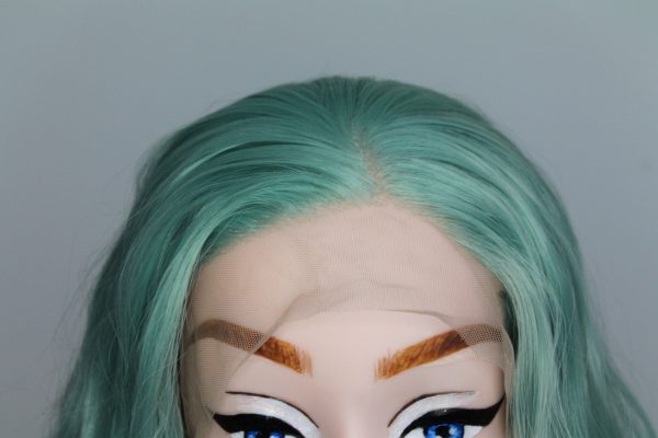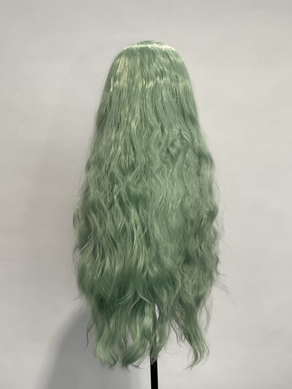 This is Mint. She is 24 inches long with an irregular curl like it has been braided, half hand tied lace front wig with 2-2.5 inches parting space in a fresh mint colour. The lace is transparent, best suited for medium light to tanned skin but can be coloured with foundation. Configured to a slight side parting, but not necessarily. 180% density.