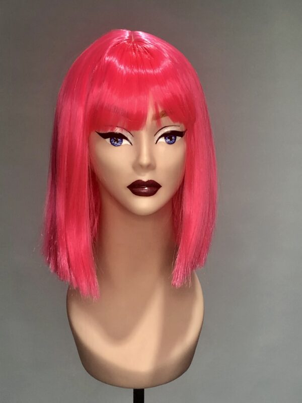 This is Pinky Pastel. She is a stylish and simple bob wig, just below the ear, with a fringe or bangs. Super cute, pretty much shake-n-go!