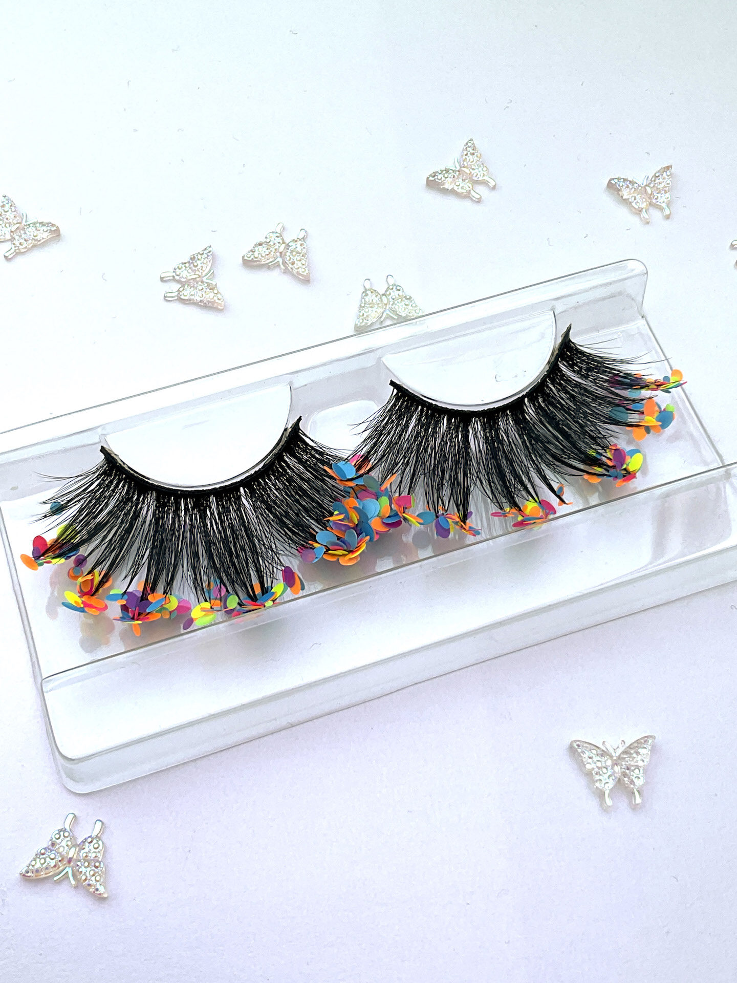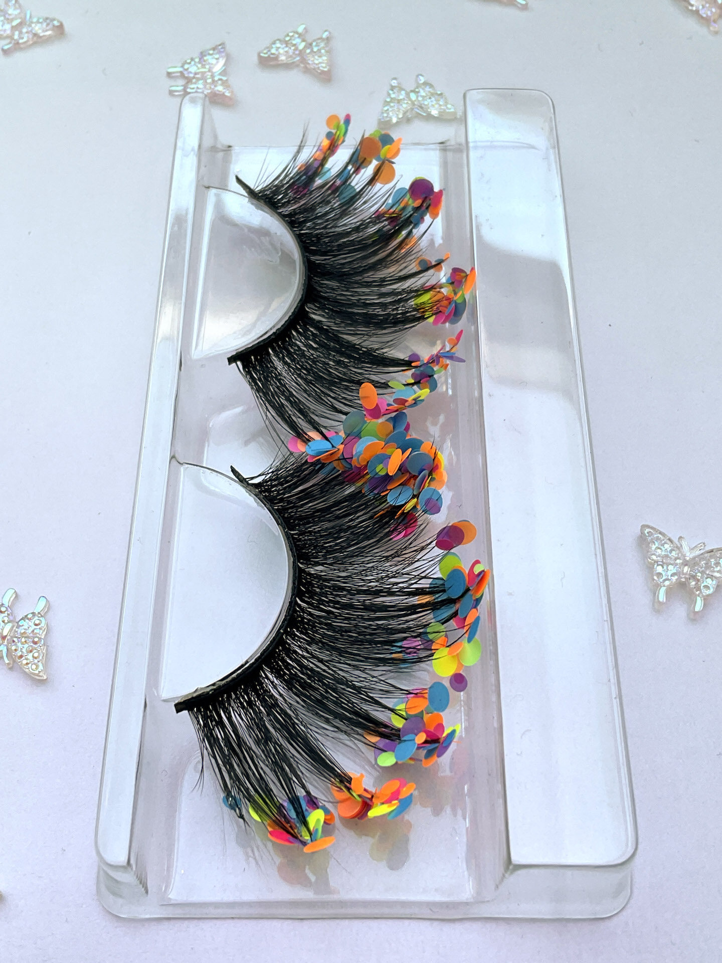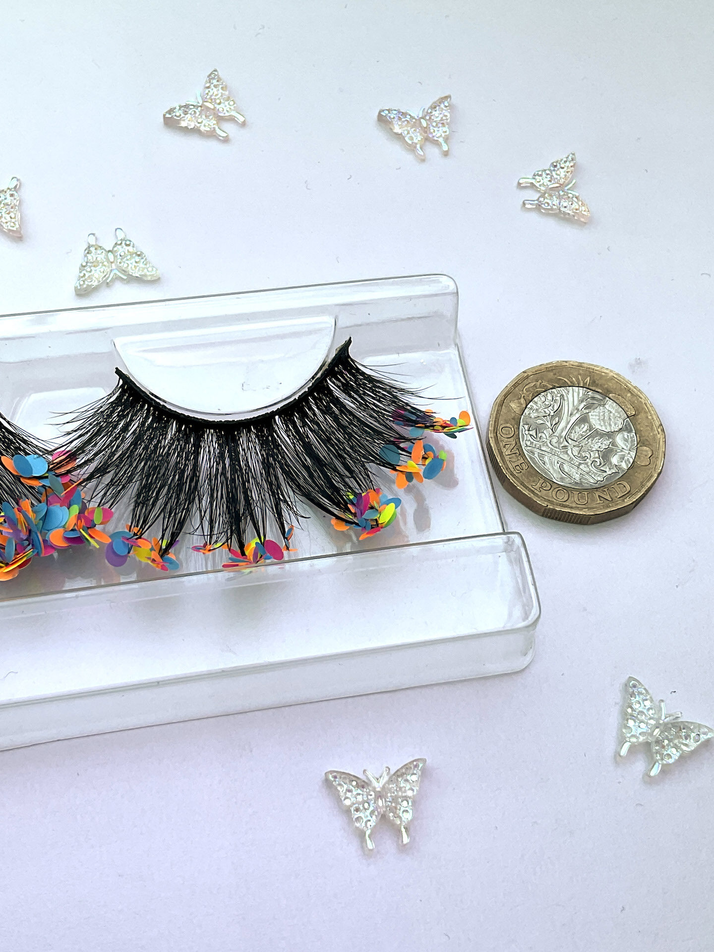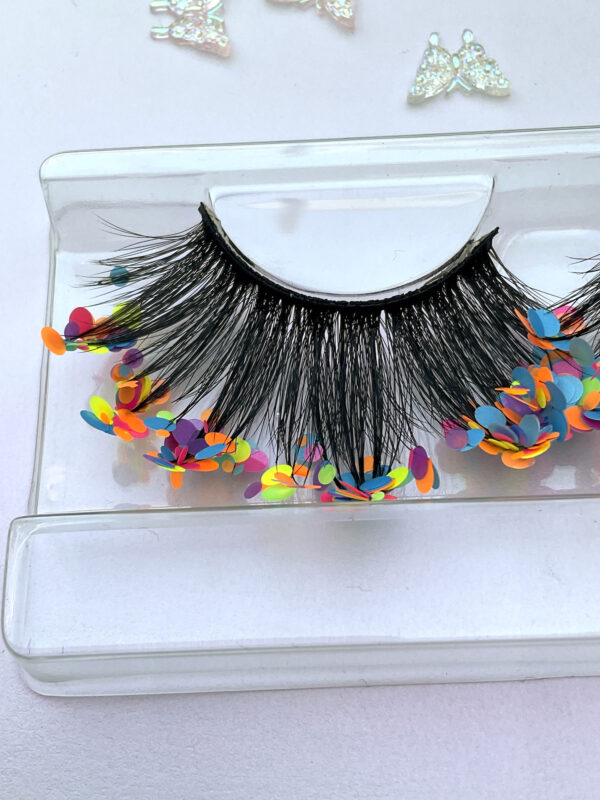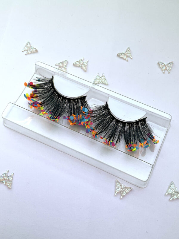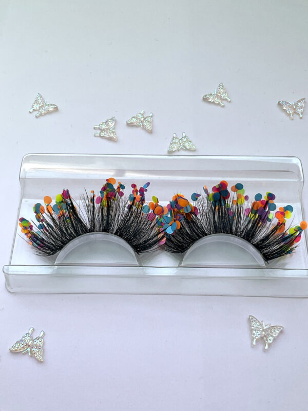 She is one pair of fabulous 20-25mm jumbo false eyelashes, in black with a generous coating of mixed chunky matte pastel glitter.