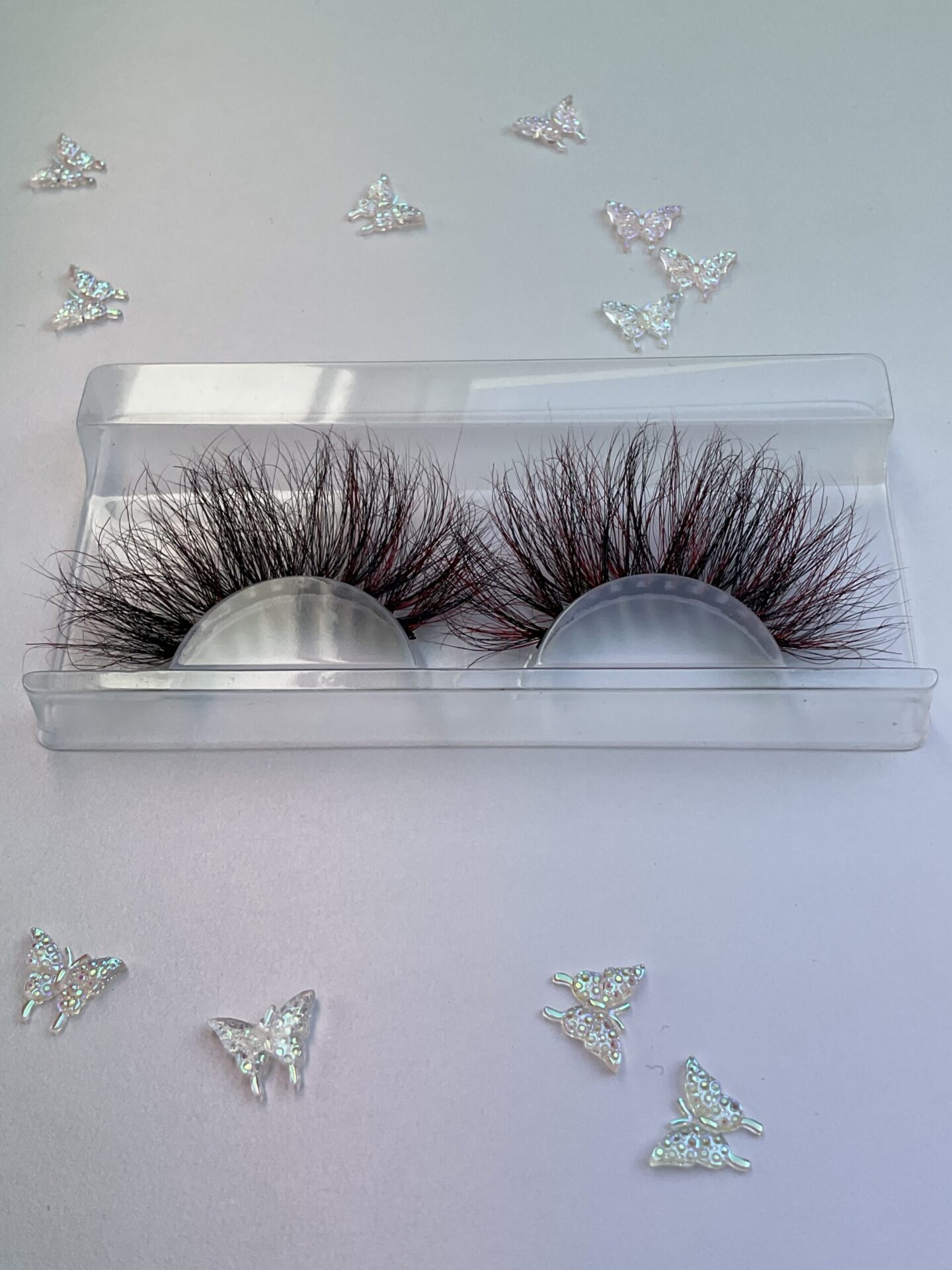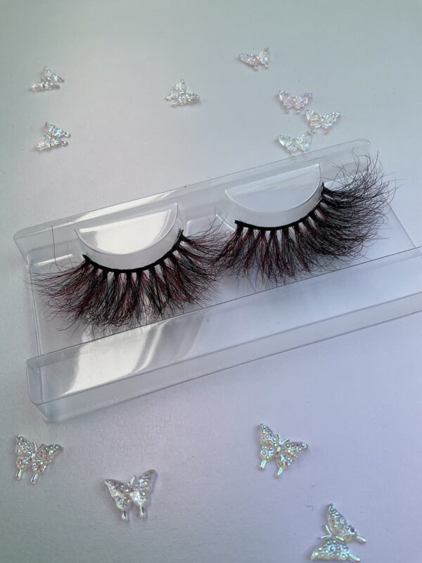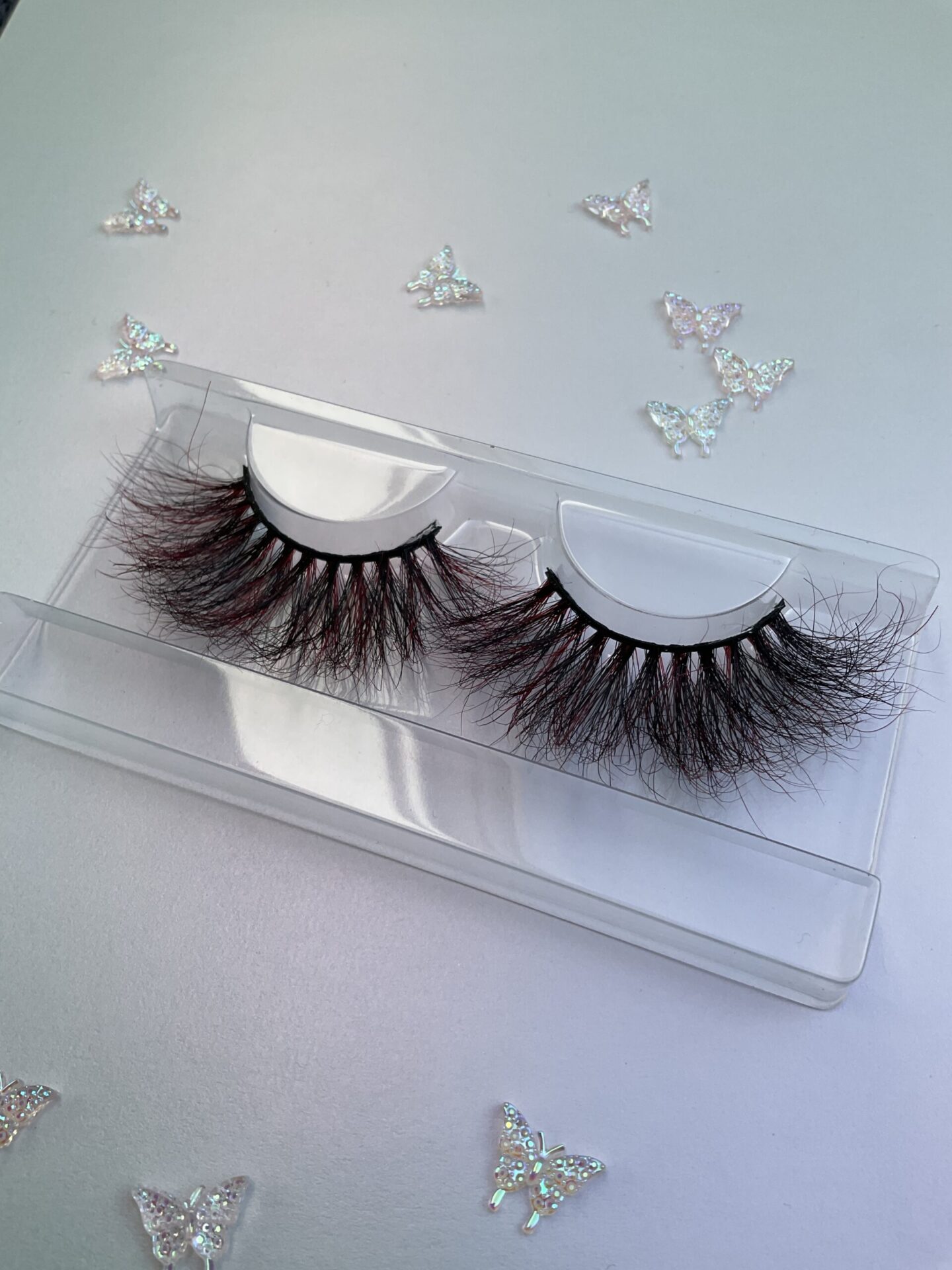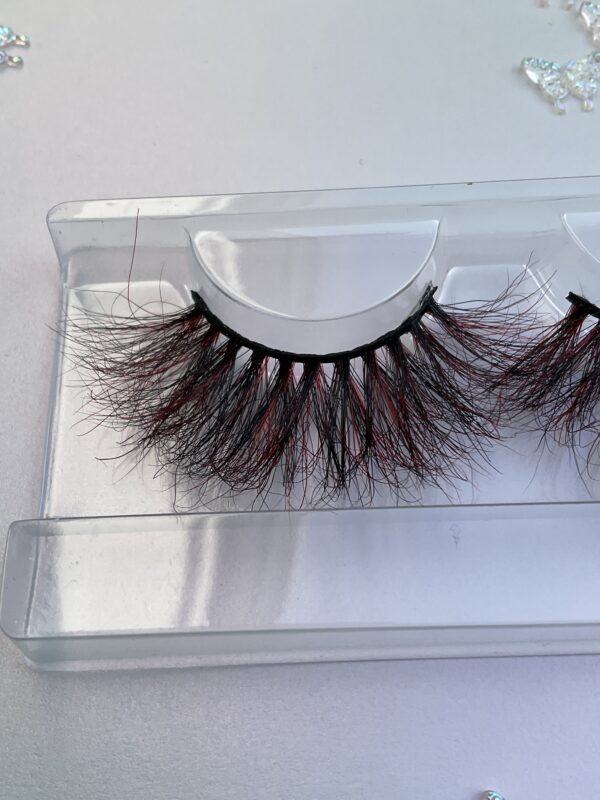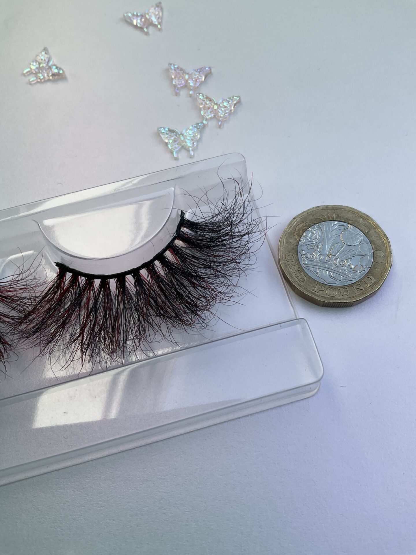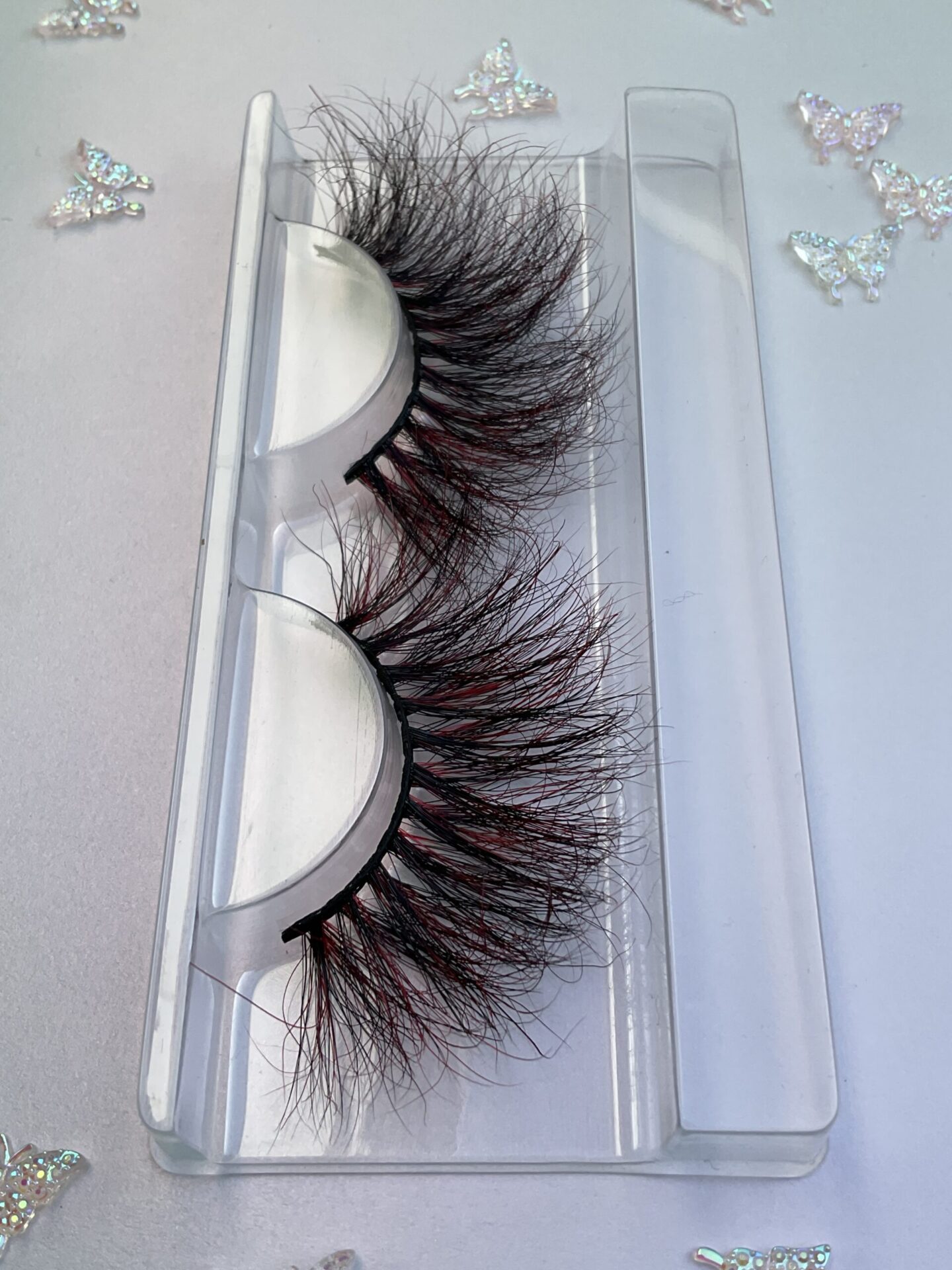 These are one pair of 25mm false eyelashes, in black and red. Synthetic hair, hand tied onto a black lash band.