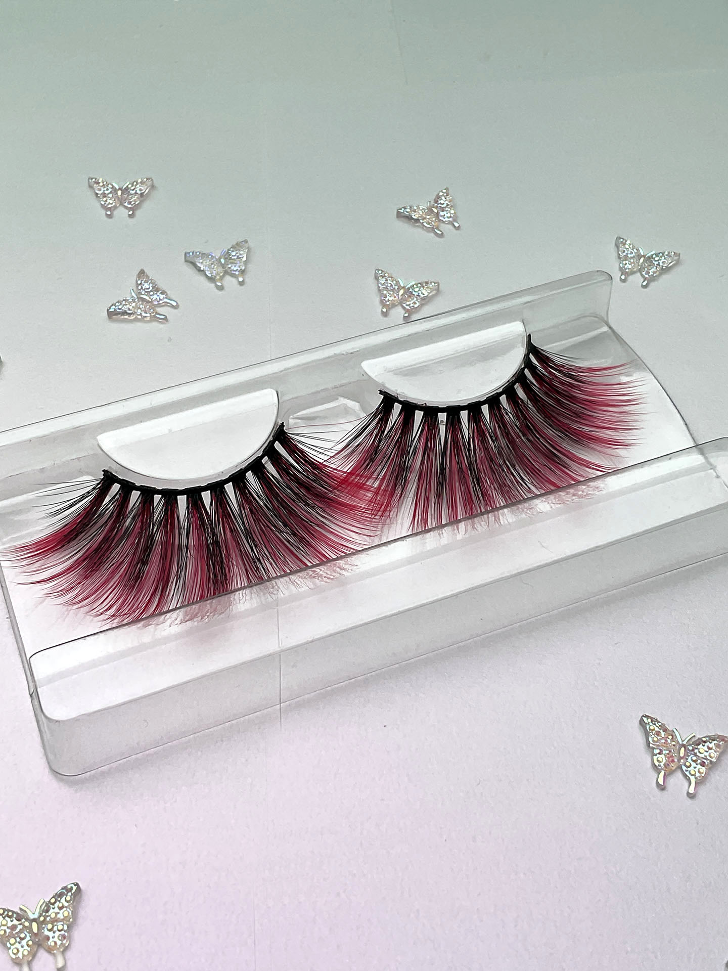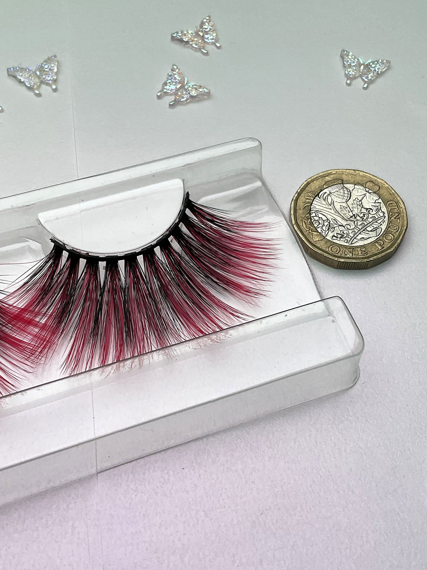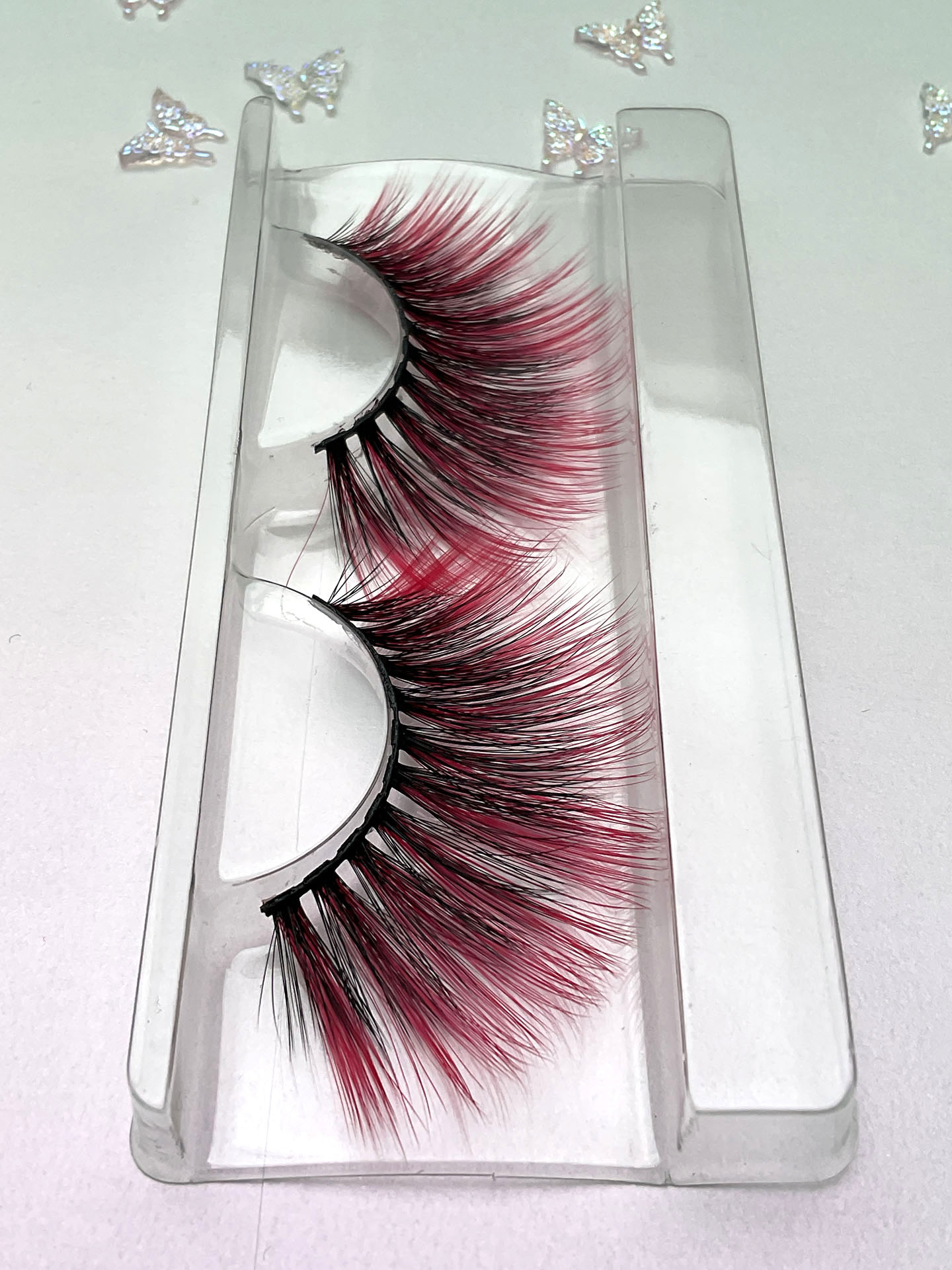 This is Russell. She is one pair of fabulous jumbo false eyelashes, in black with red tips.