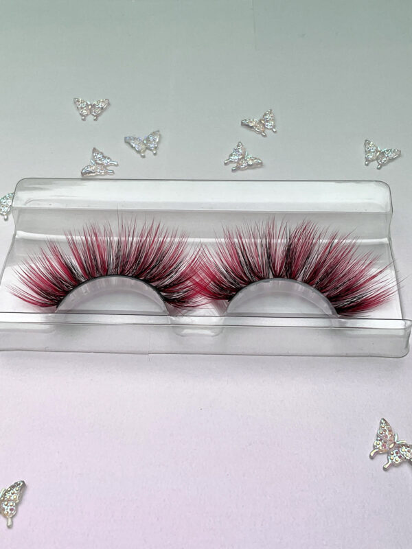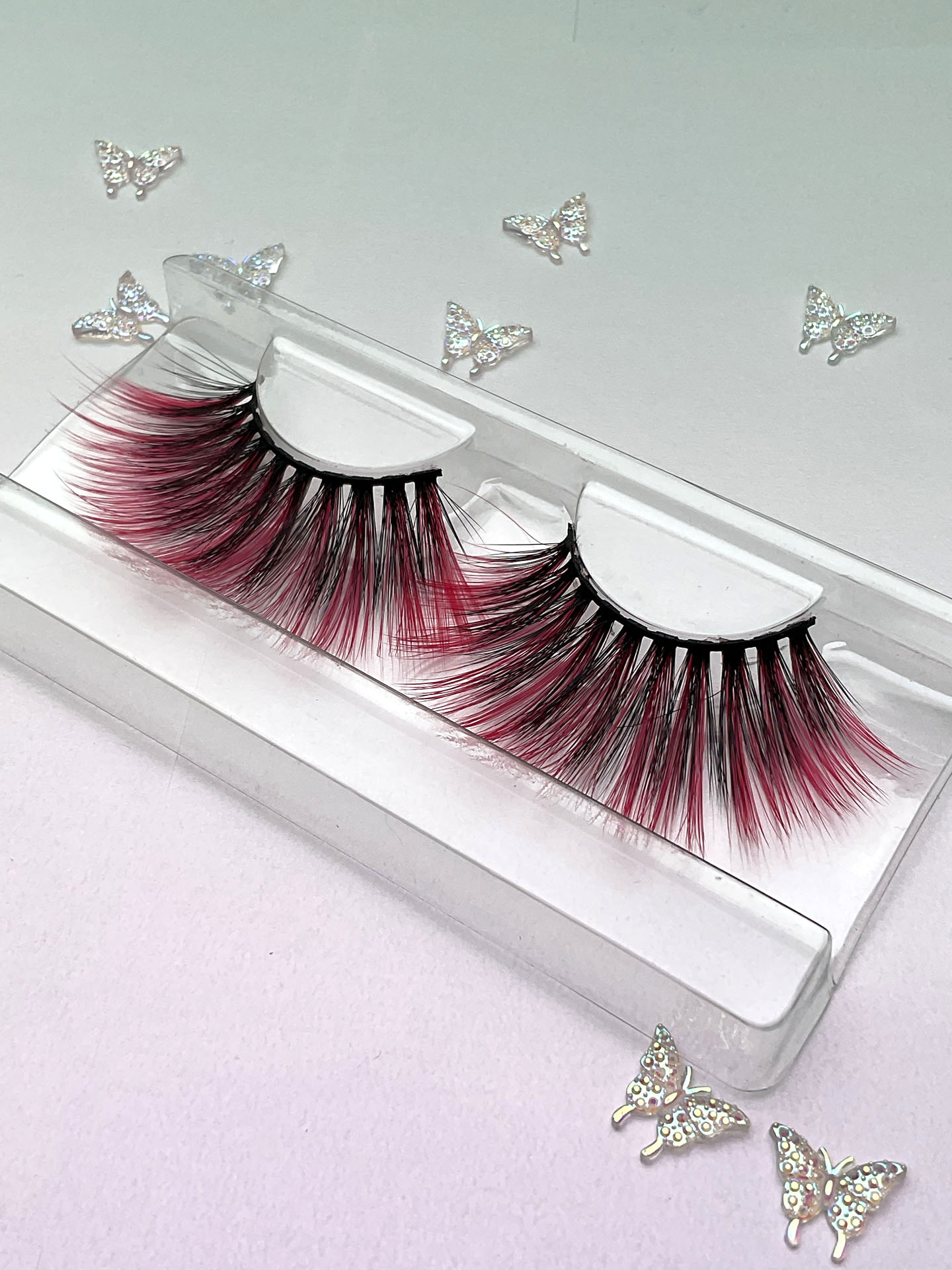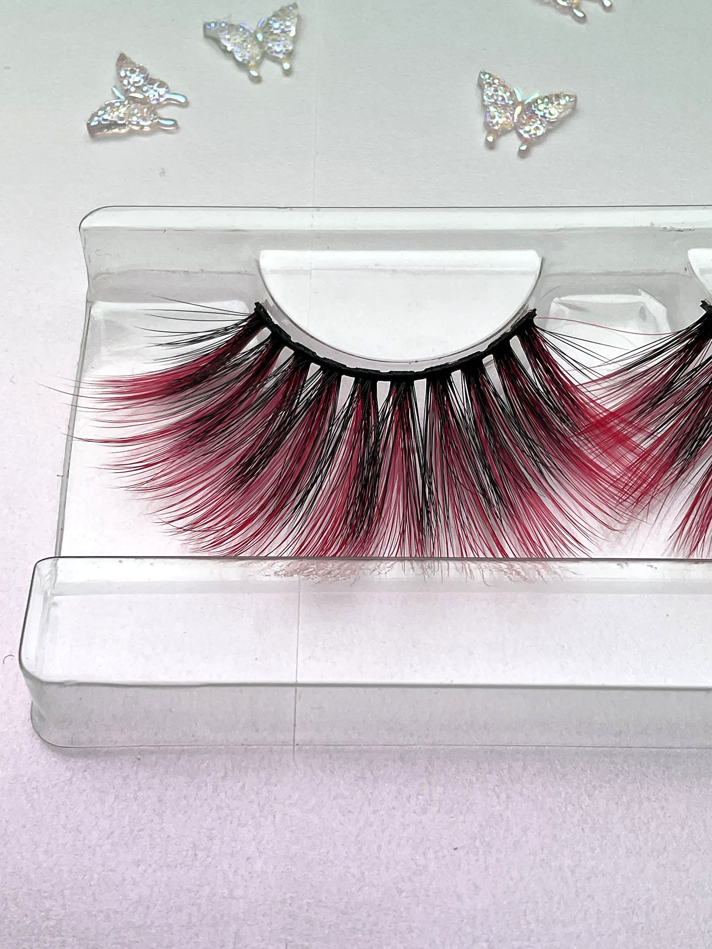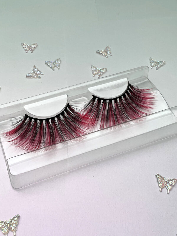 This is Russell. She is one pair of fabulous jumbo false eyelashes, in black with red tips.