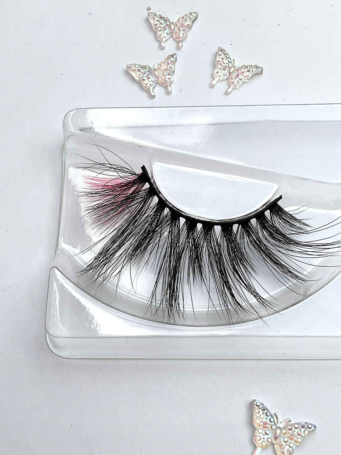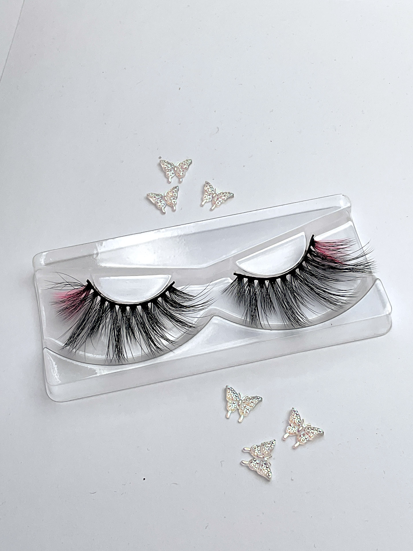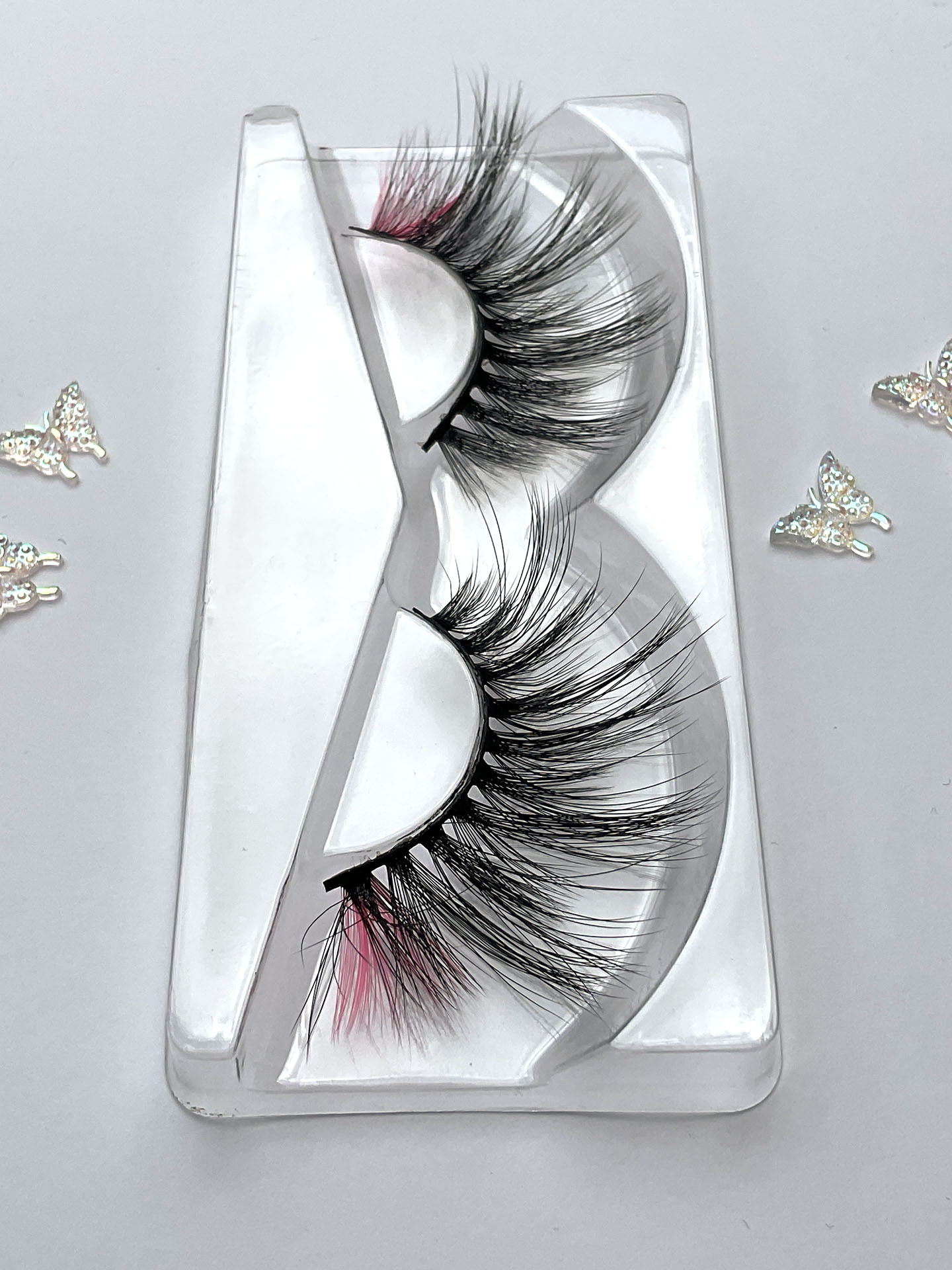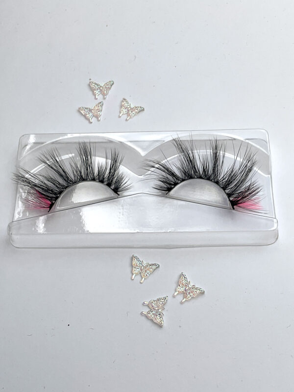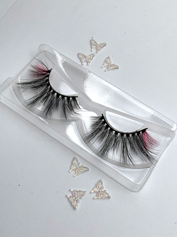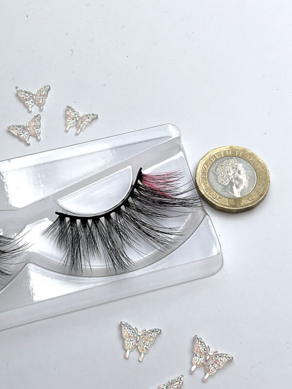 This is Sia. She is one pair of fabulous long, delicate and wispy 15-20mm false eyelashes, in black with a neon pink wing, the lash hairs positioned in a V-formation.