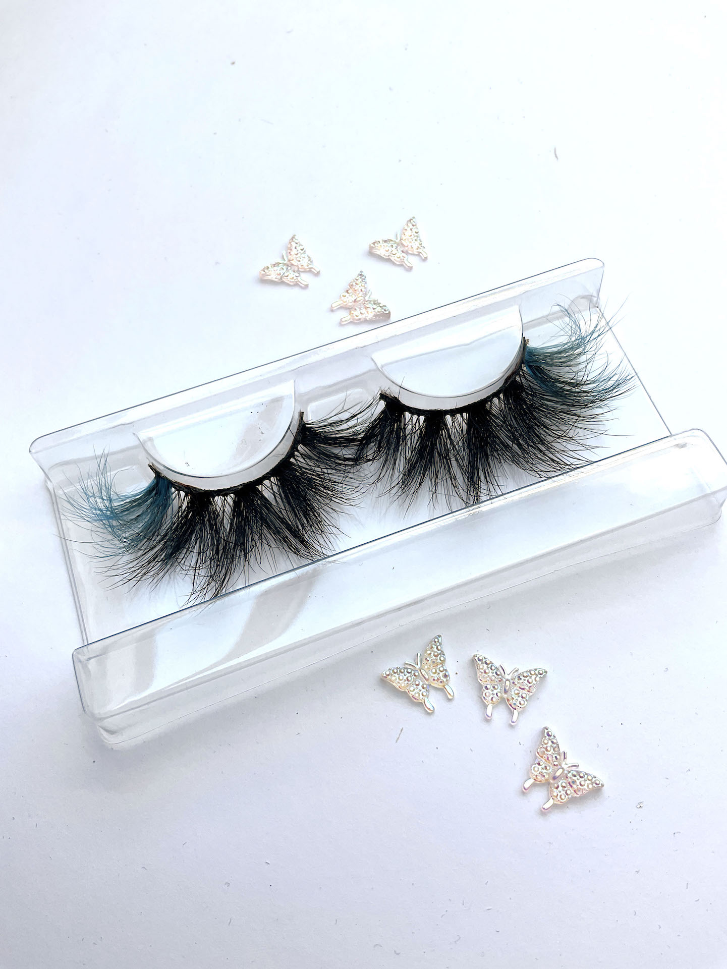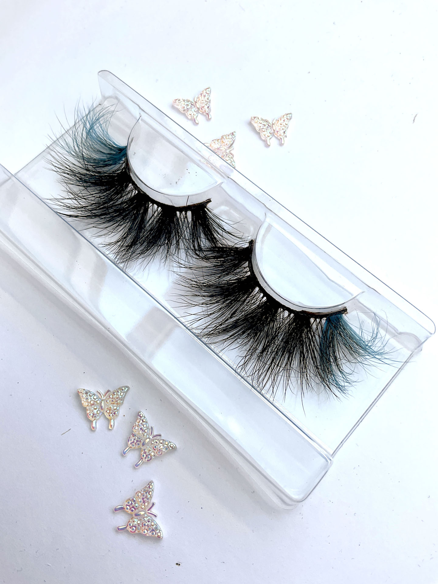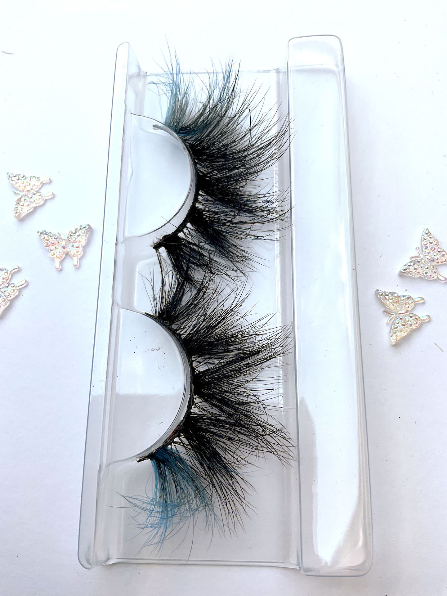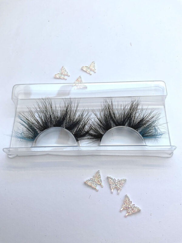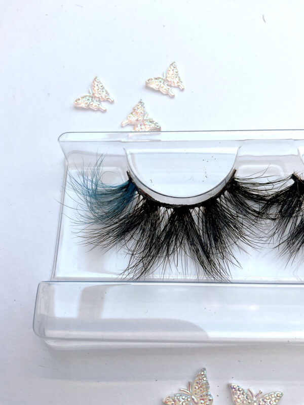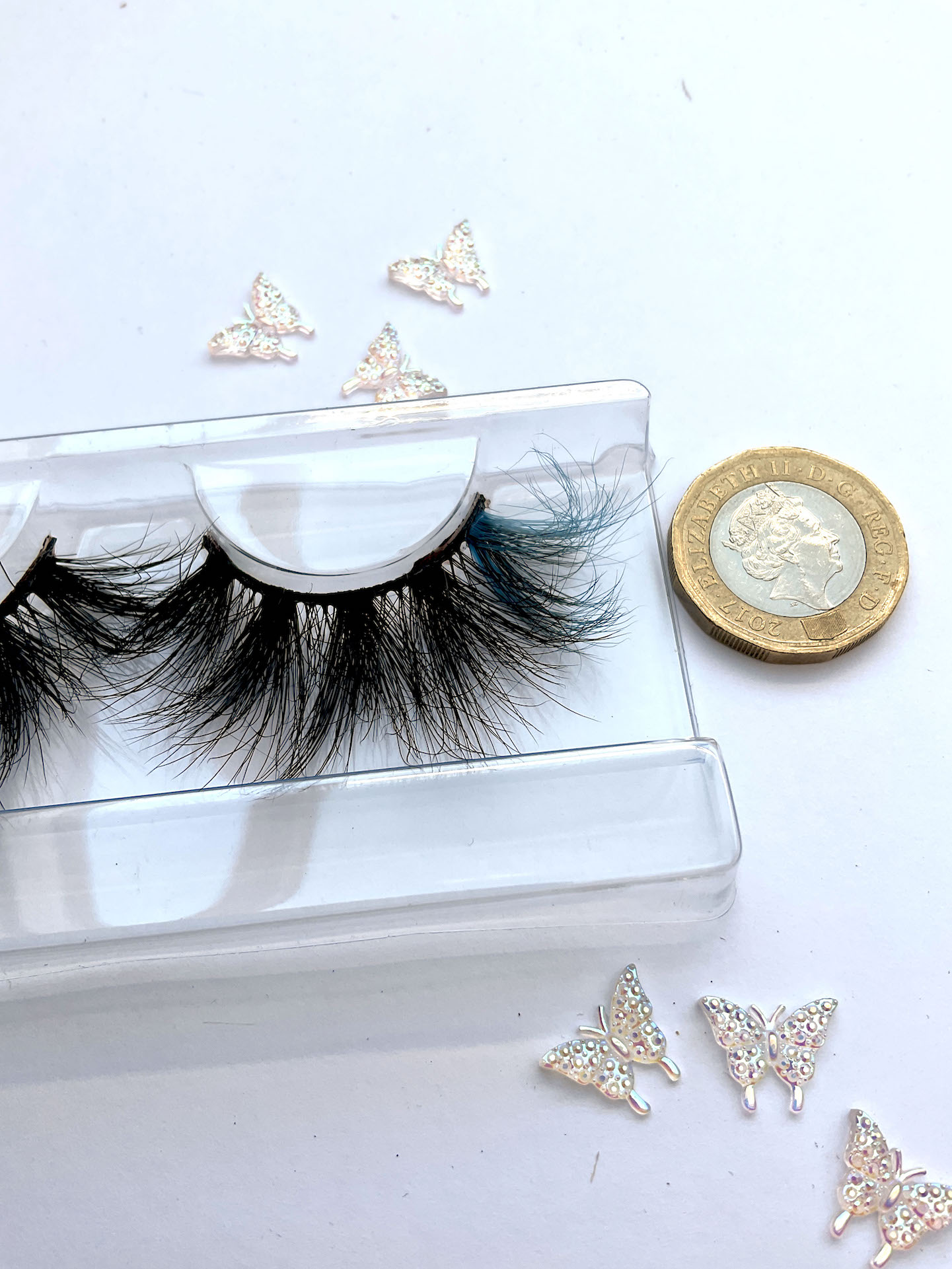 This is Skylar. She is one pair of fabulous 20-25mm false eyelashes, in black with a bright blue wing, the lash hairs make a fbushy an shape.