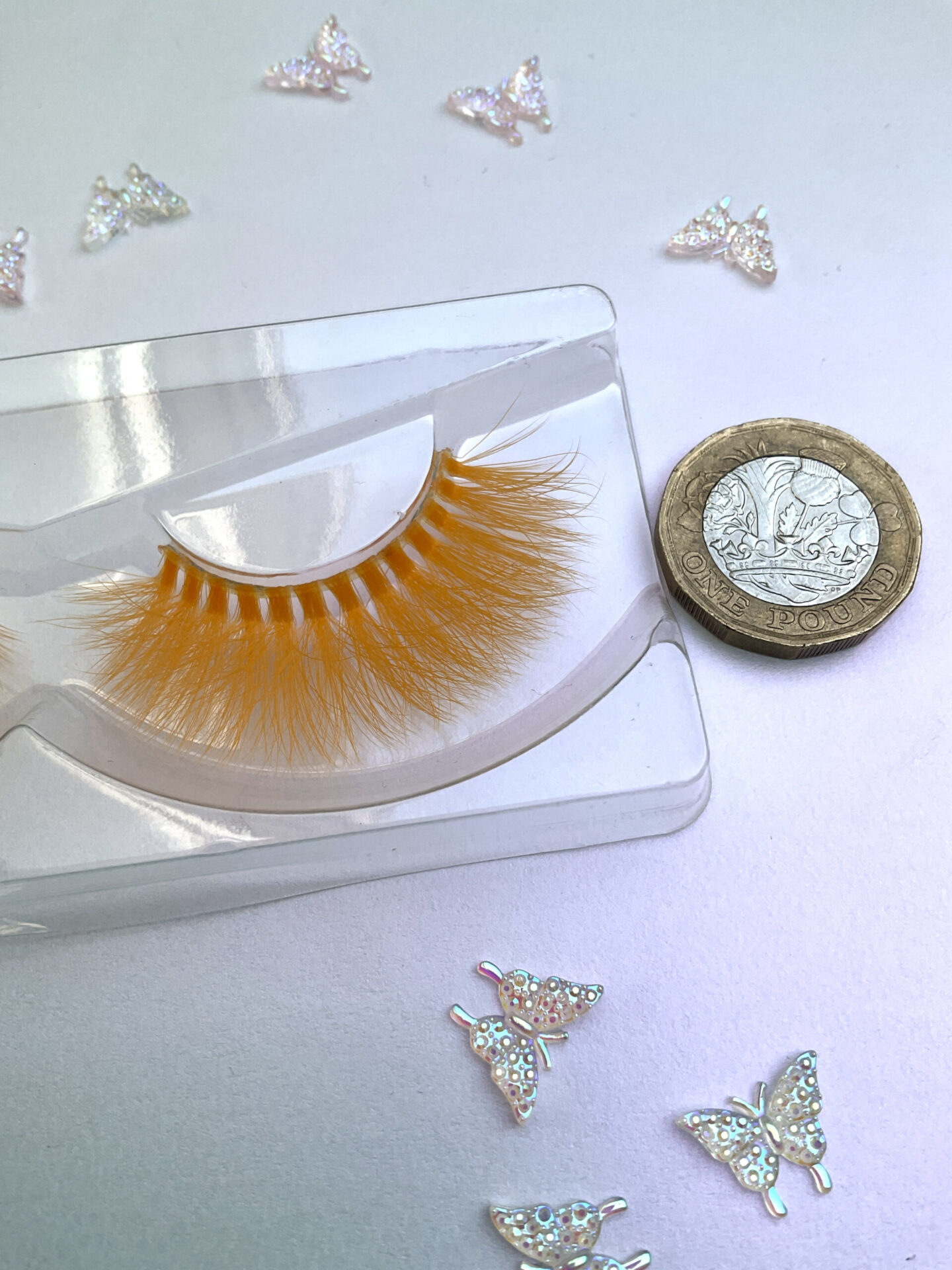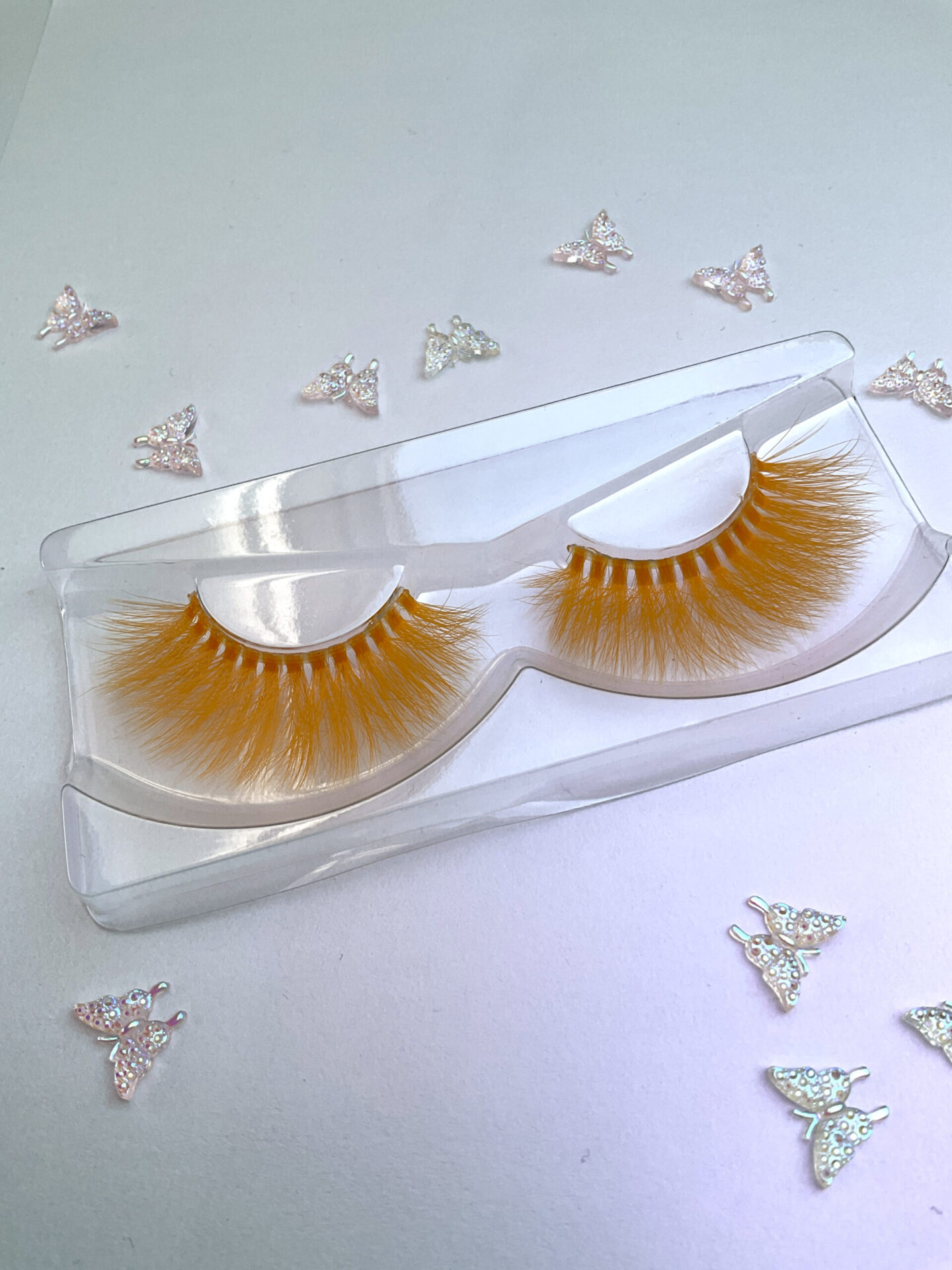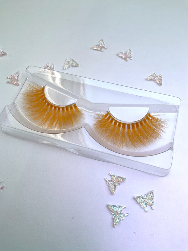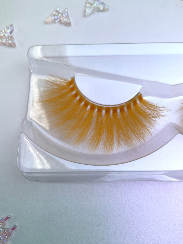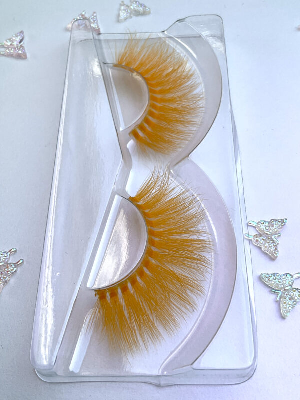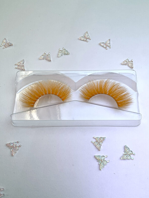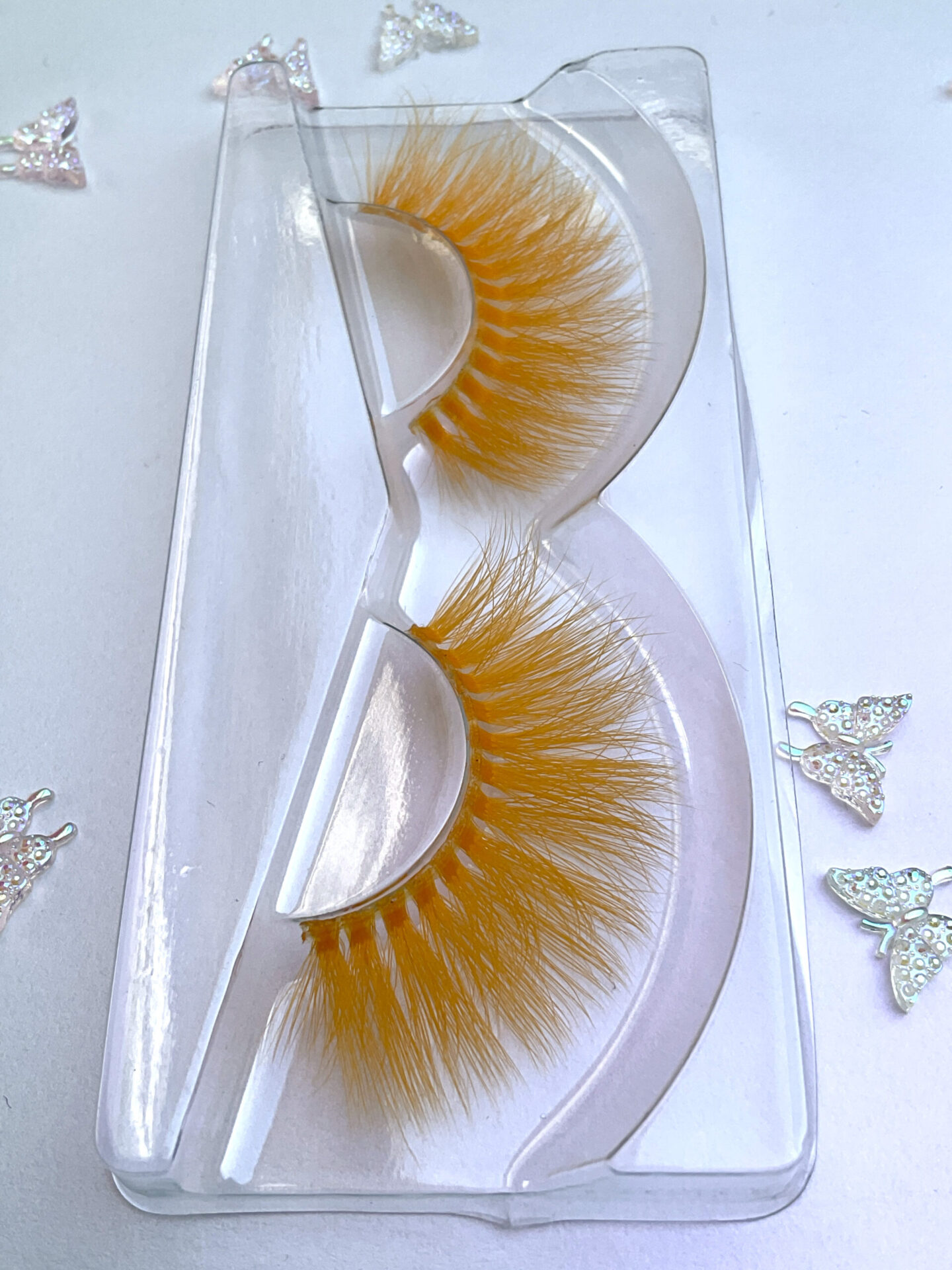 This is the Soleil in fresh solid yellow orange. She is a cute full set of lashes that could be worn alone.