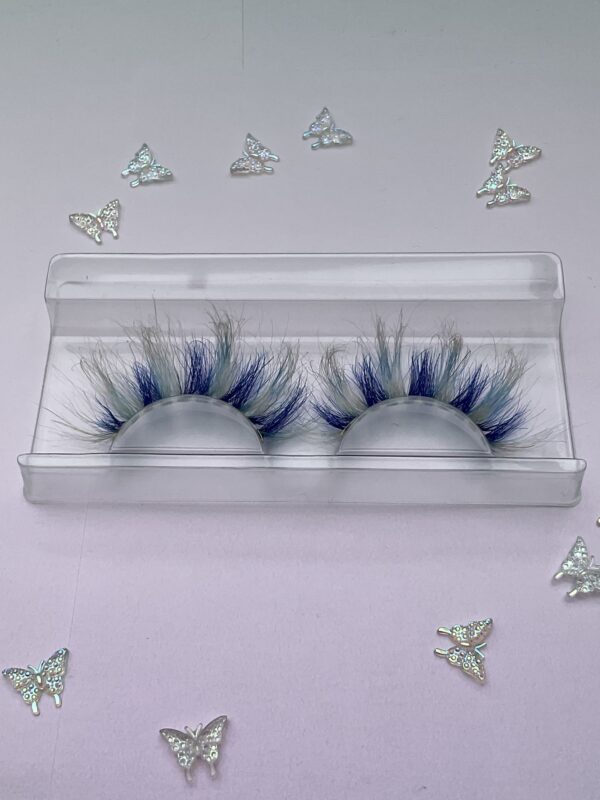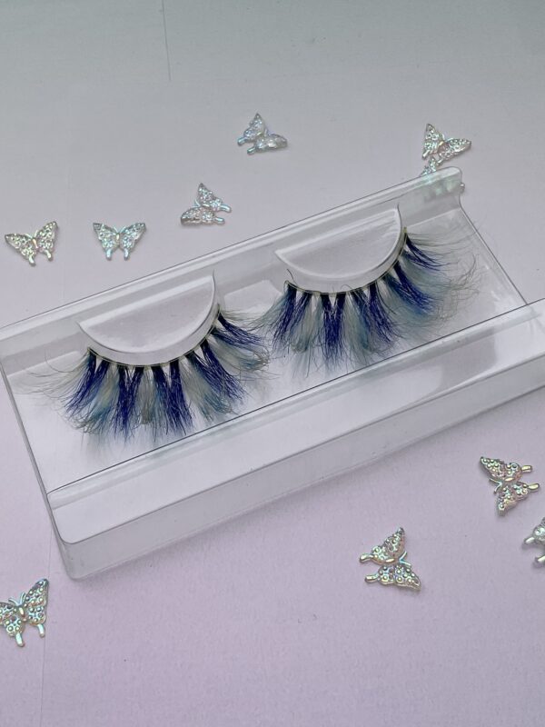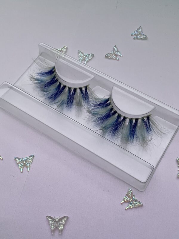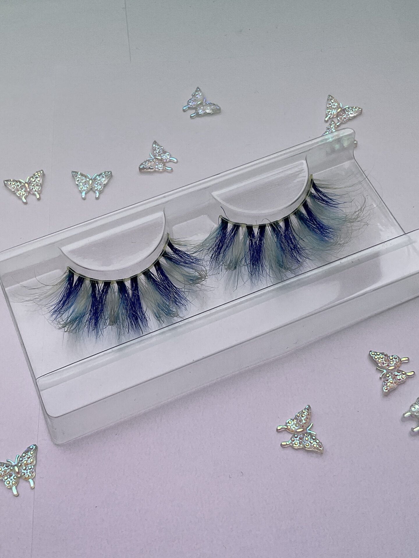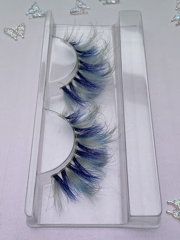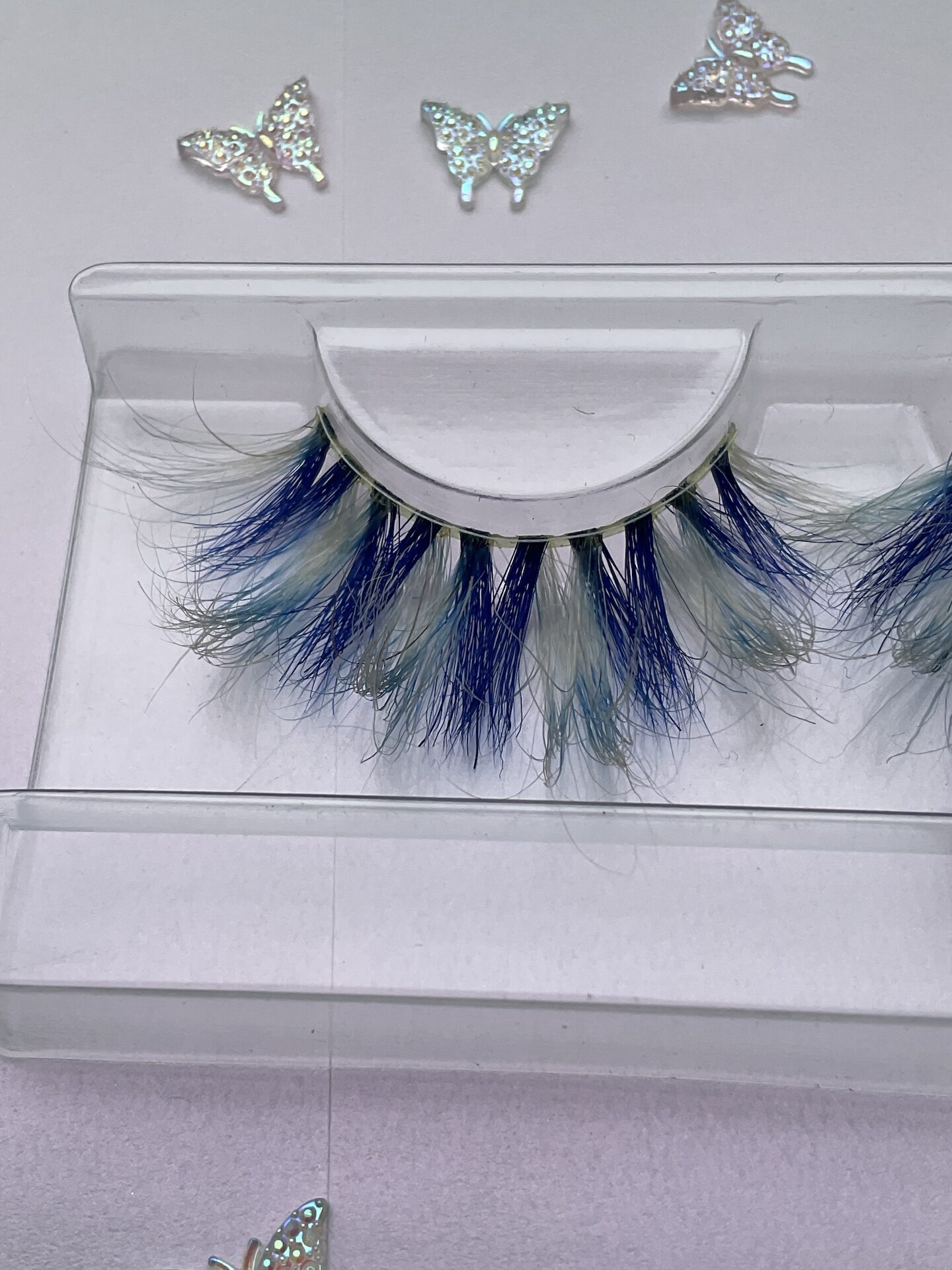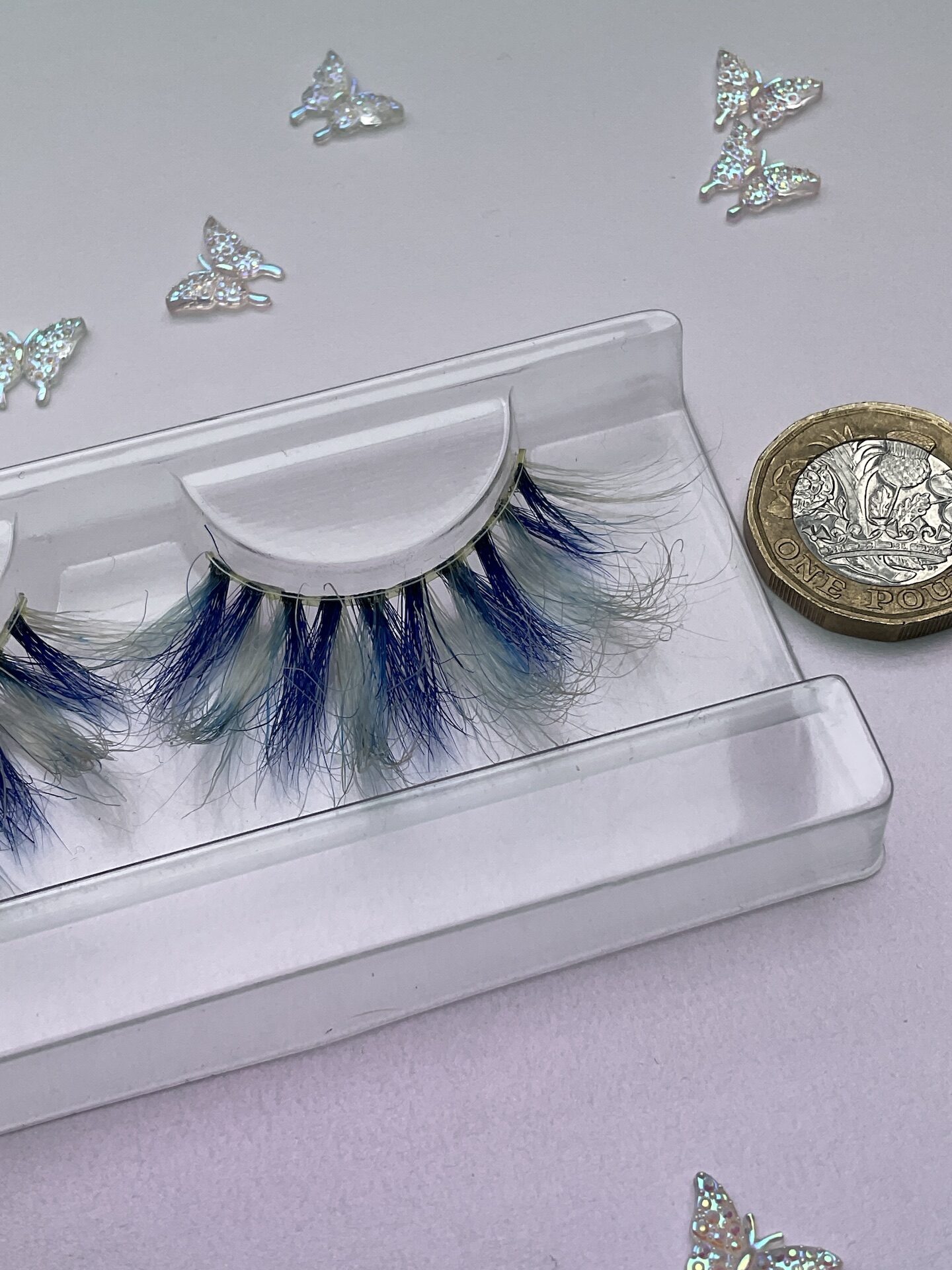 This is Sonia. She is one pair of fabulous jumbo 25mm false eyelashes, in light and dark blue with off white tips.