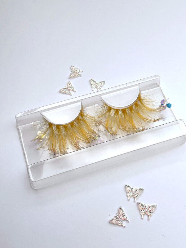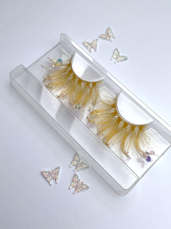 This is Sparkly Starfruit. She is a fun soft yellow lash in varying stripes that has been dipped in glue and coated in glitter. Really sparkly and colourful for a festive look.
